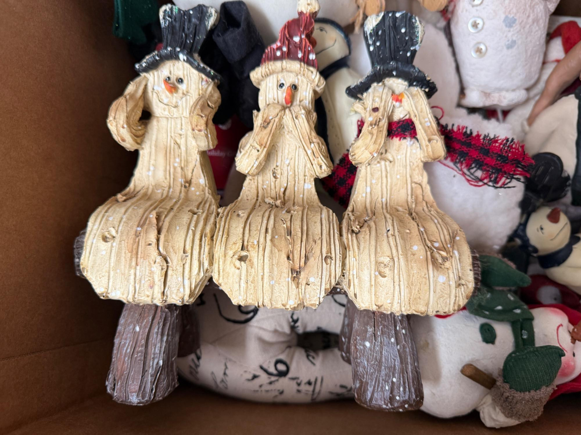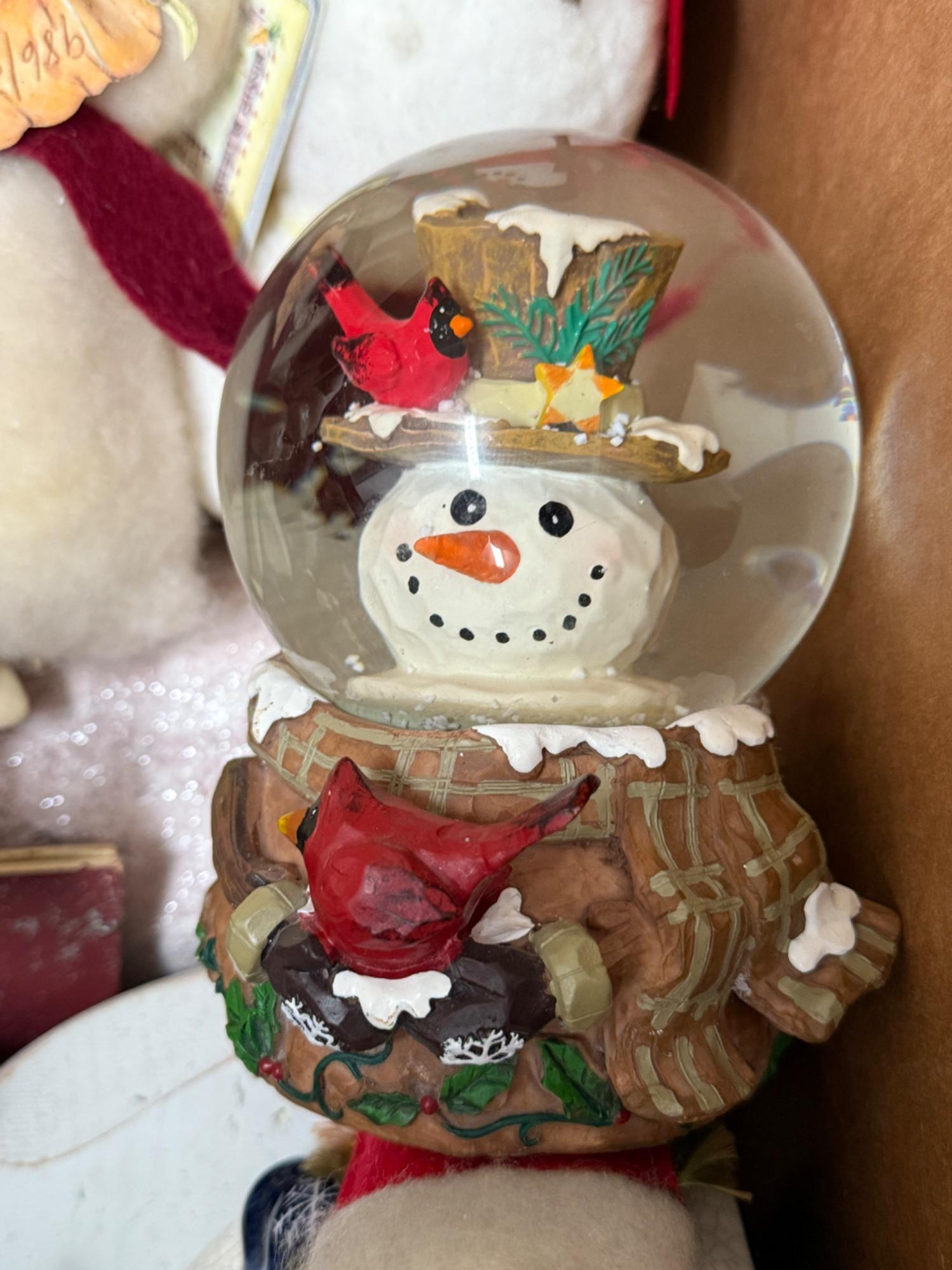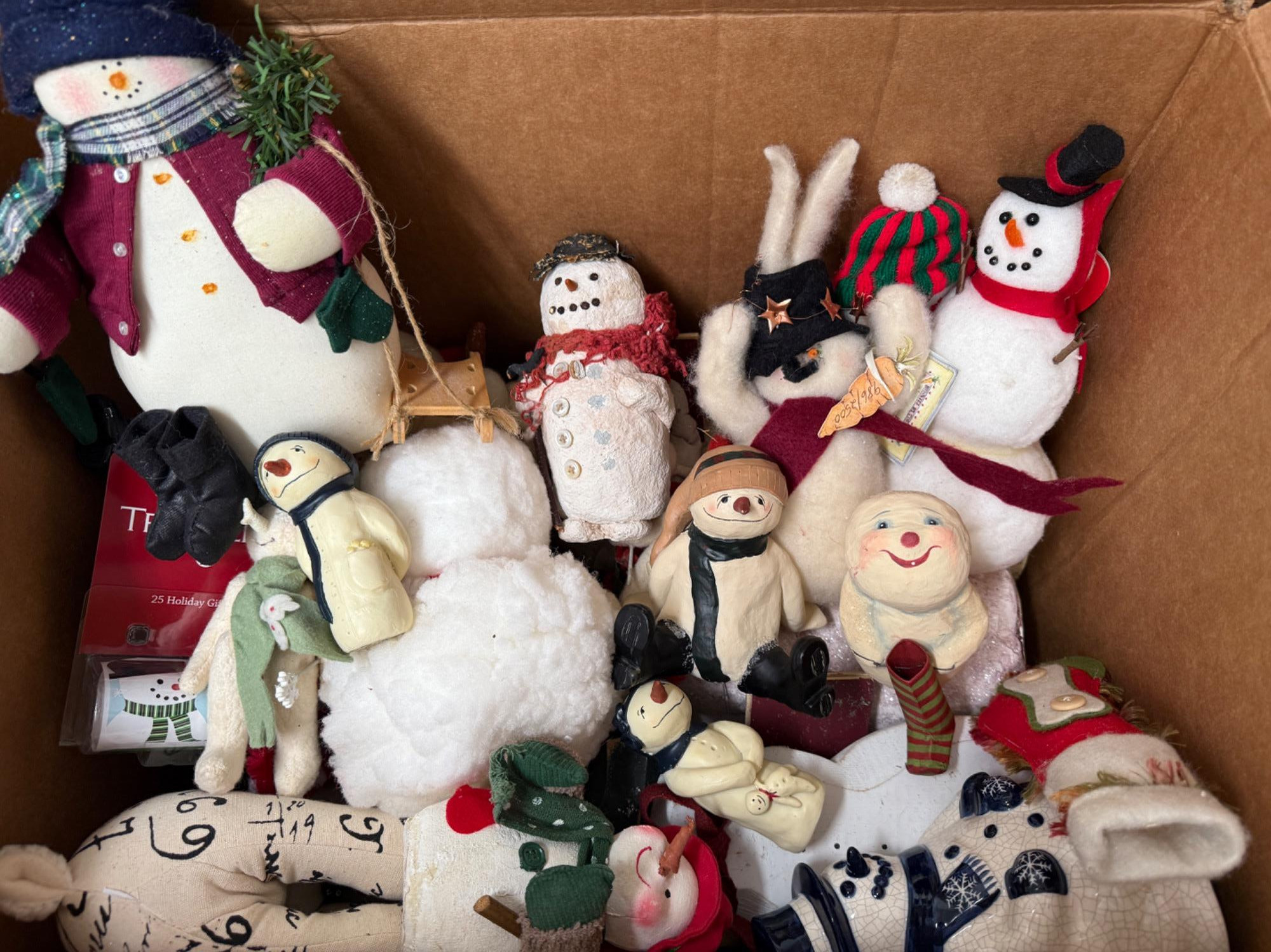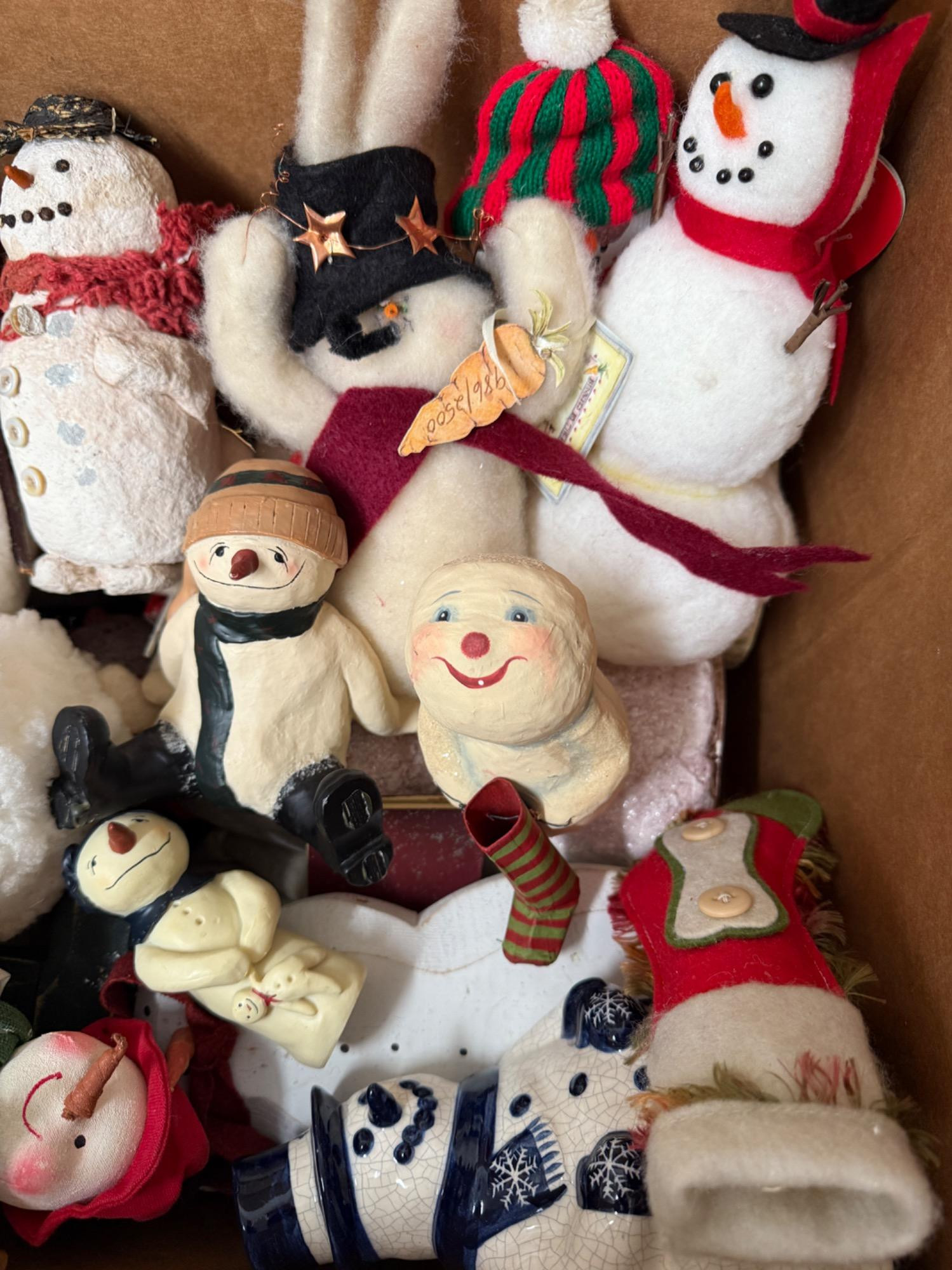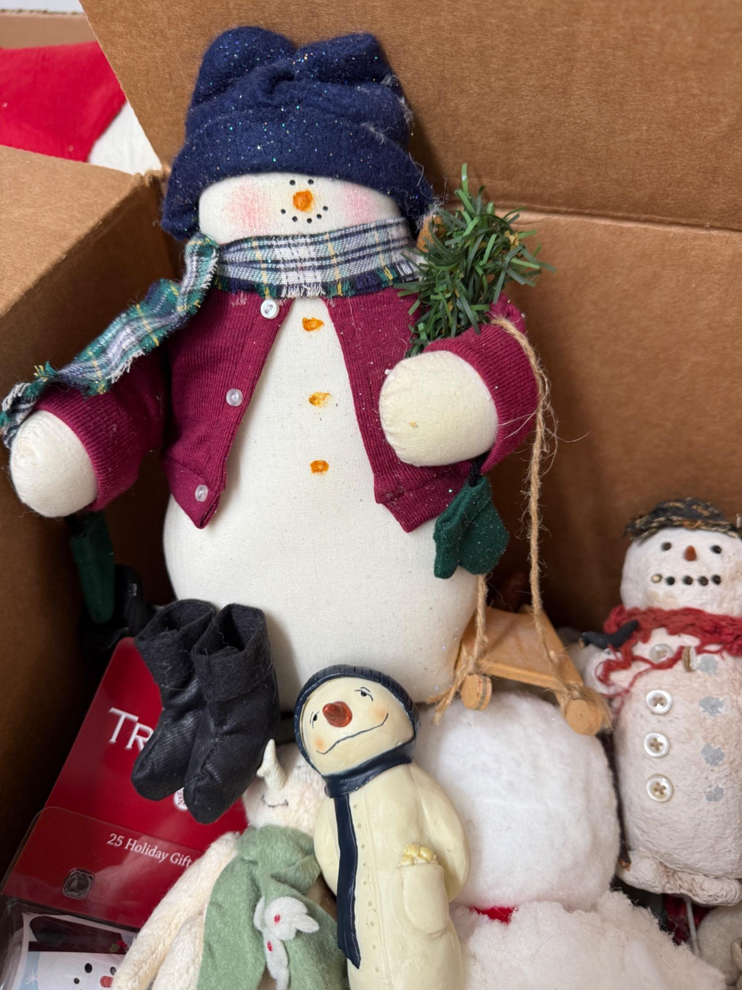 A large box of everything snowman related. Figurines, decopage, resin, wood, fabric. A lot of snow people in this box!