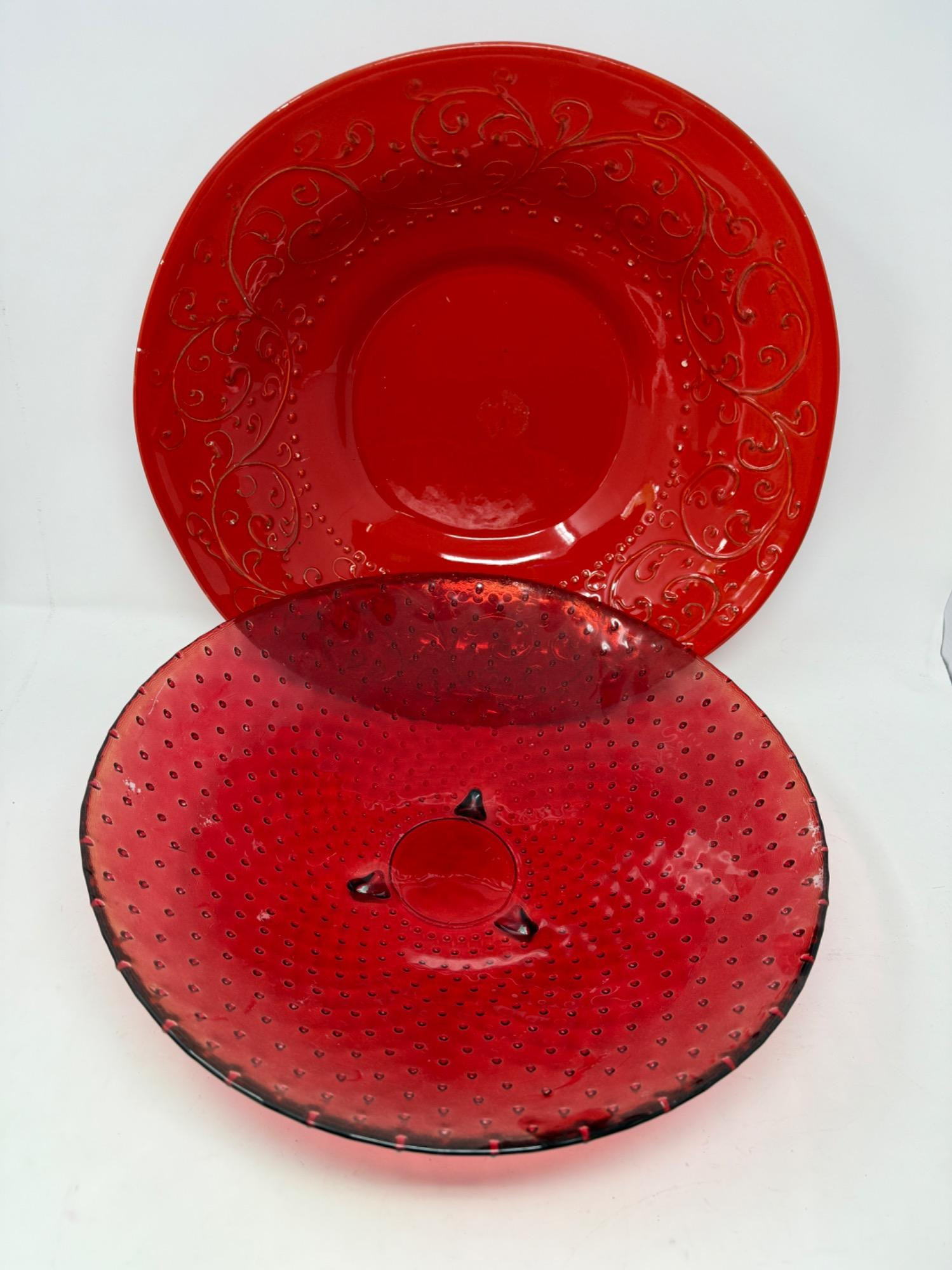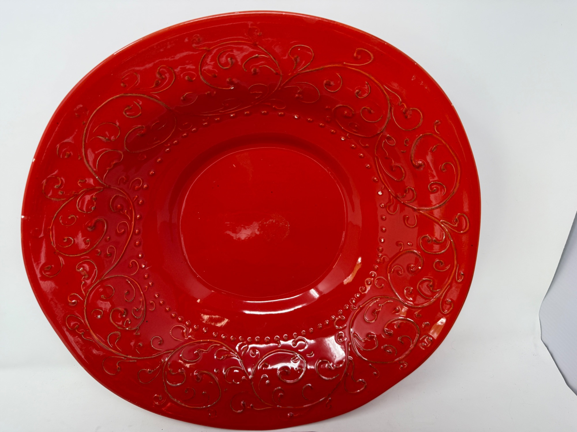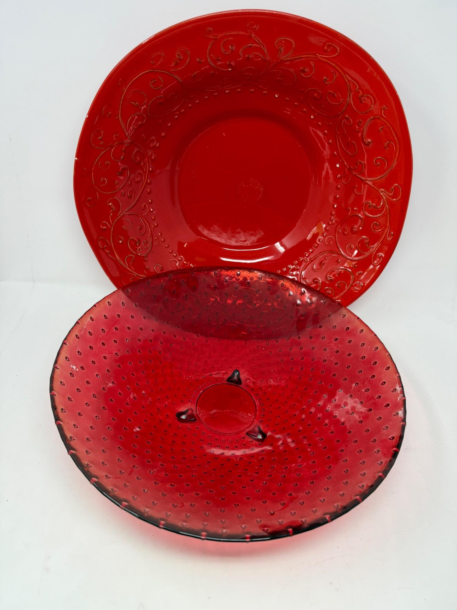 2 Centerpiece Bowls Solid ceramic bowl matches the red dinnerware found elsewhere in the auction. Measures 16” Footed polka dot bowl is 15”