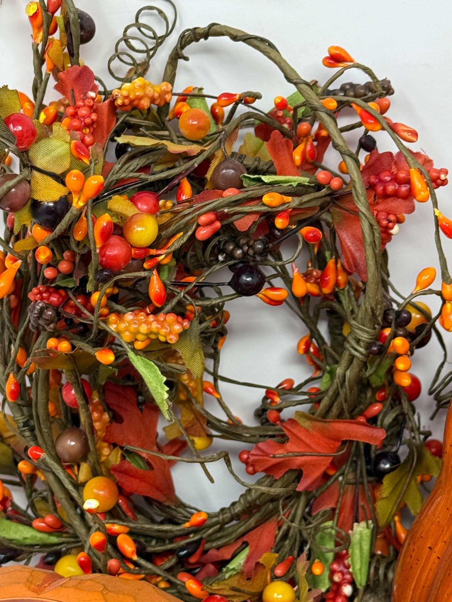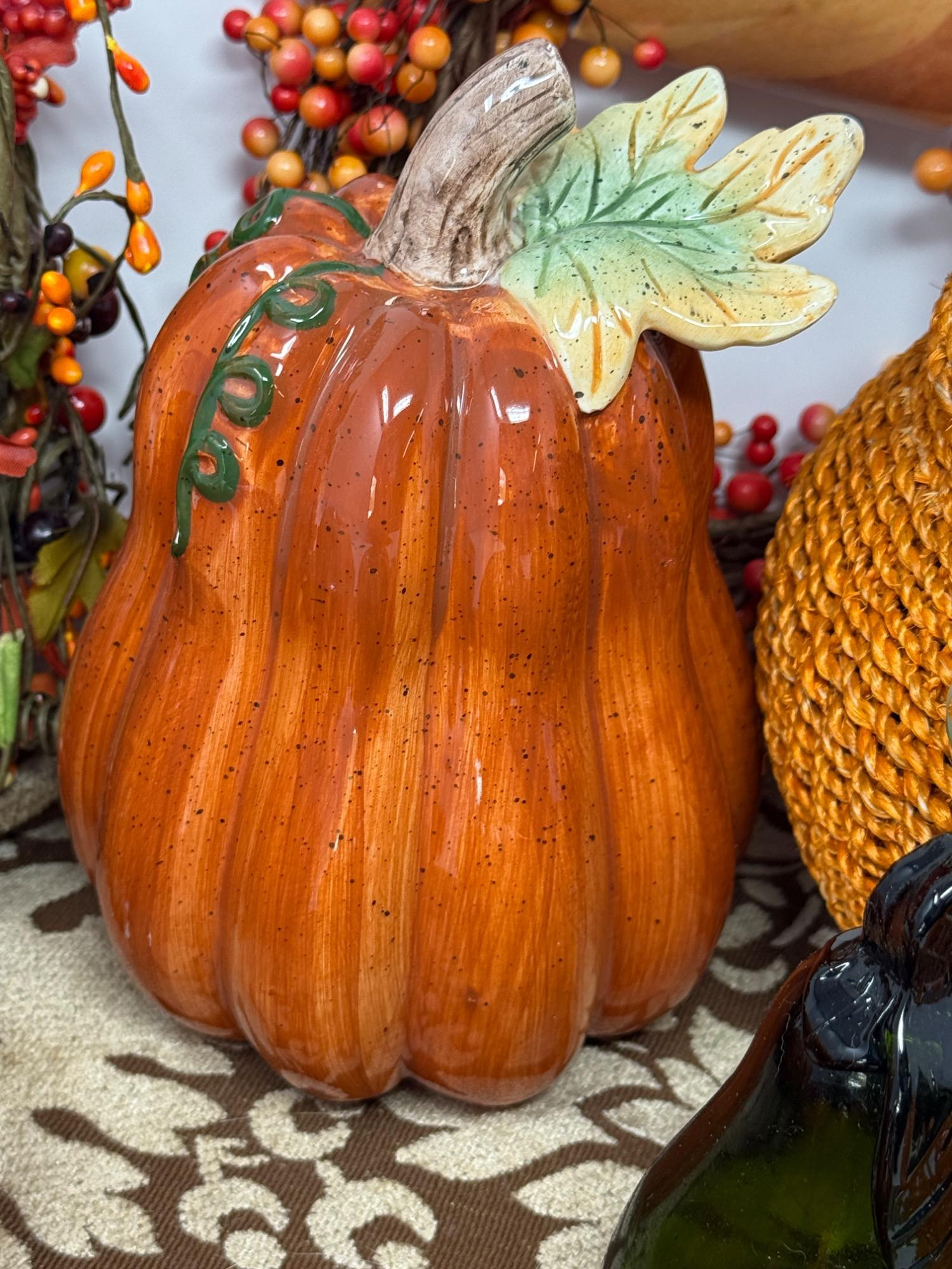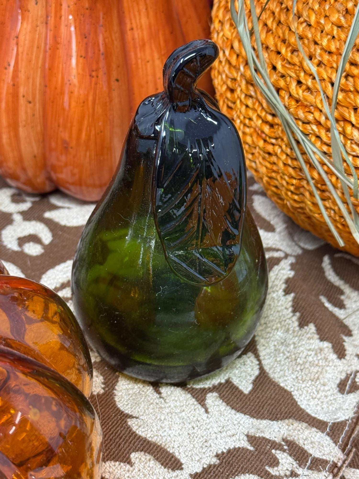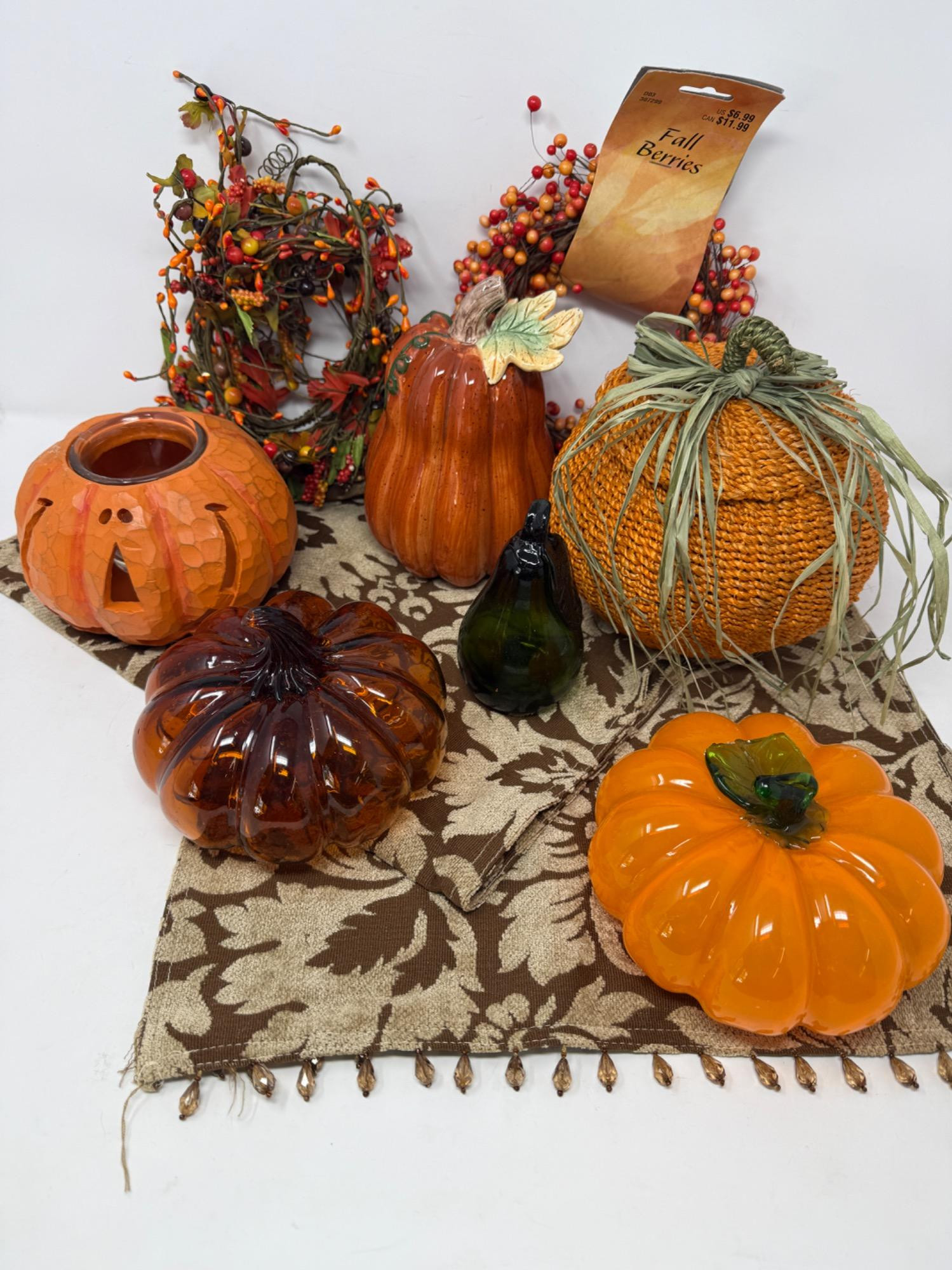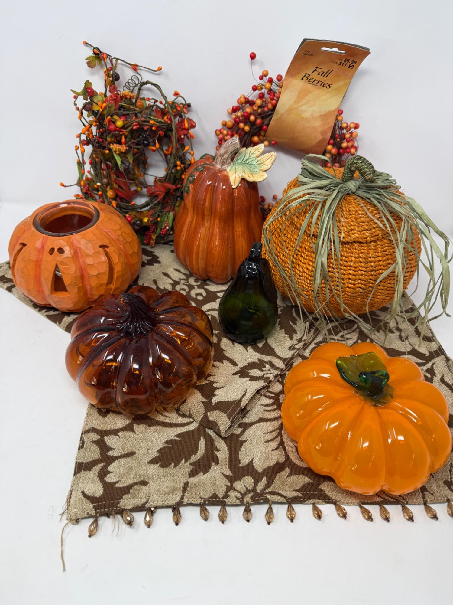Glass Pumpkins and Fall Decor Beaded edge runner 2 glass pumpkins - one with broken leaf Glass Pear Ceramic Squash Pumpkin basket and candleholder Fall berries garland