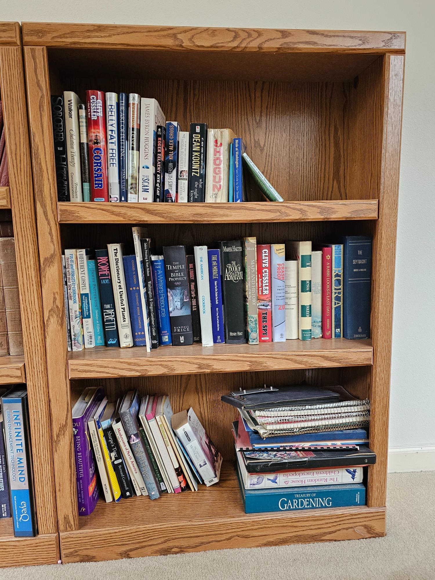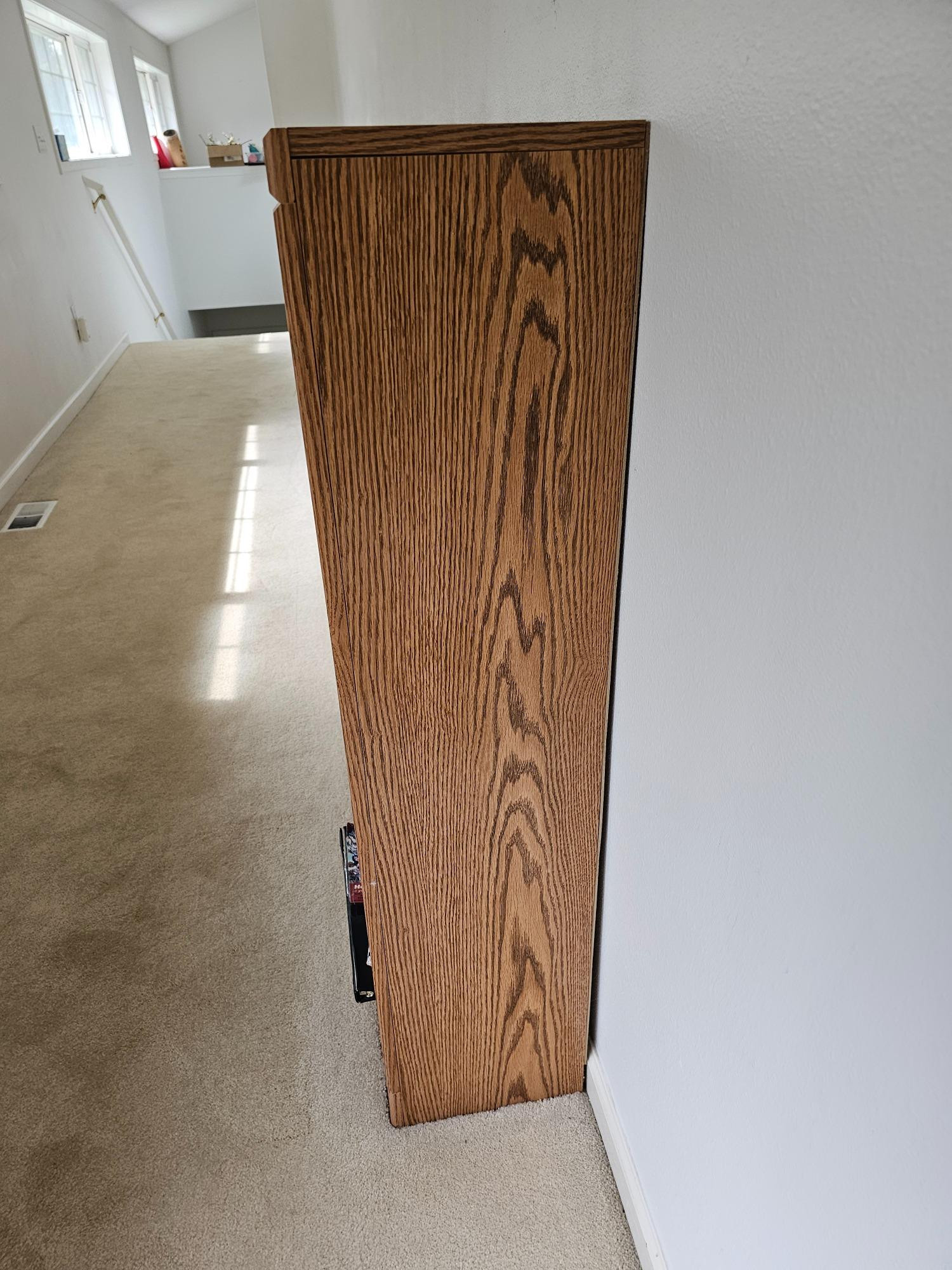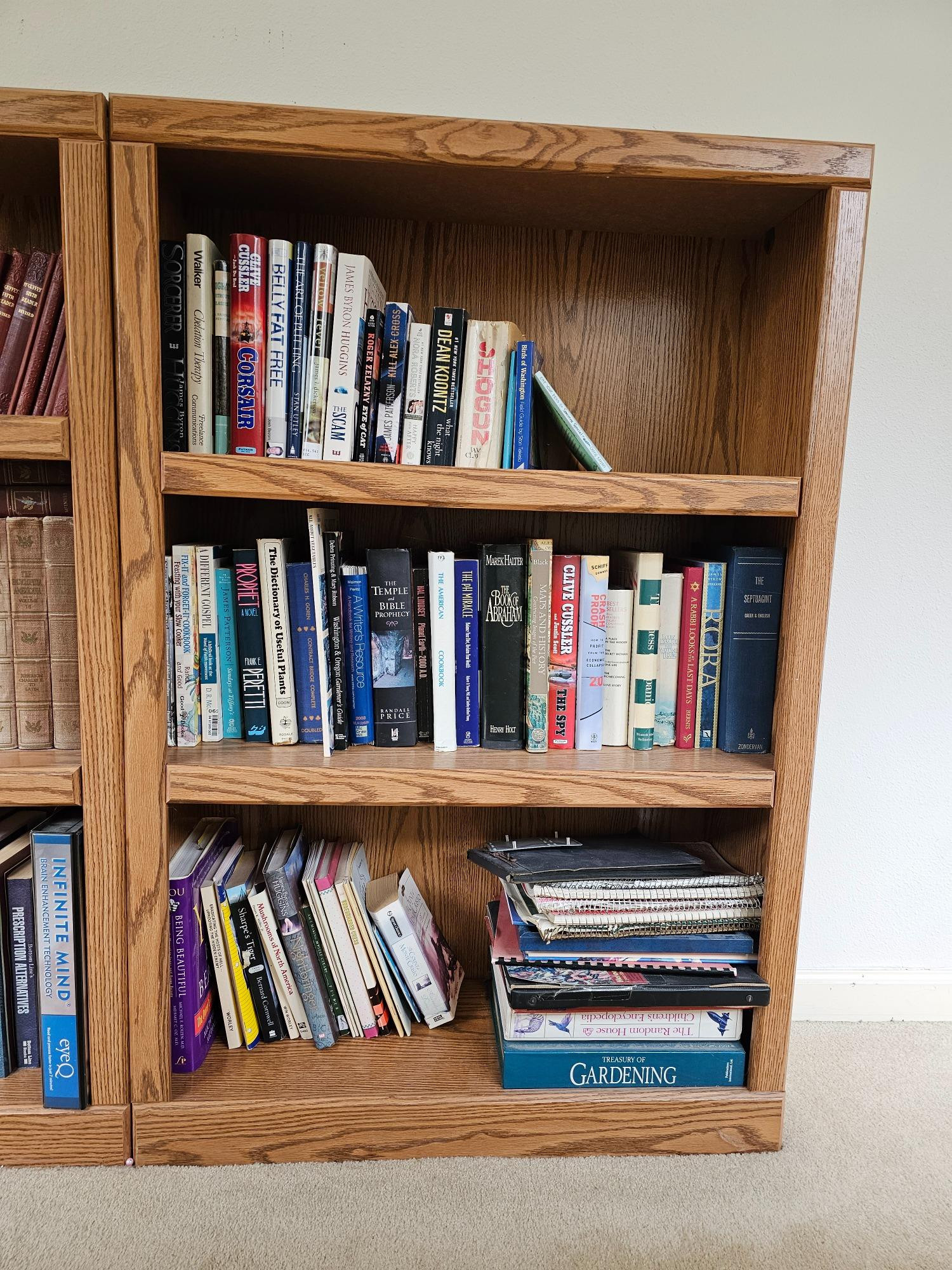 Oak Veneer Bookcase With 2 Adjustable Shelves (#1) In good condition! 44"T x 29.5"W x 10"D The lot is bookcase only, books not included!