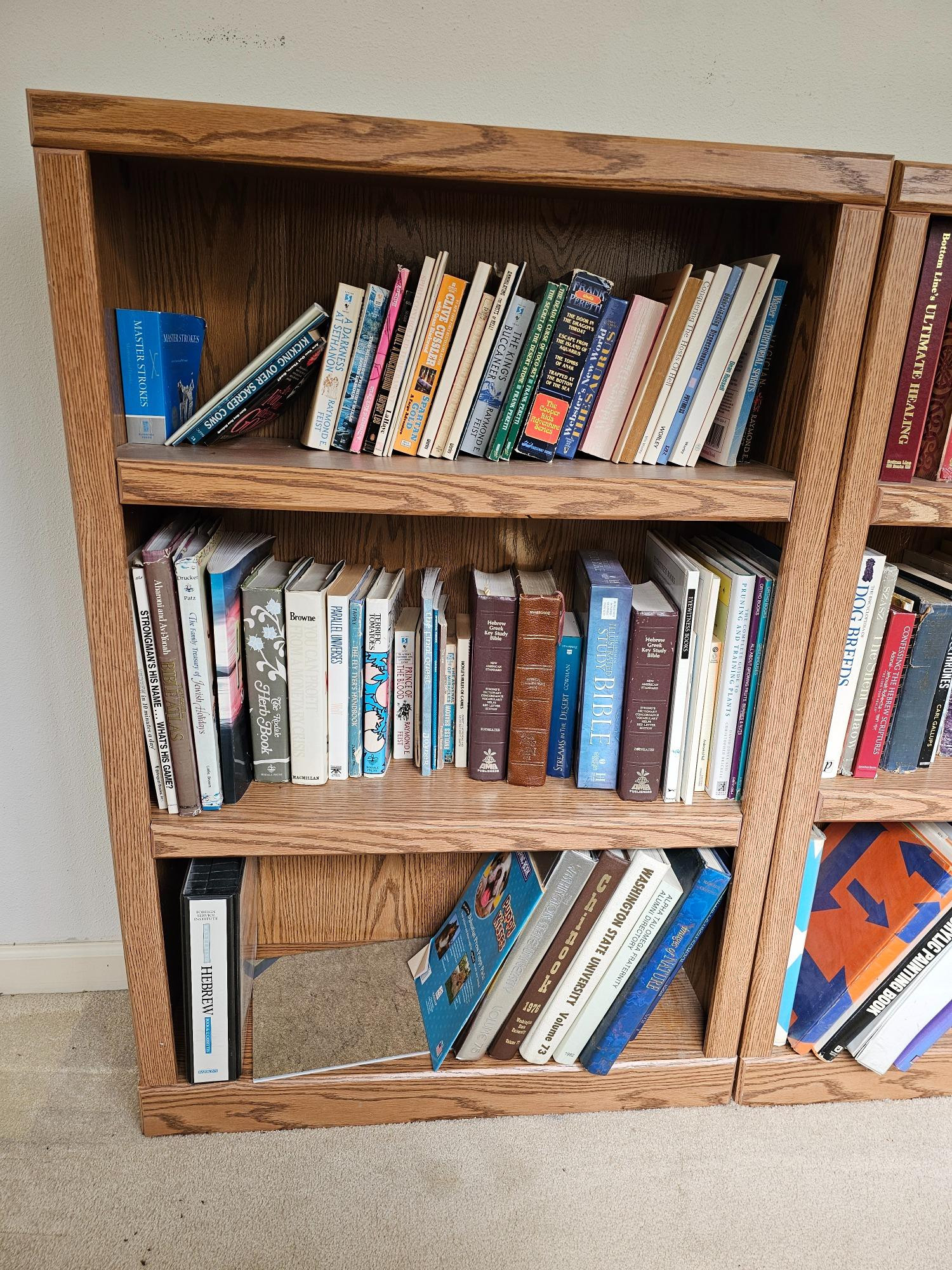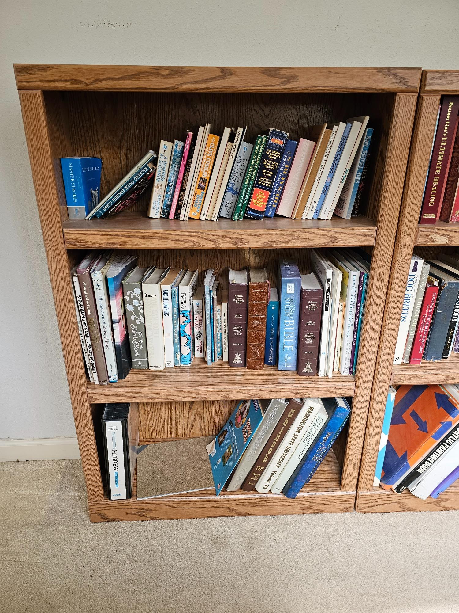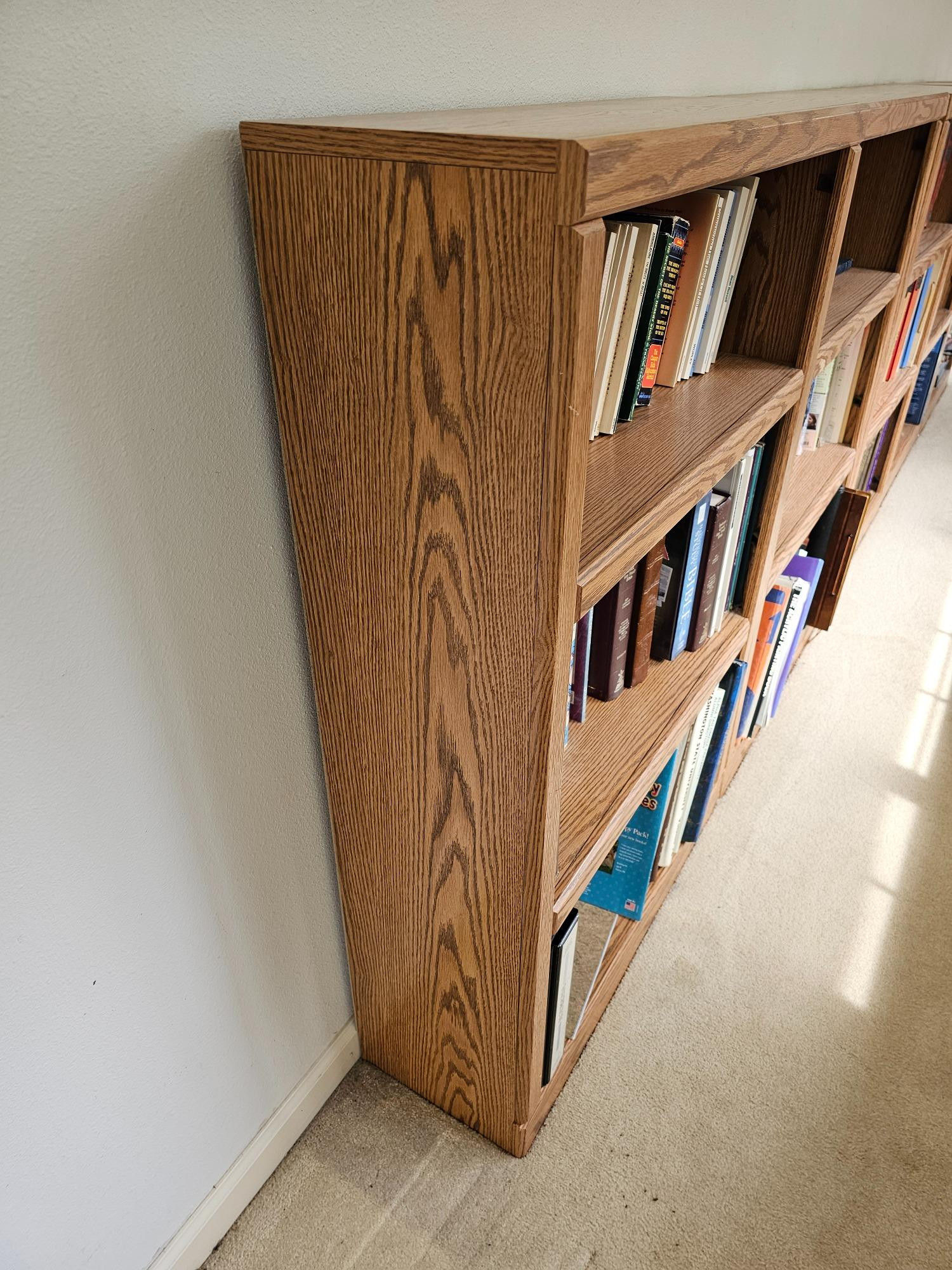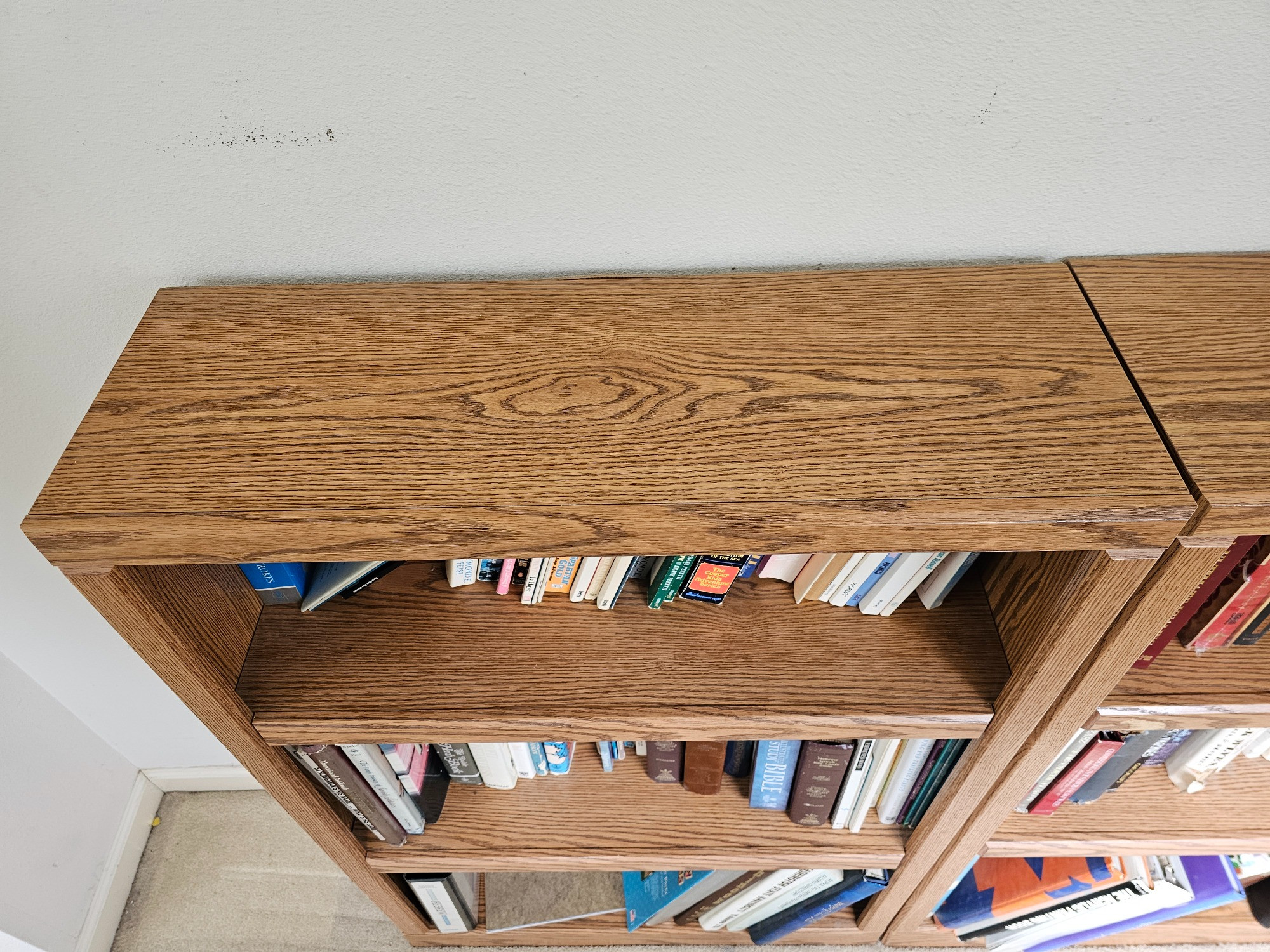 Oak Veneer Bookcase With 2 Adjustable Shelves (#5) In good condition! 44"T x 29.5"W x 10"D