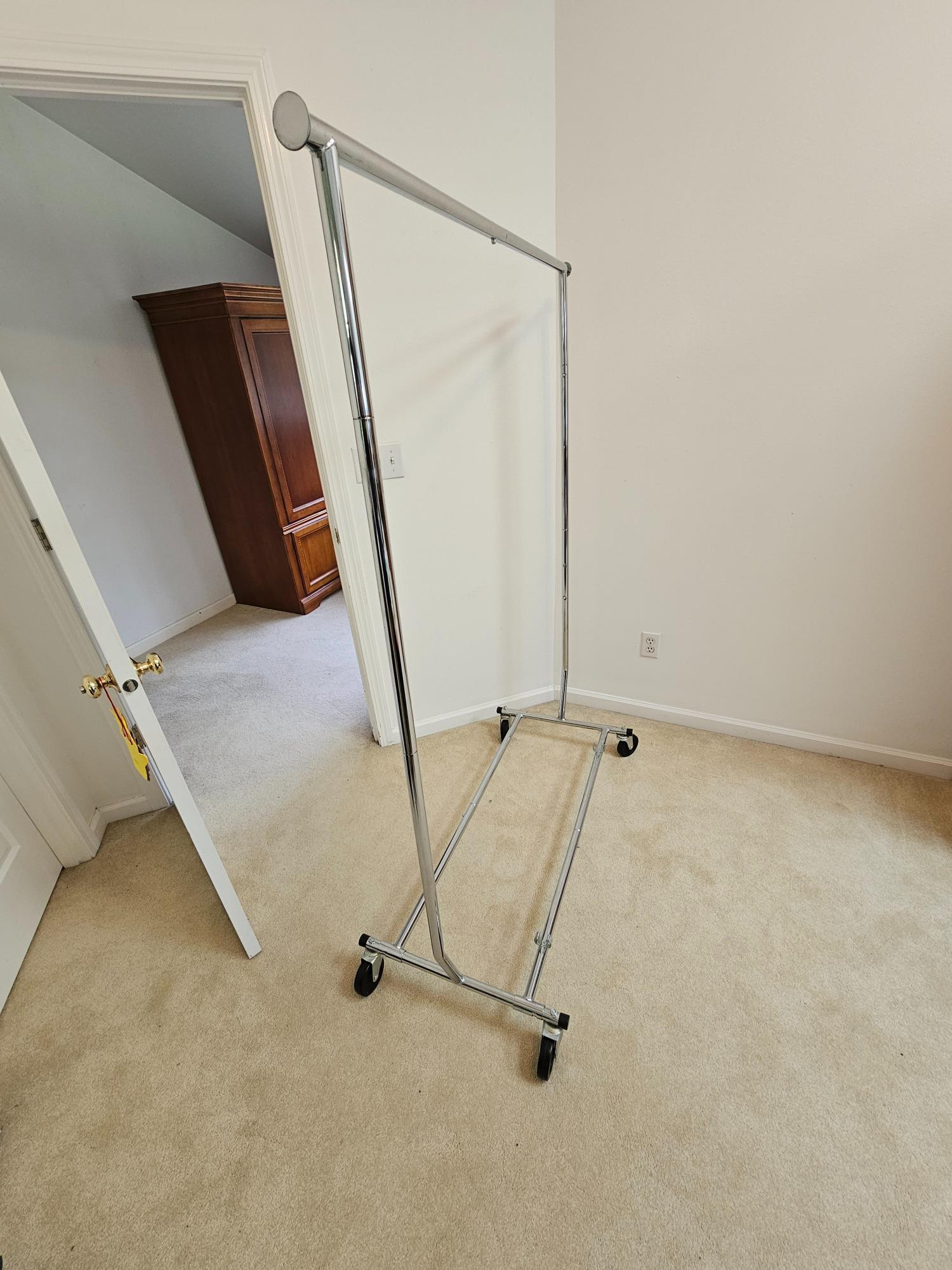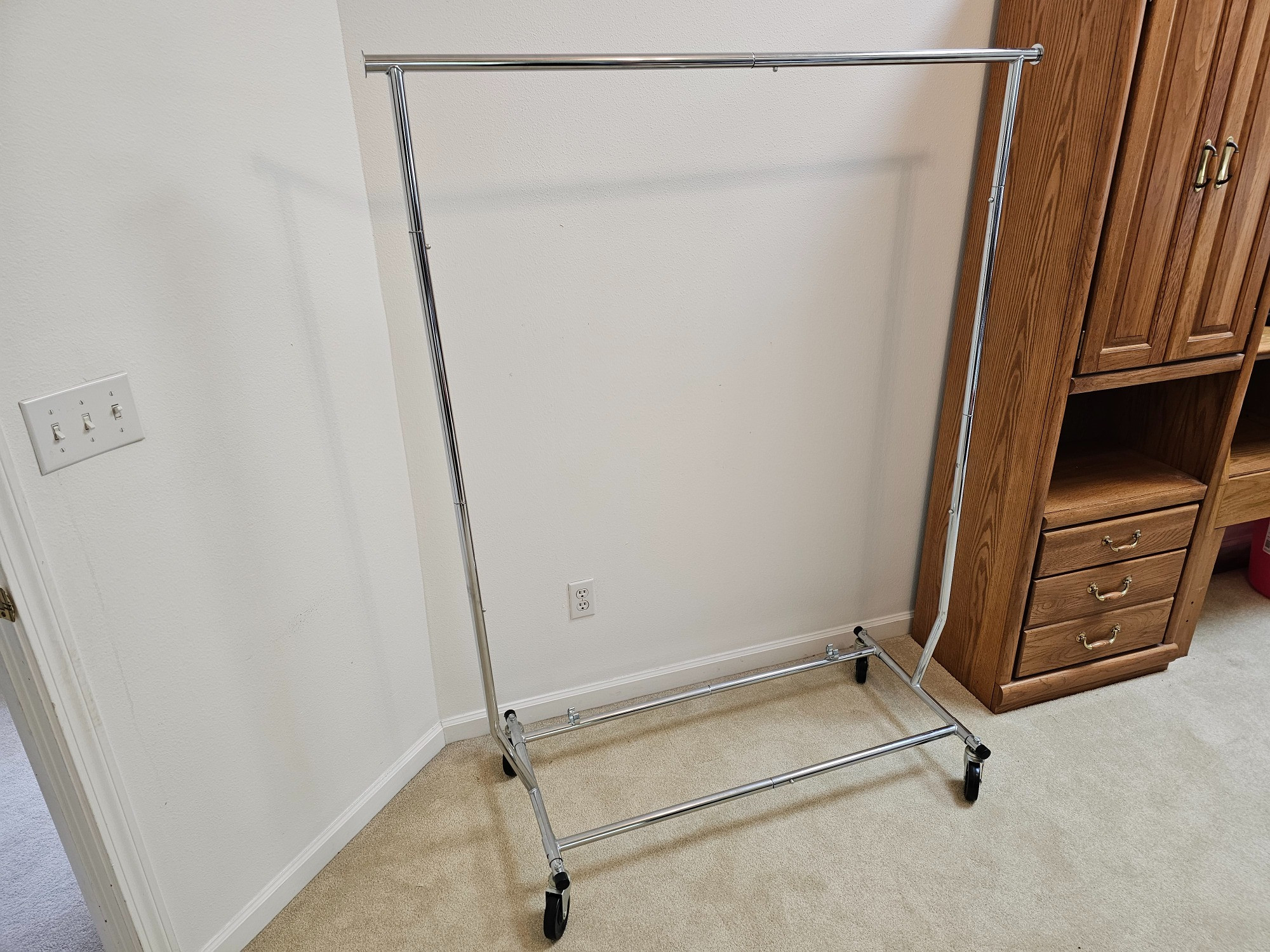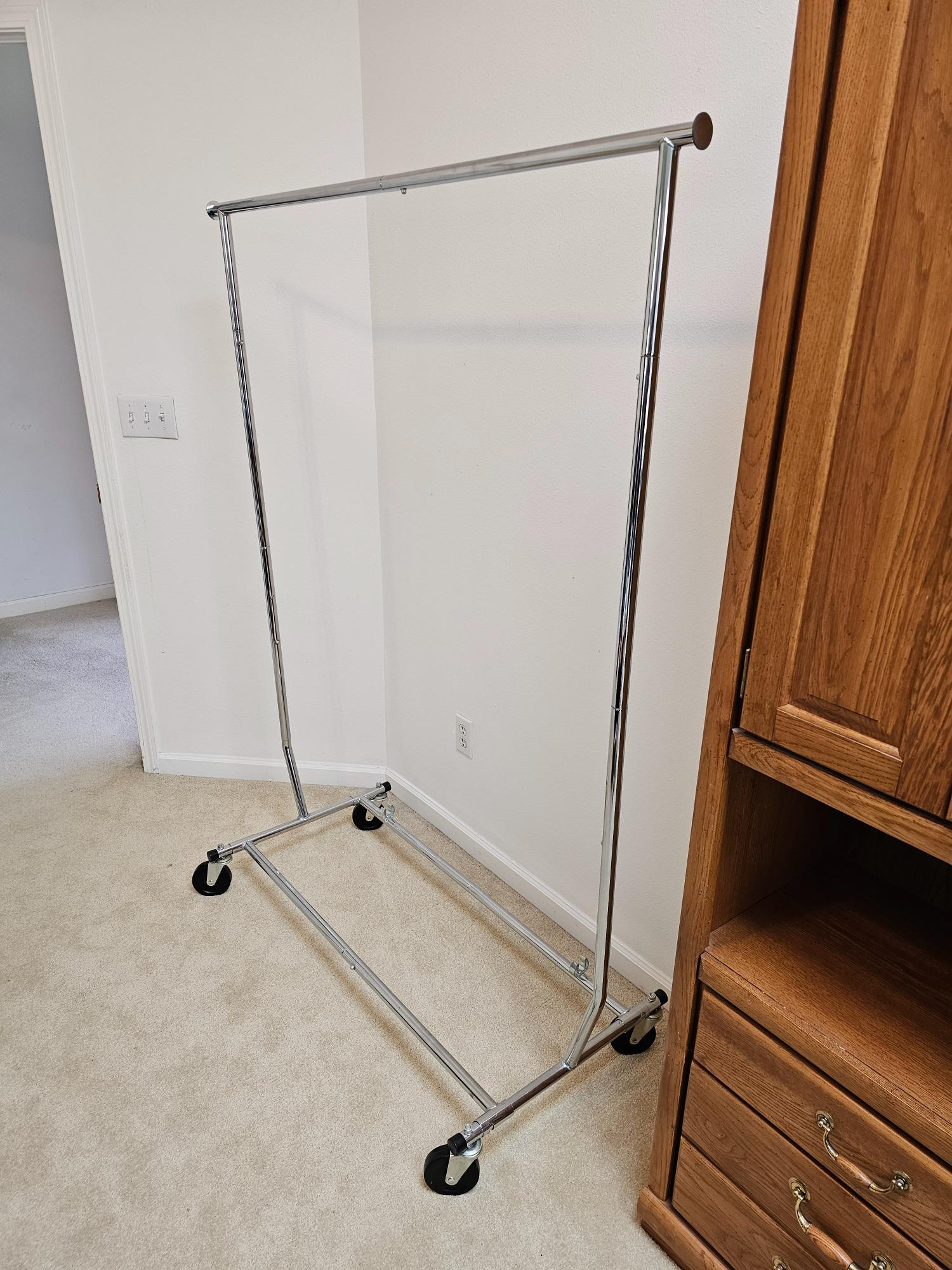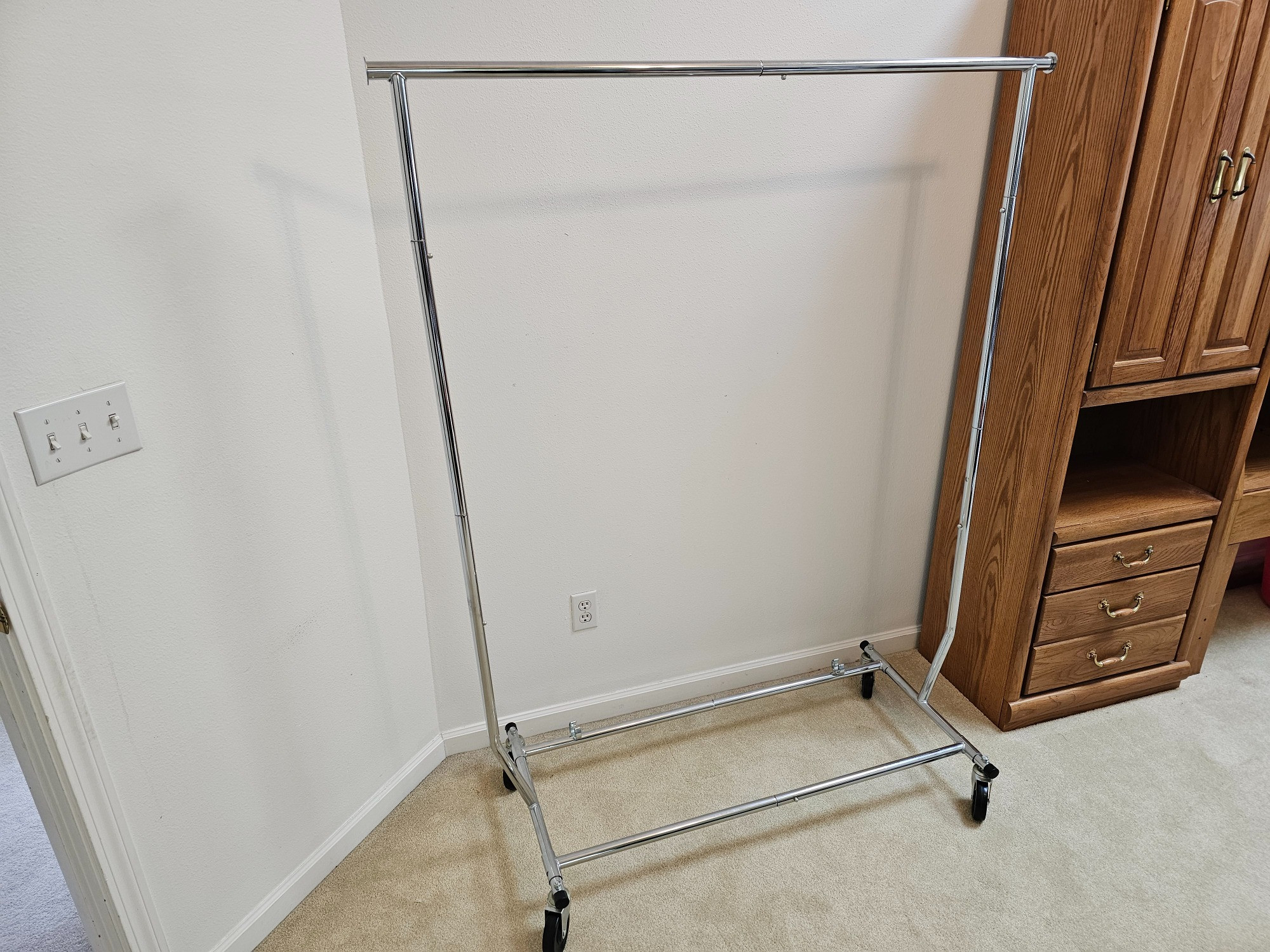 Single Rolling Chrome Clothes Rack #1 On wheels Height & width is adjustable Top hanging bar can be removed for storage Excellent way to hang seasonal clothing! 65.5"T x 51"W x 22"D