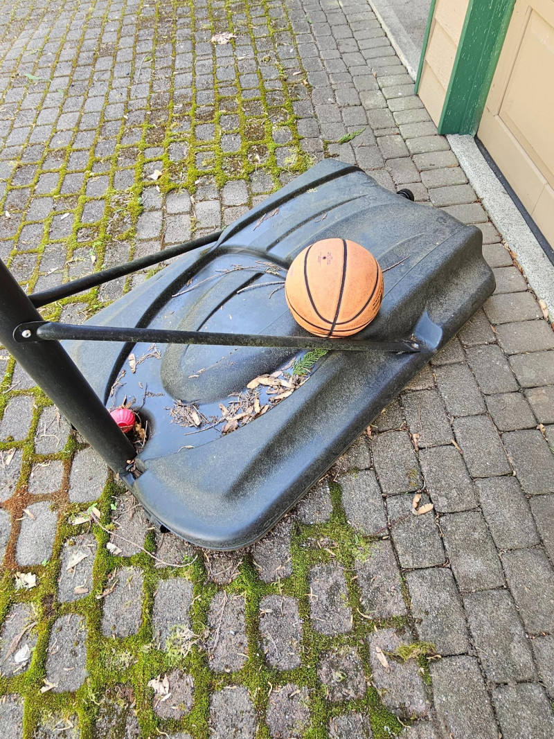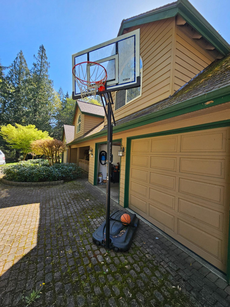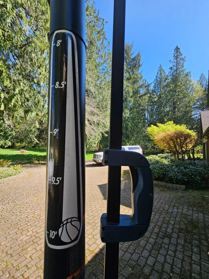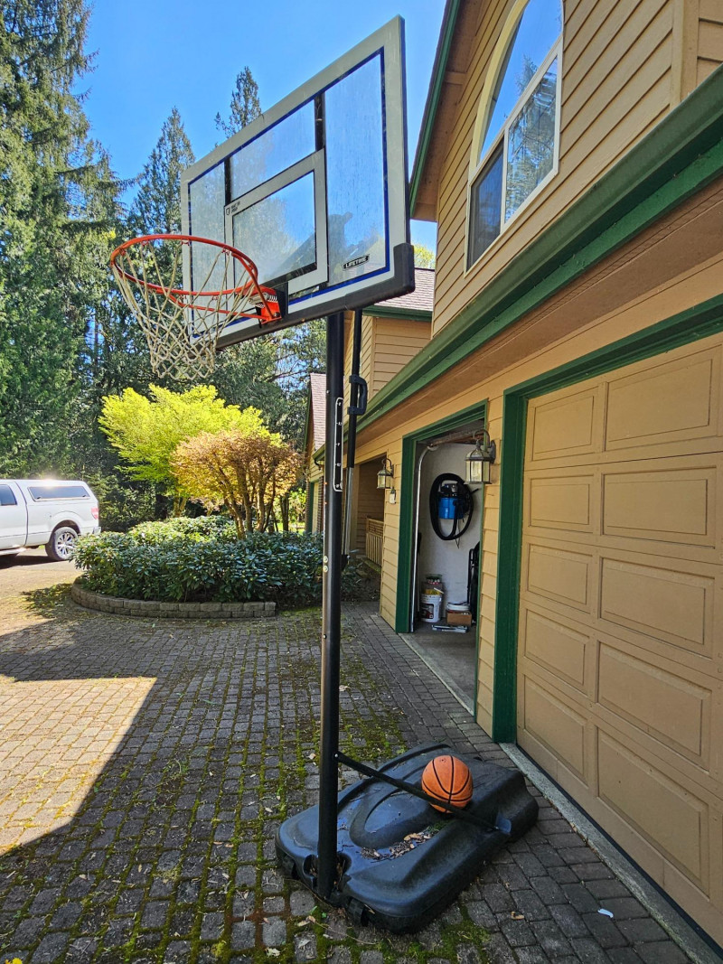 Lifetime Full-Size Adjustable/Portable Basketball Hoop Basketball hoop adjusts from 8' - 10' tall.to accommodate a wide range of kids & adults! The hoop has wheels on the base for easy portability around the yard or driveway Includes Wilson Jet indoor/outdoor composite leather basketball, base, hoop, backboard, and adjustable pole At 8' Adjustment: 124"T x 50"W x 80"D Bring your truck or trailer for this one!