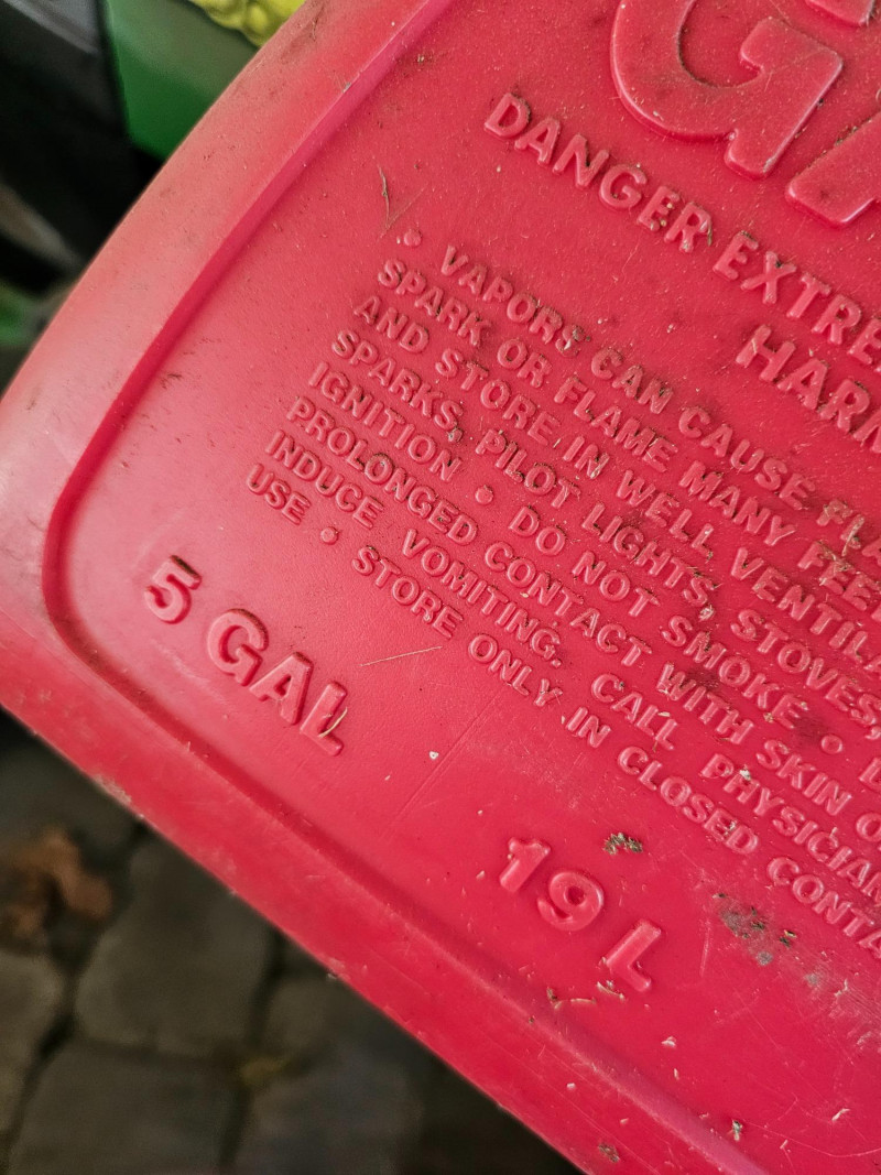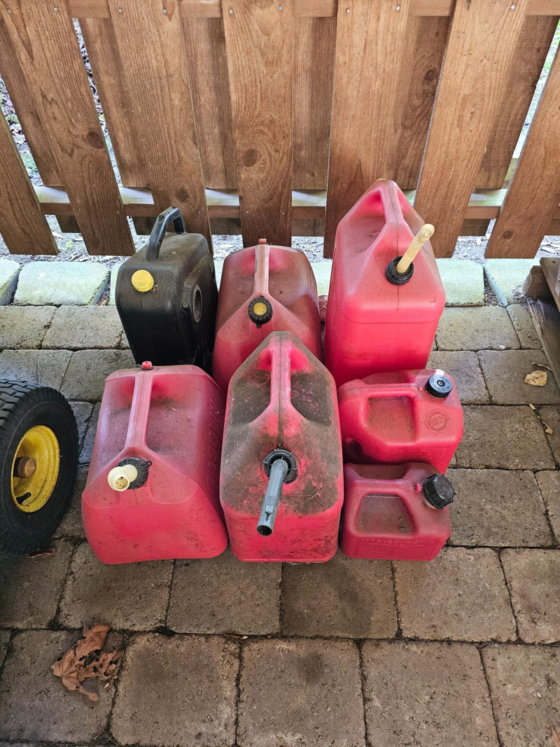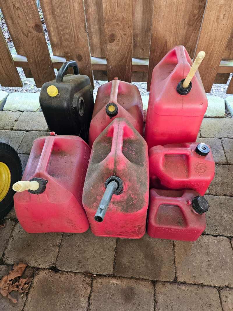 (6) Empty Fuel Cans & (1) Empty Oil Disposal Pan (1) 6 gallon (3) 5 gallon (1) 2 gallon (1) 1 gallon All appear to be in good used condition and are empty!