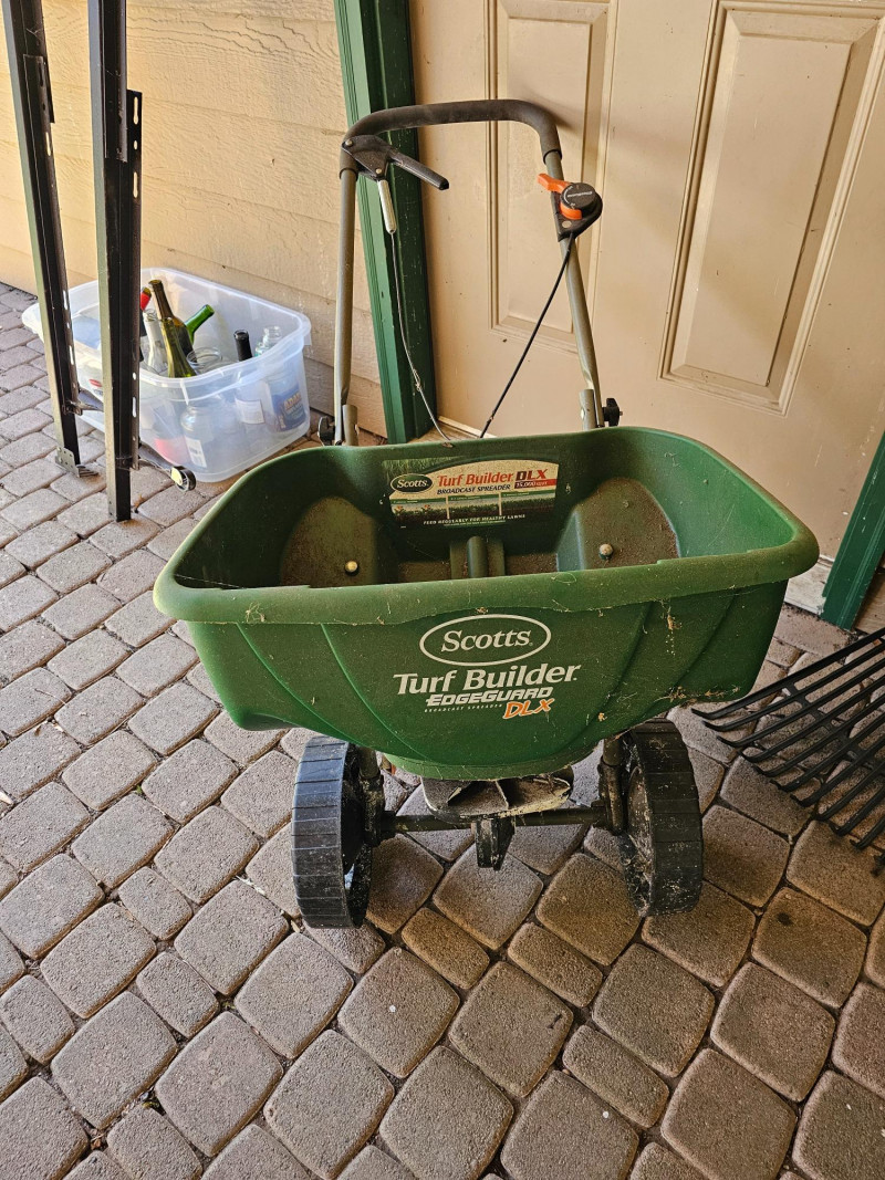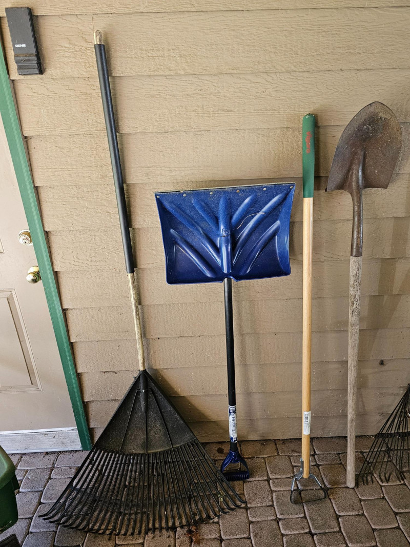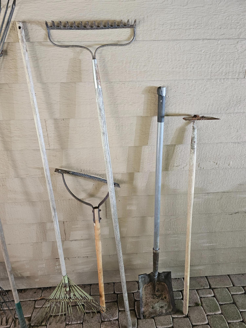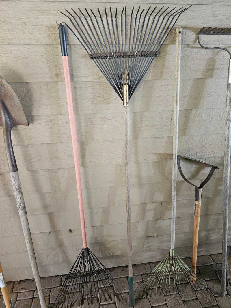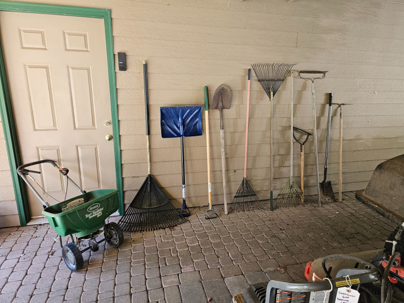 (12) Garden Tools 4 lawn rakes, flat-blade shovel, snow shovel, shovel (cracked handle), hoe, weeder and a Scott's Turf Builder EdgeGuard DLX broadcast spreader 12 tools in all!