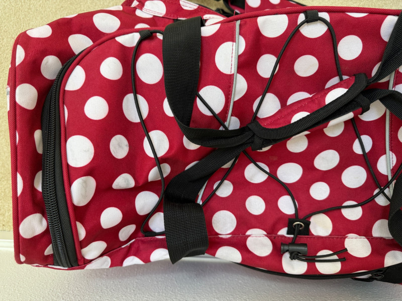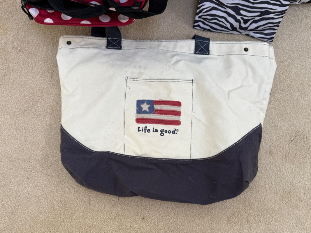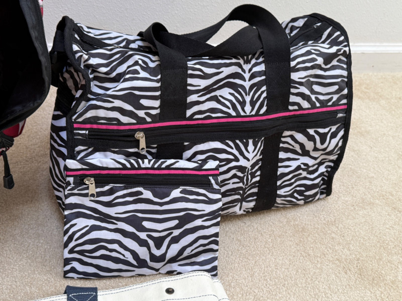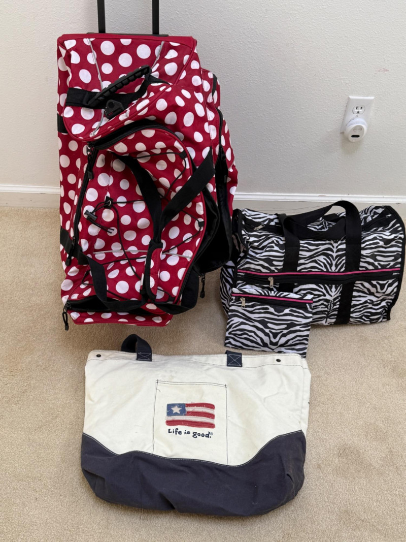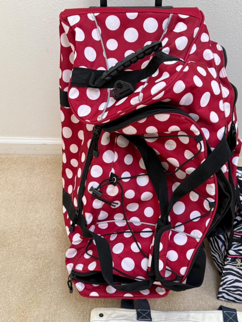 Red Polka Dot Rolling Duffle Bag With Zebra Weekender and Life is Good canvas tote.