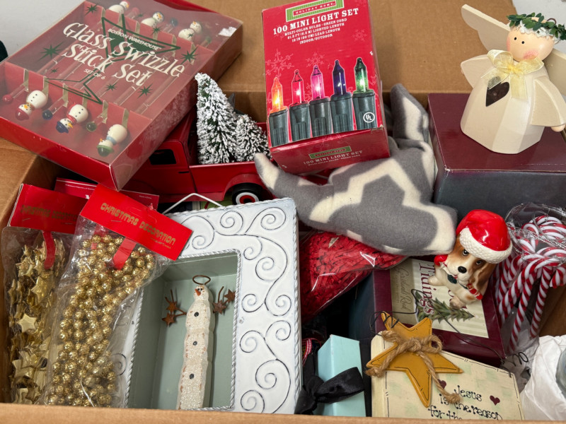 Christmas Decor and Ornaments 14”x20”x15” box full of miscellaneous Christmas and seasonal decor.