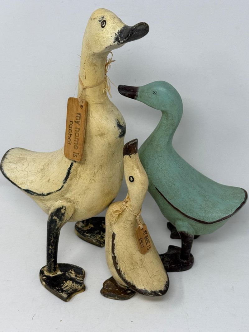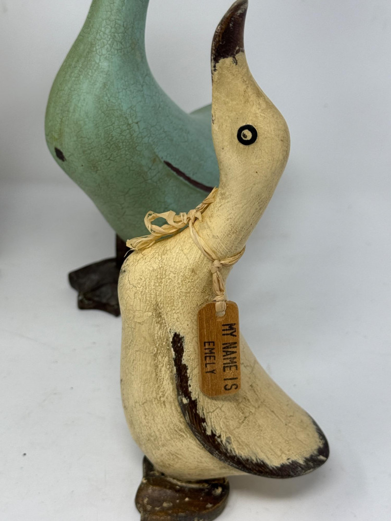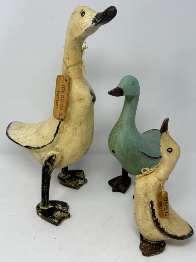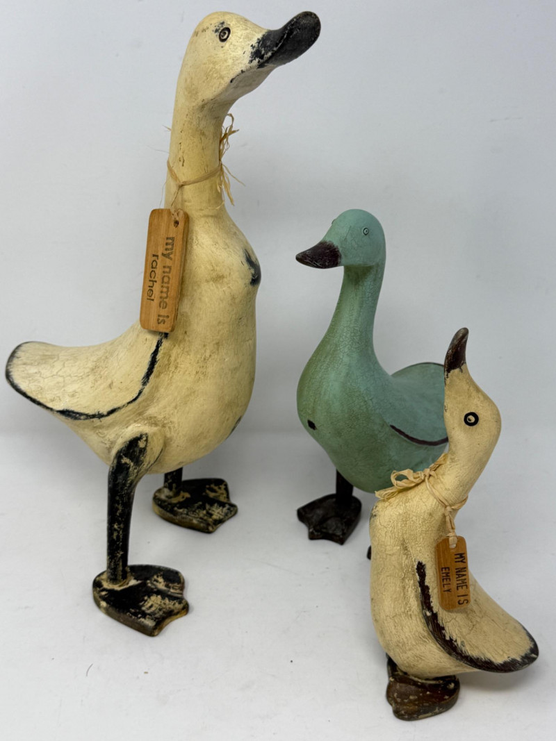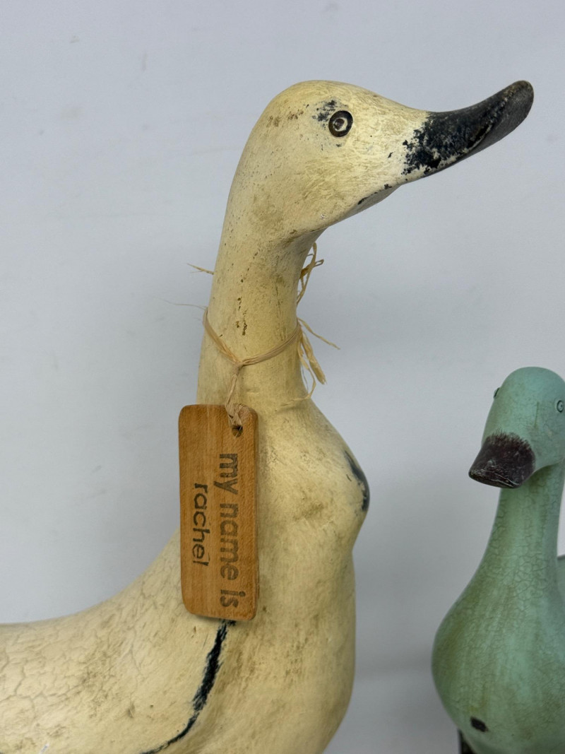 Composite geese with name tags.