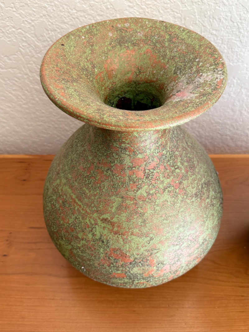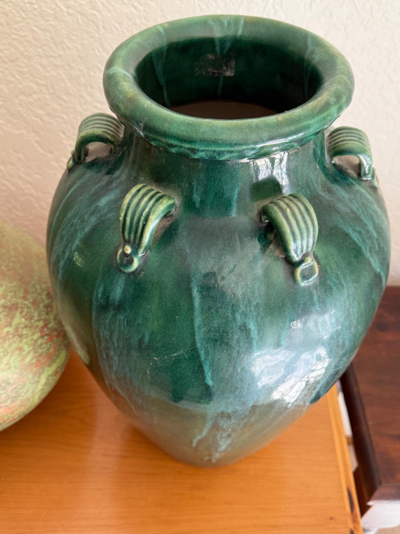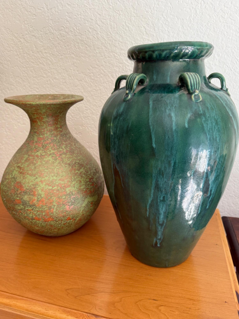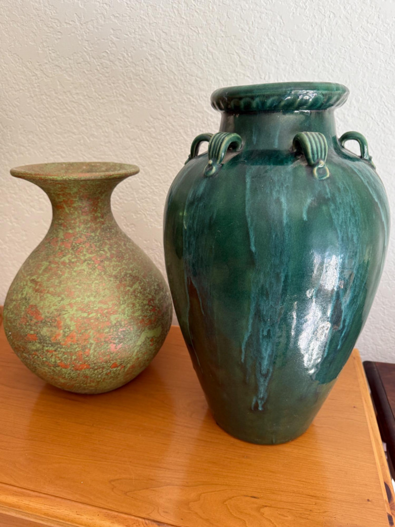 Glazed pottery green vase with blue accents is 12”x19.5” Clay pottery vessel with green crackle paint coating is 11”x15.5”