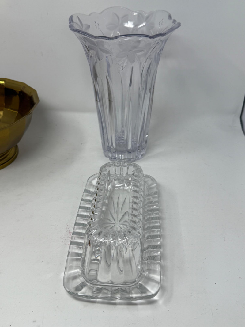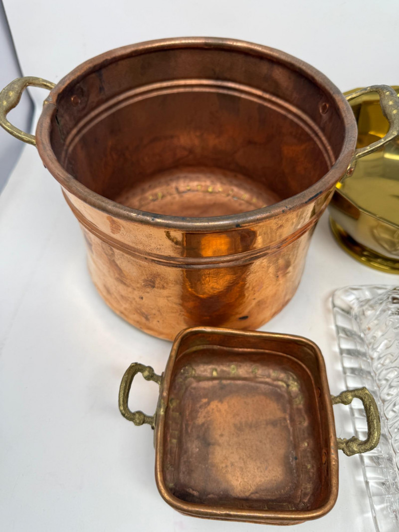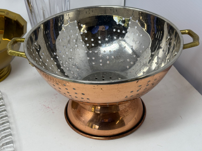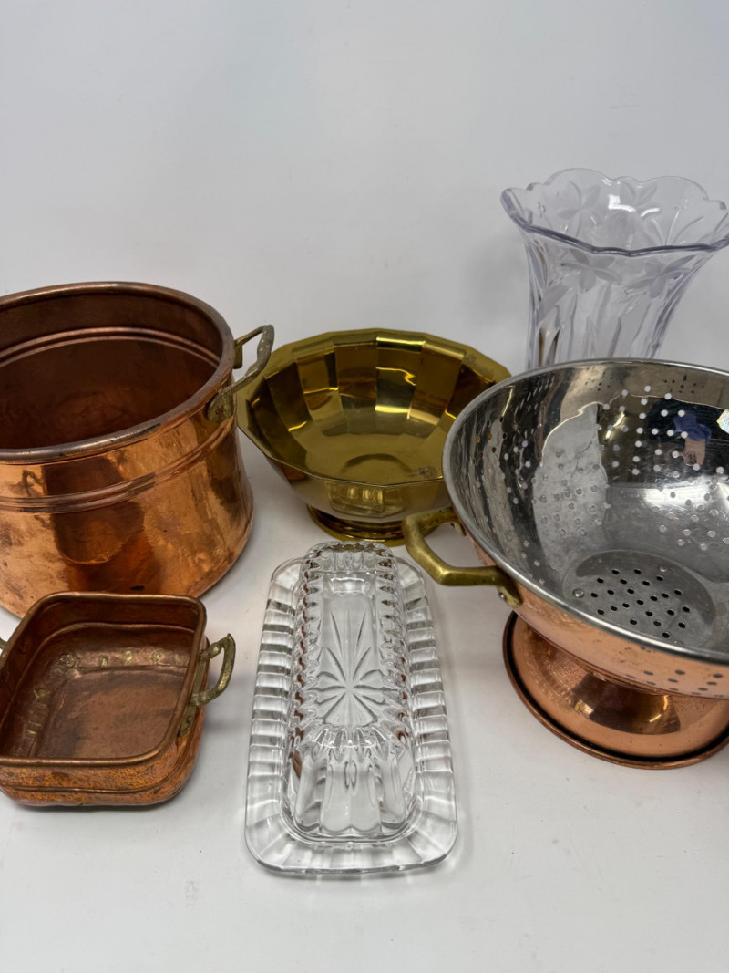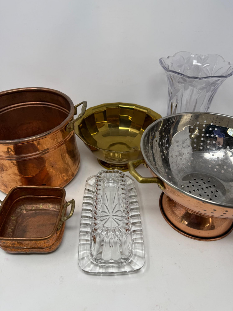 2 handles brass container is 7.5”x6” cut glass vase is 8” butter dish copper colander