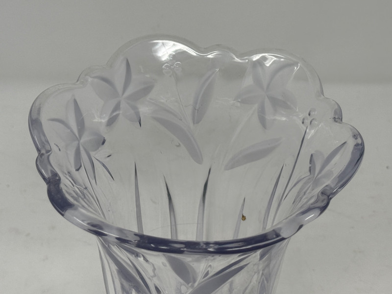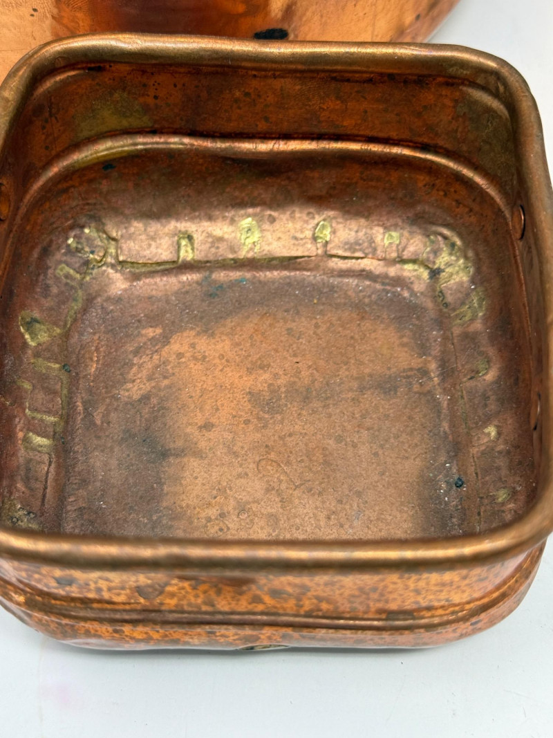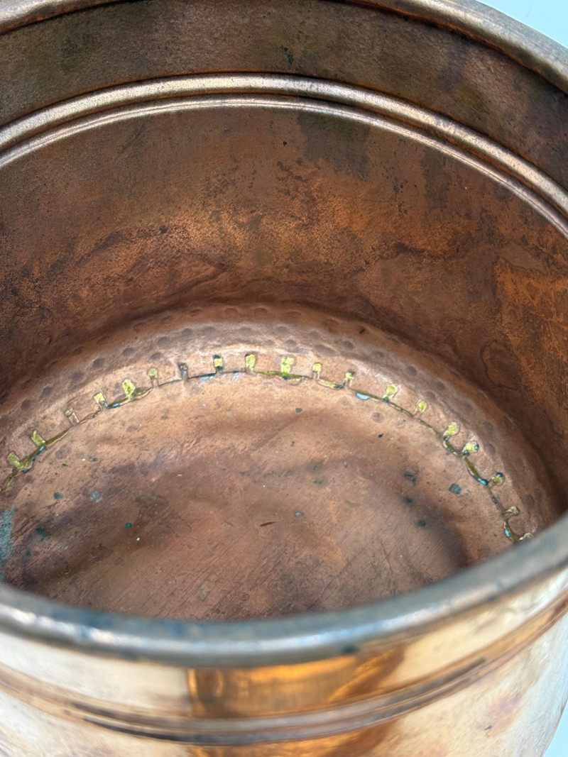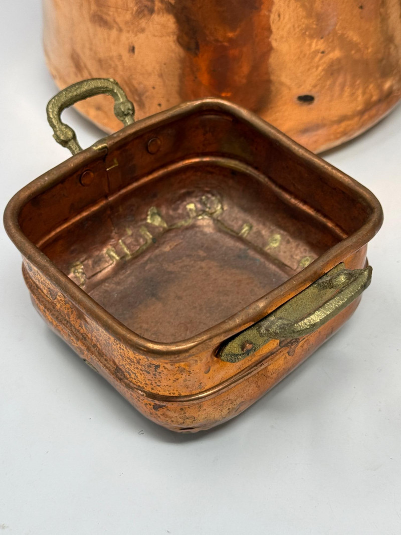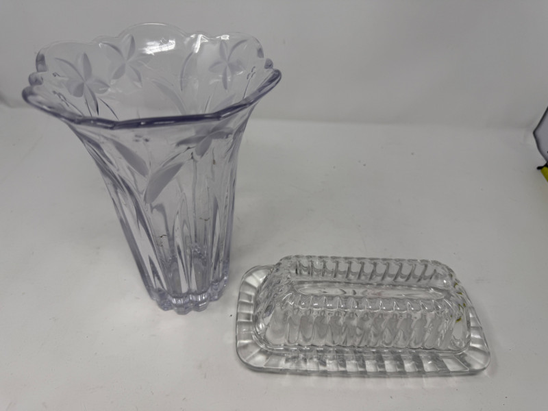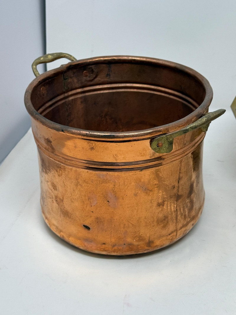 2 handles brass container is 7.5”x6” cut glass vase is 8” butter dish copper colander