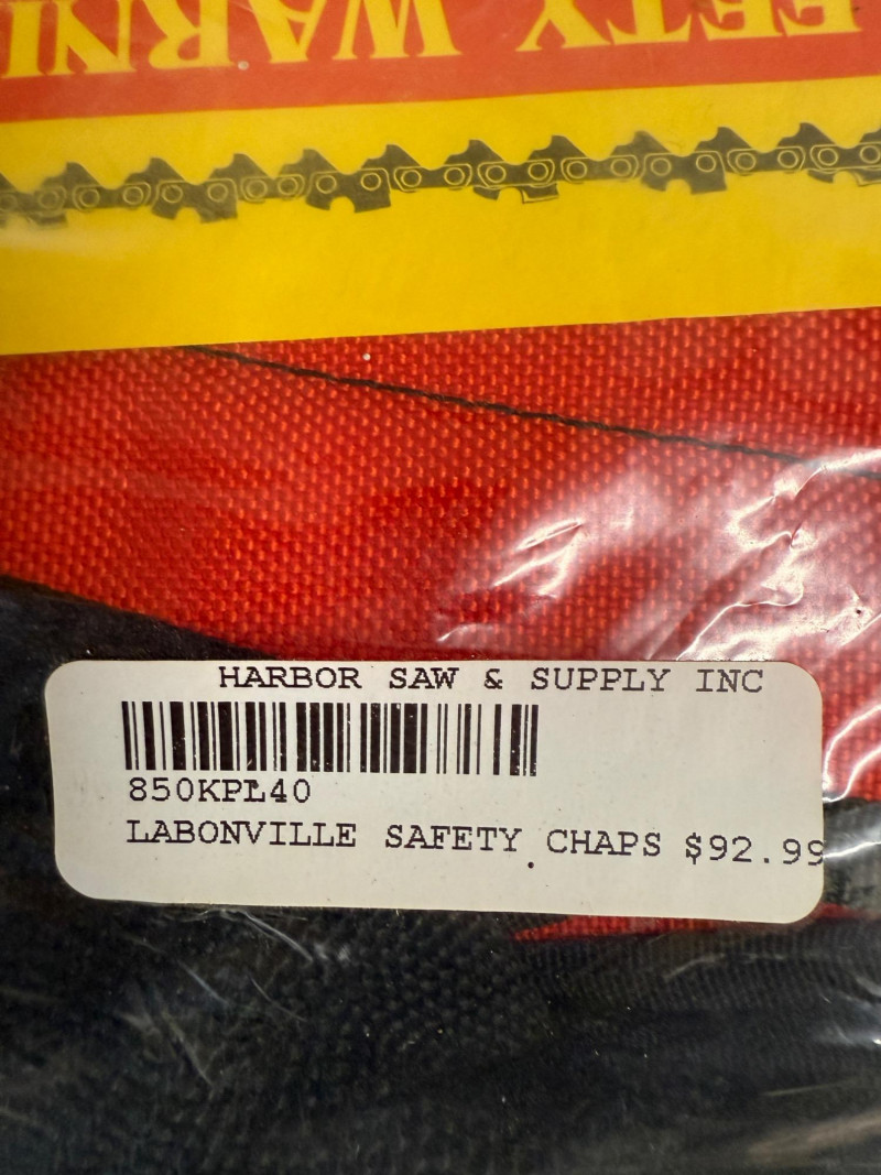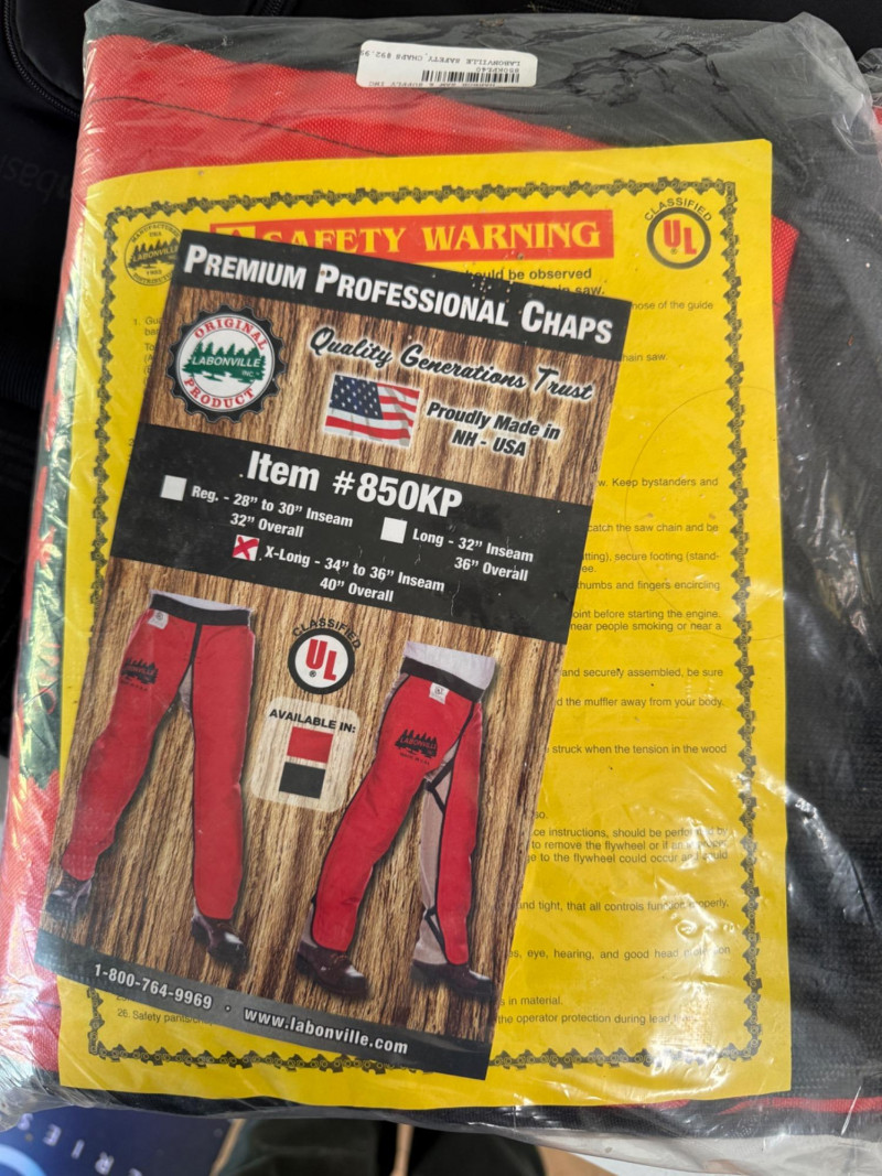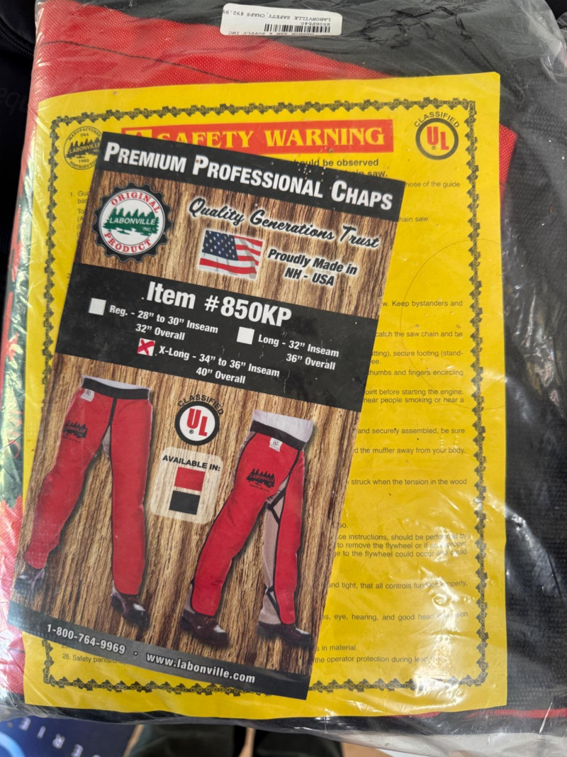 Red Labonville Chainsaw Safety Chaps Extra Long 34-36" inseam. In original packaging and unused.
