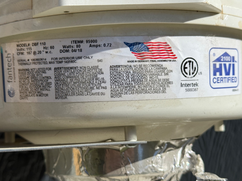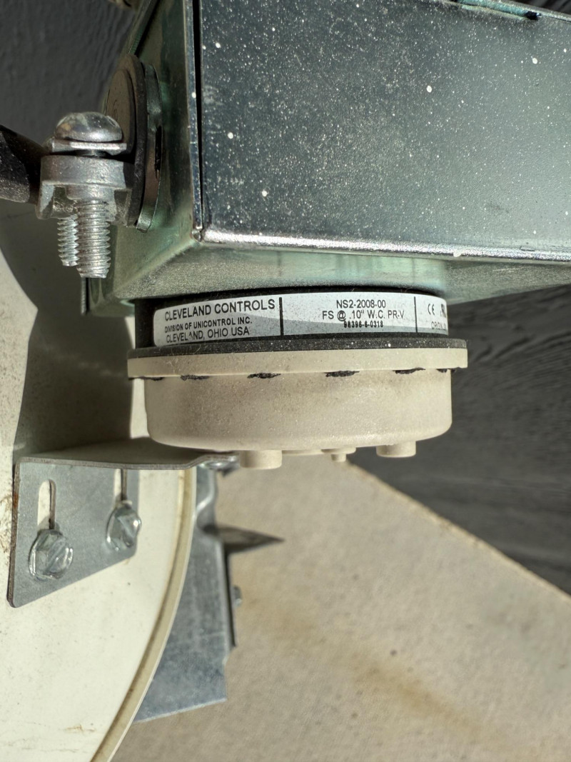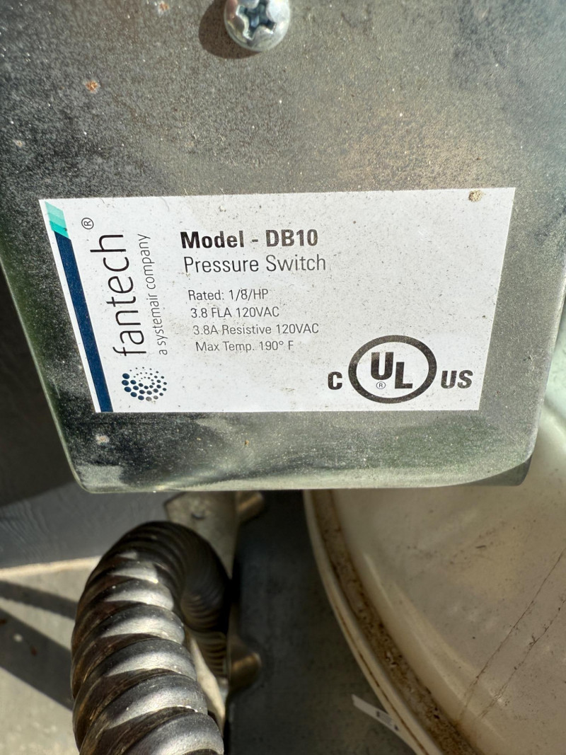 Fantech Commercial Fan model DBF 110 Fantech Pressure switch model DB10 Full assembly measures 12”x35” Worked when removed.