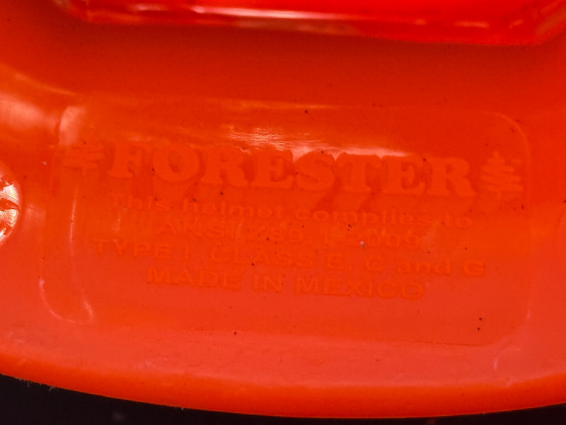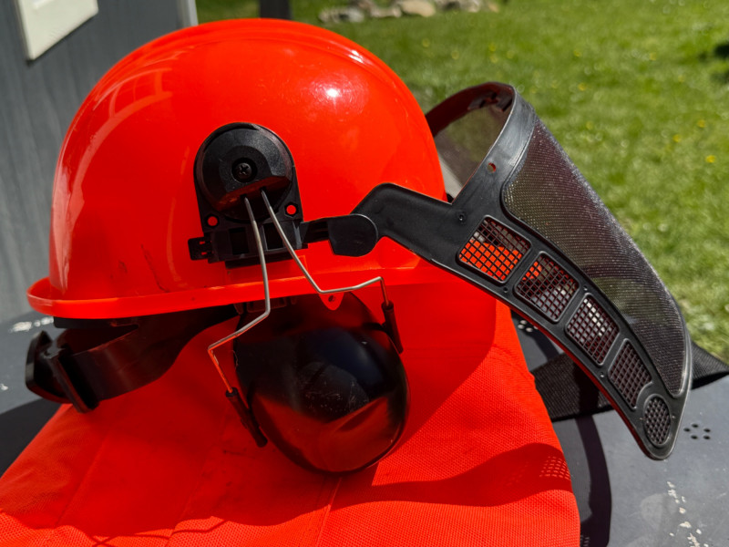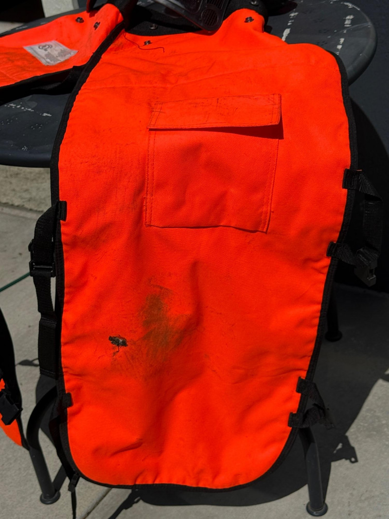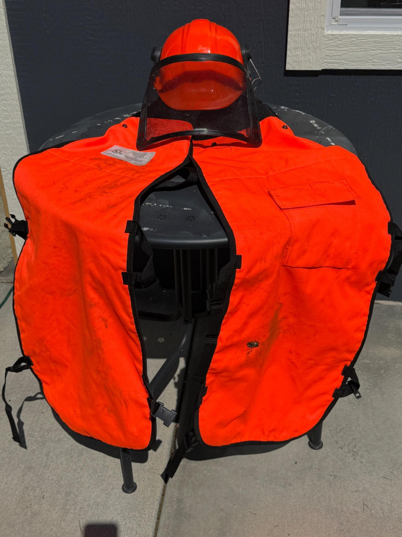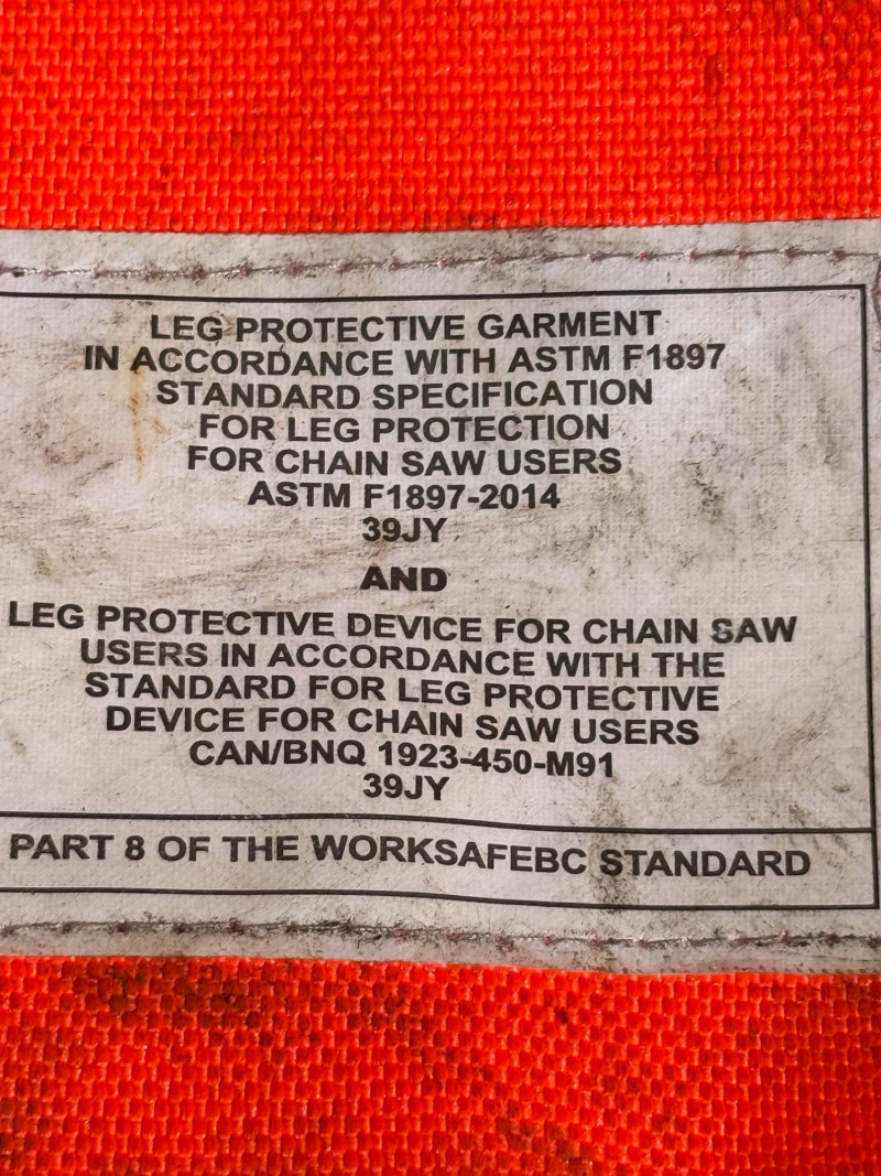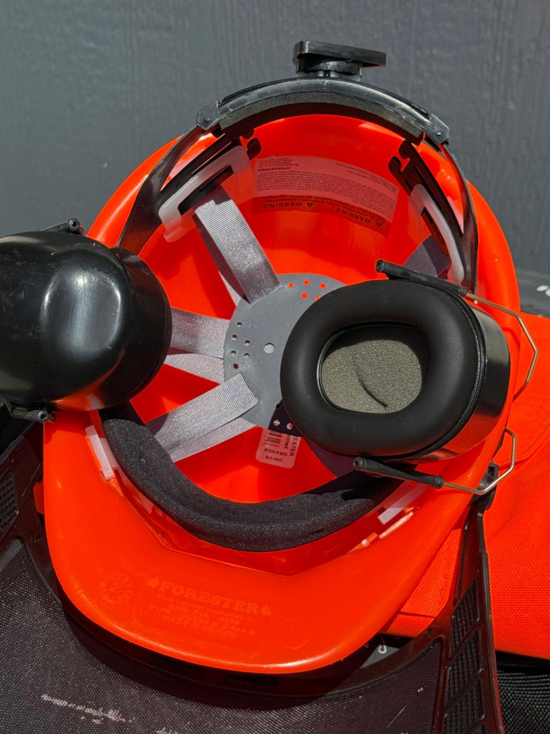 Safety Orange Chainsaw Chaps 37.5” one front pocket and adjustable waist Forester Helmet With Ear Protection