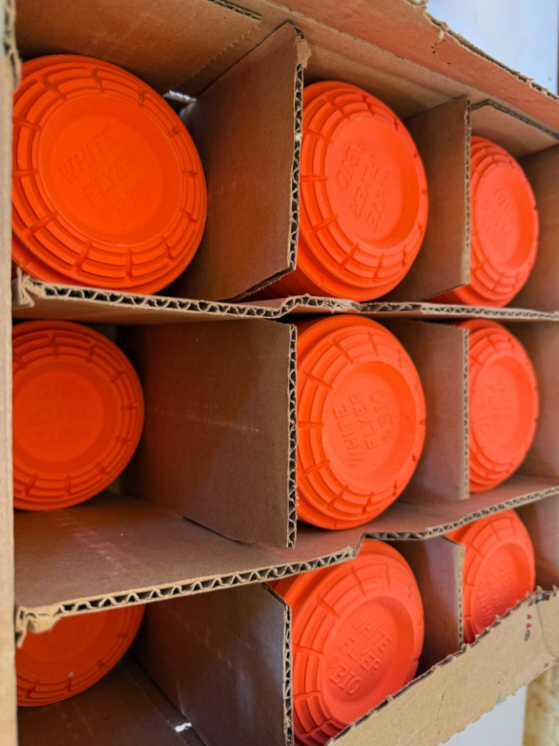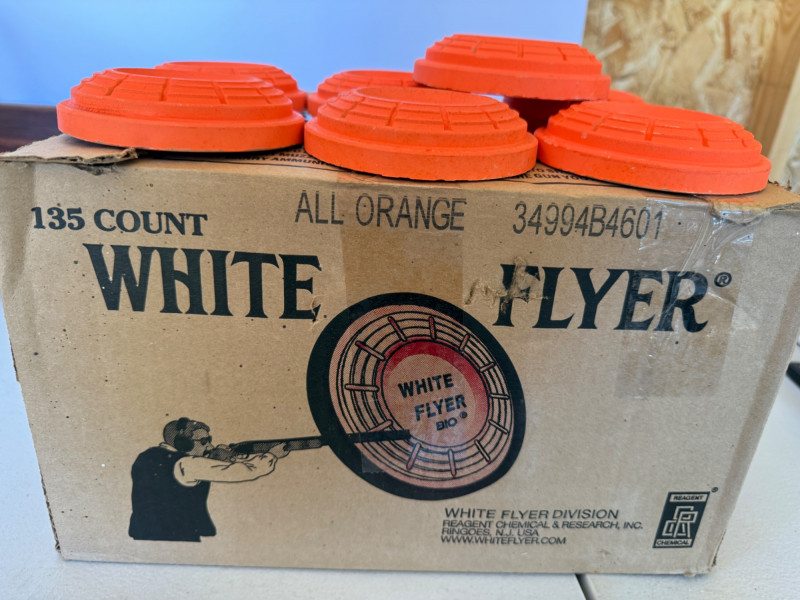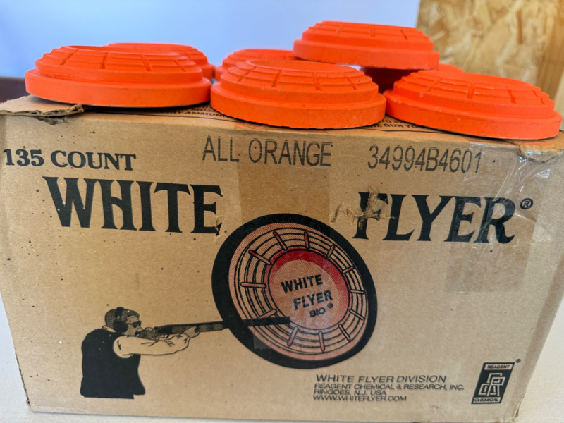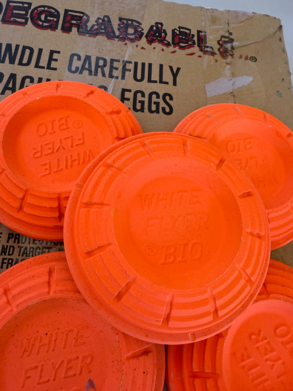 Almost Full Box Of White Flyer Orange Skeet 85% full box of biodegradable orange skeet targets Cardboard paper targets