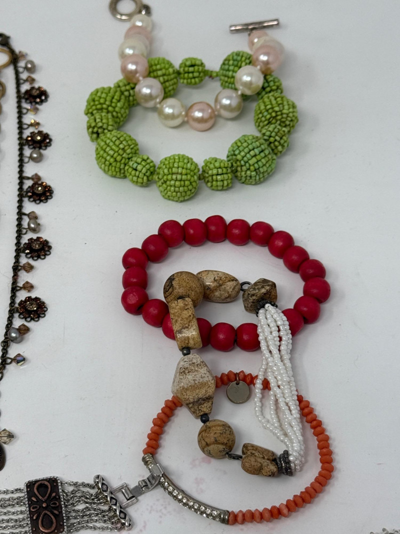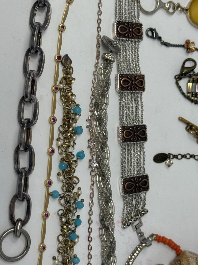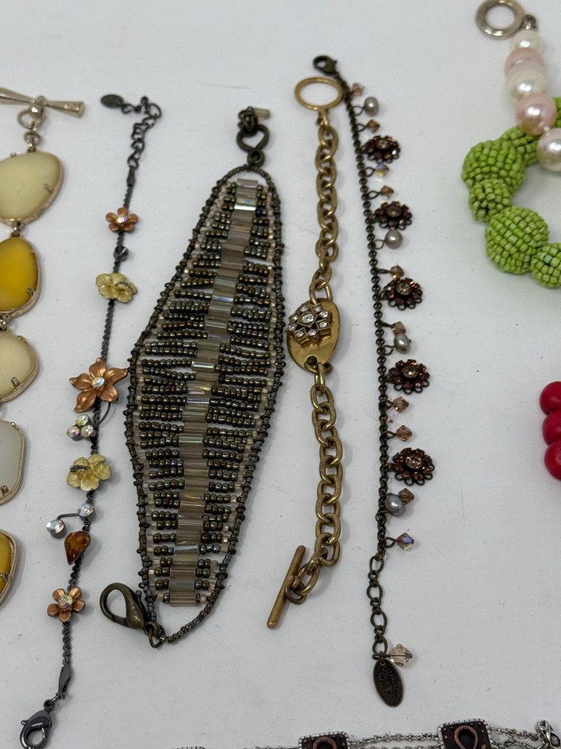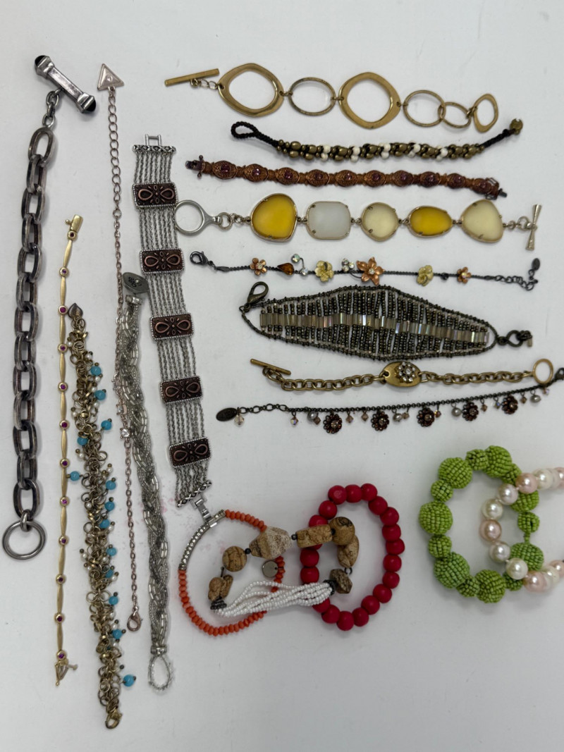 19 unique bracelets in a fun variety. Larger sizes. Good condition.