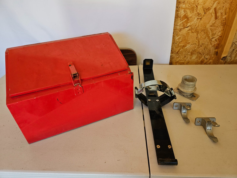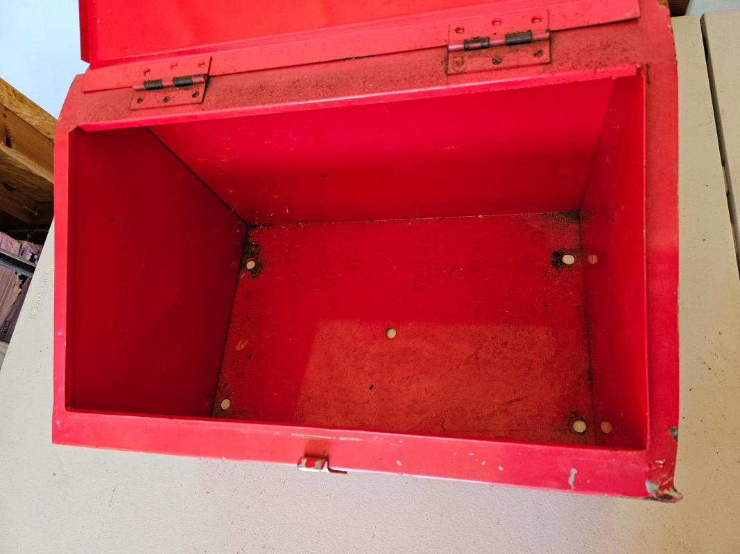 Lot # 169 - Red Metal Toolbox, Firehose & Large Fire Extinguisher Holder