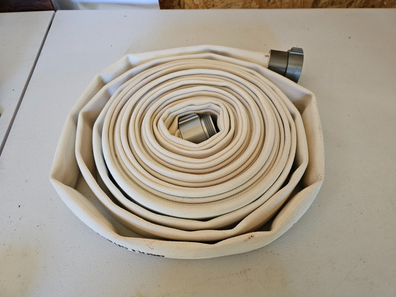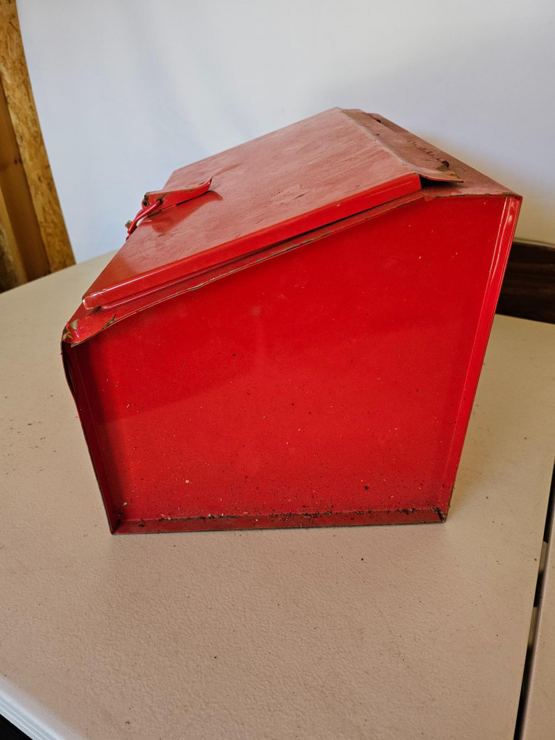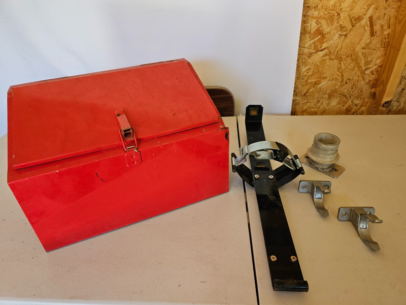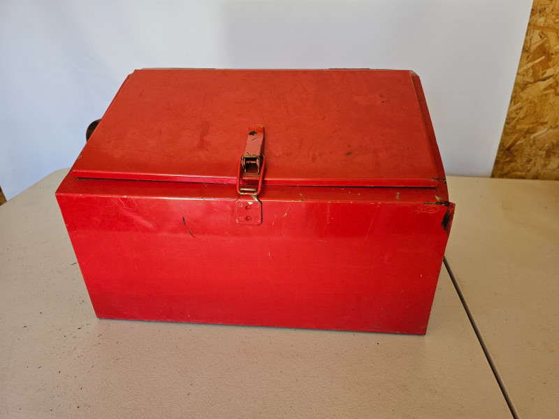 Red Metal Toolbox, Firehose & Large Fire Extinguisher Holder Toolbox: 8.5"T (front) 11.5"T (back) x 18"W x 12"D Firehose: 50' of 1.5" firehose with fittings Extinguisher Mount: 24" x 7.25"