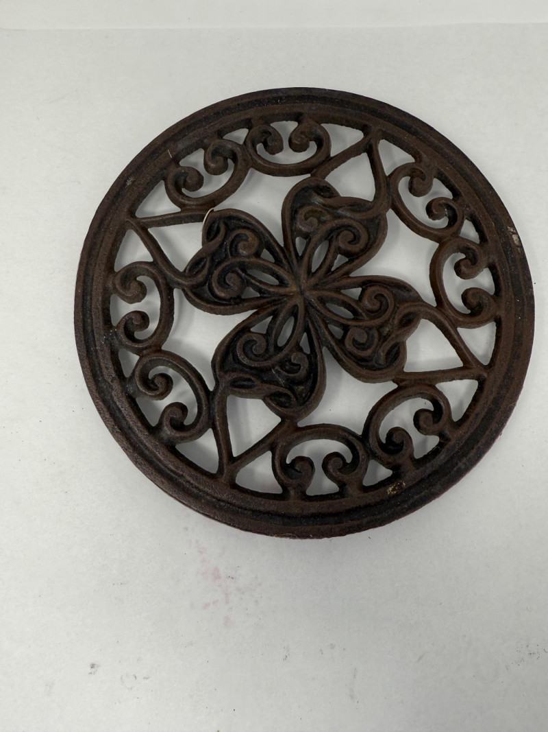 Vintage 1949 John Zimmerman Harner # 5 Cast Iron Footed Trivet Butterfly 4 leaf clover is 7” diameter MCM spoke trivet is 9”x6” 5 Cast iron hooks, each about 6” long.