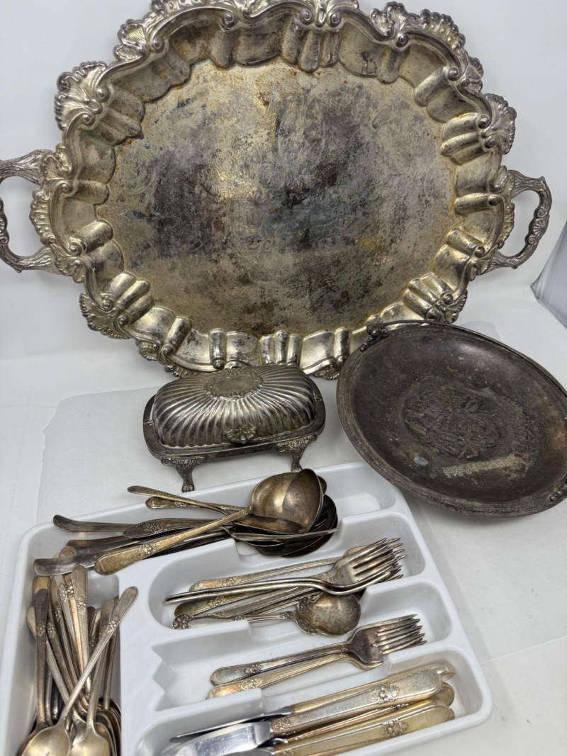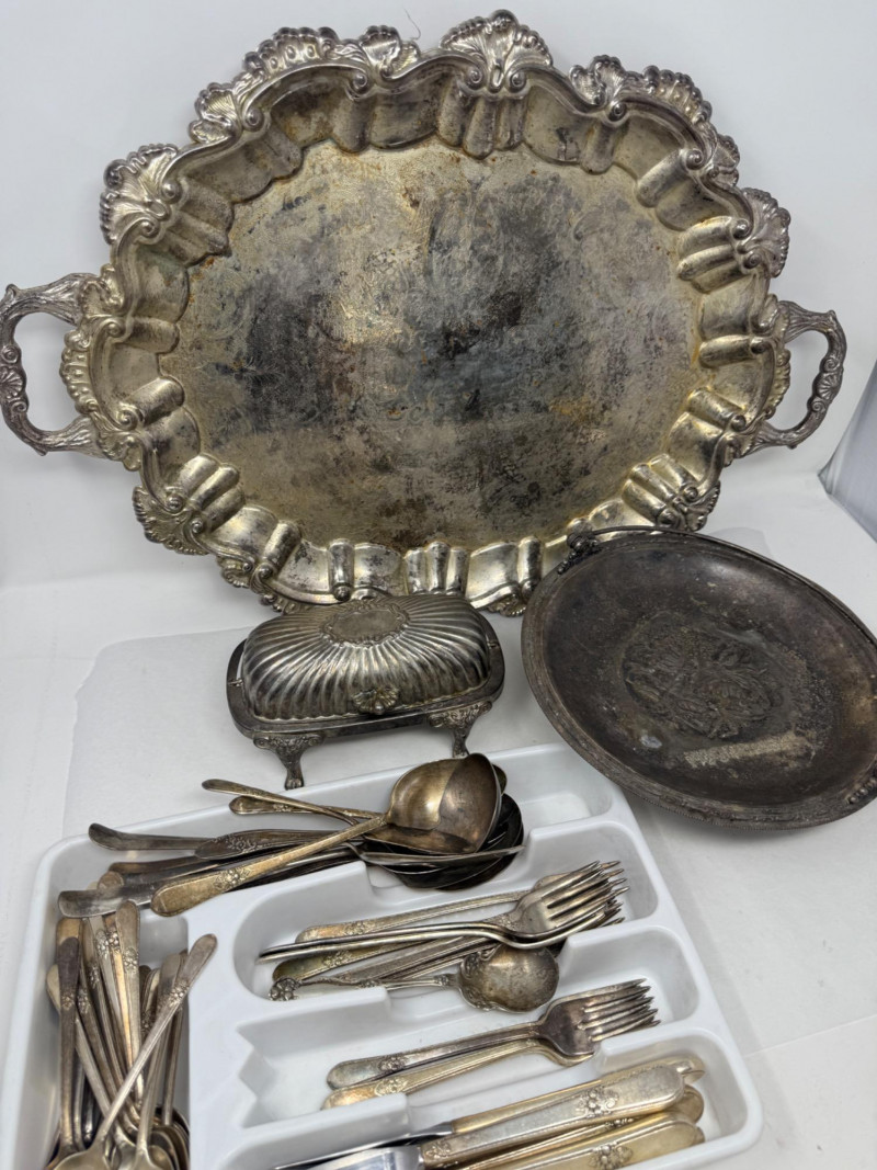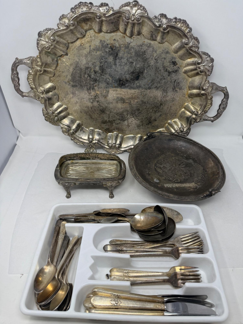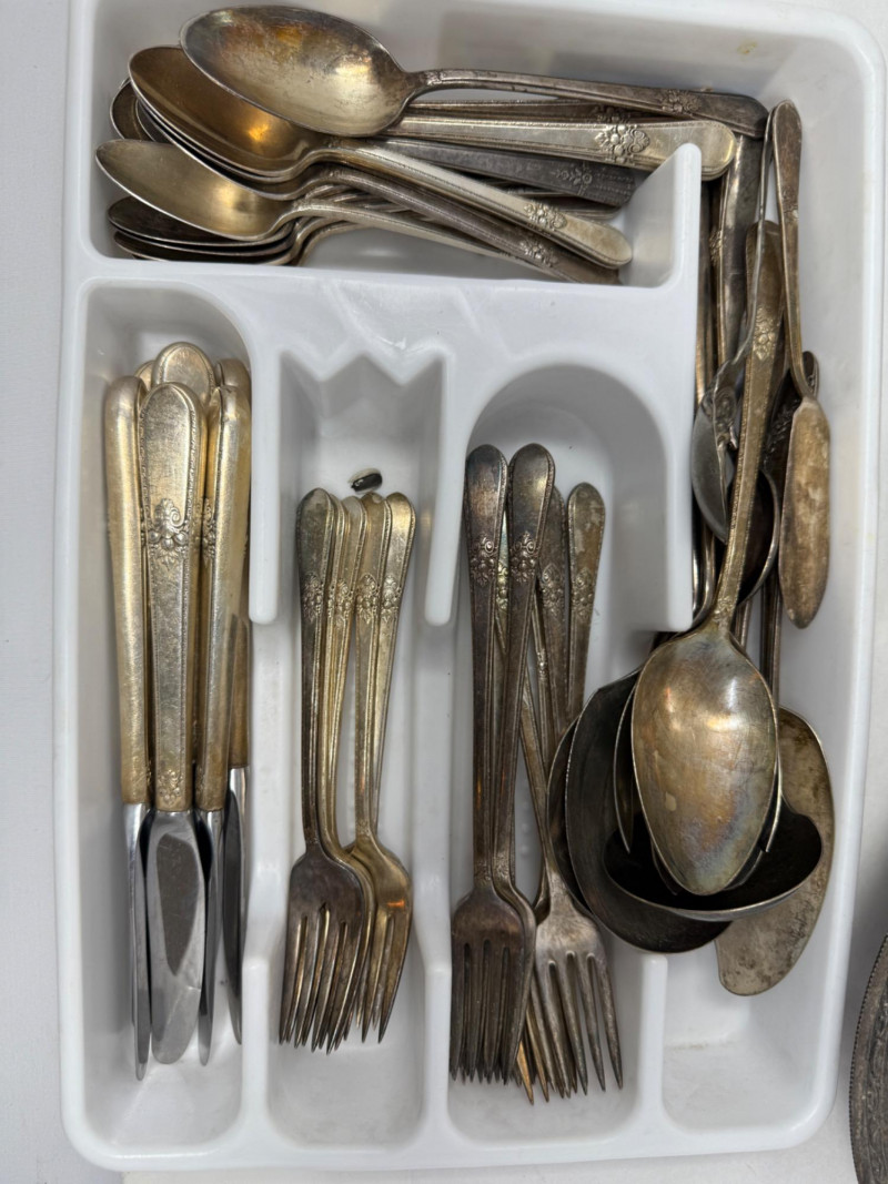 Rogers & Bros flatware 53 pieces Silverware Silver Plate Platter 22”x16” 10”x3” Footed dish with handle with one bent foot. Stamped "Forbes Silver Co. Warranted Hamilton Canada 0192"