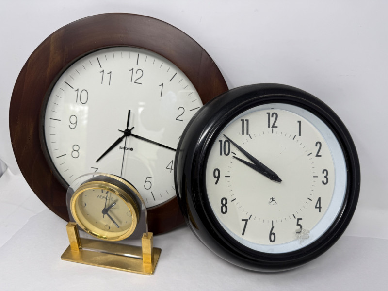 12.5” wood and 10” plastic diameter clocks. Need batteries, not tested.