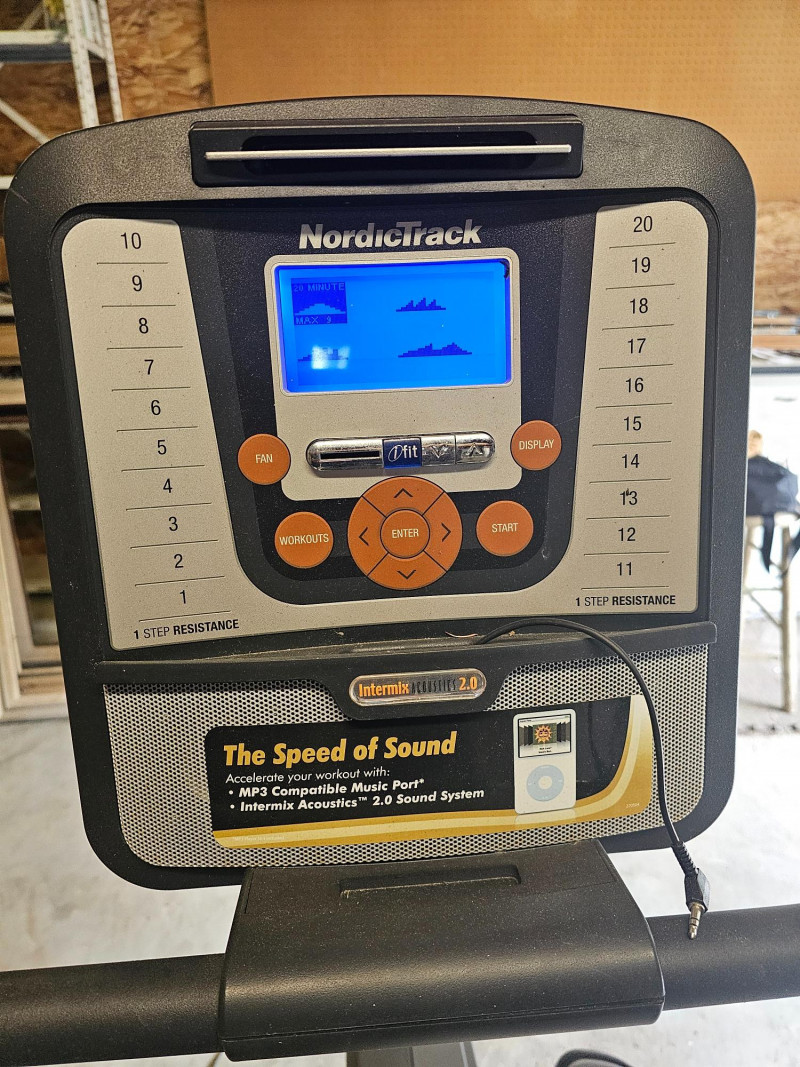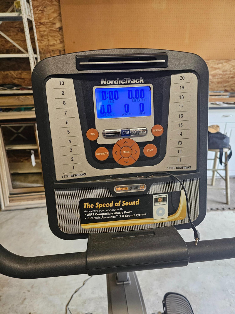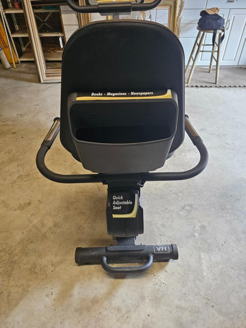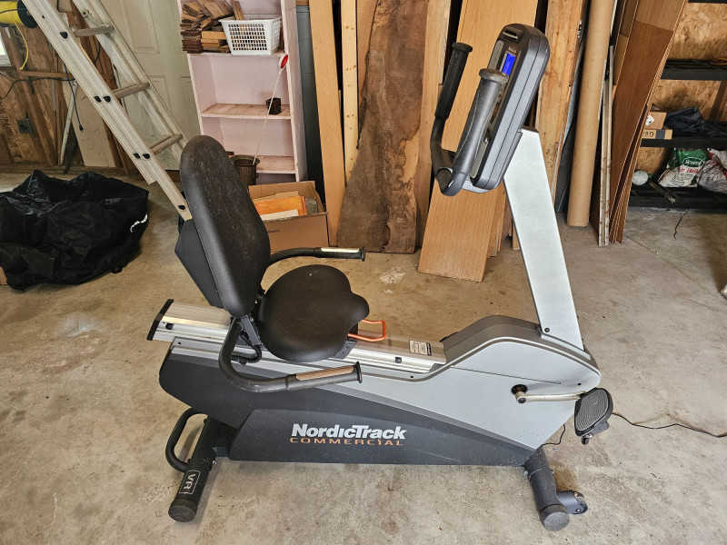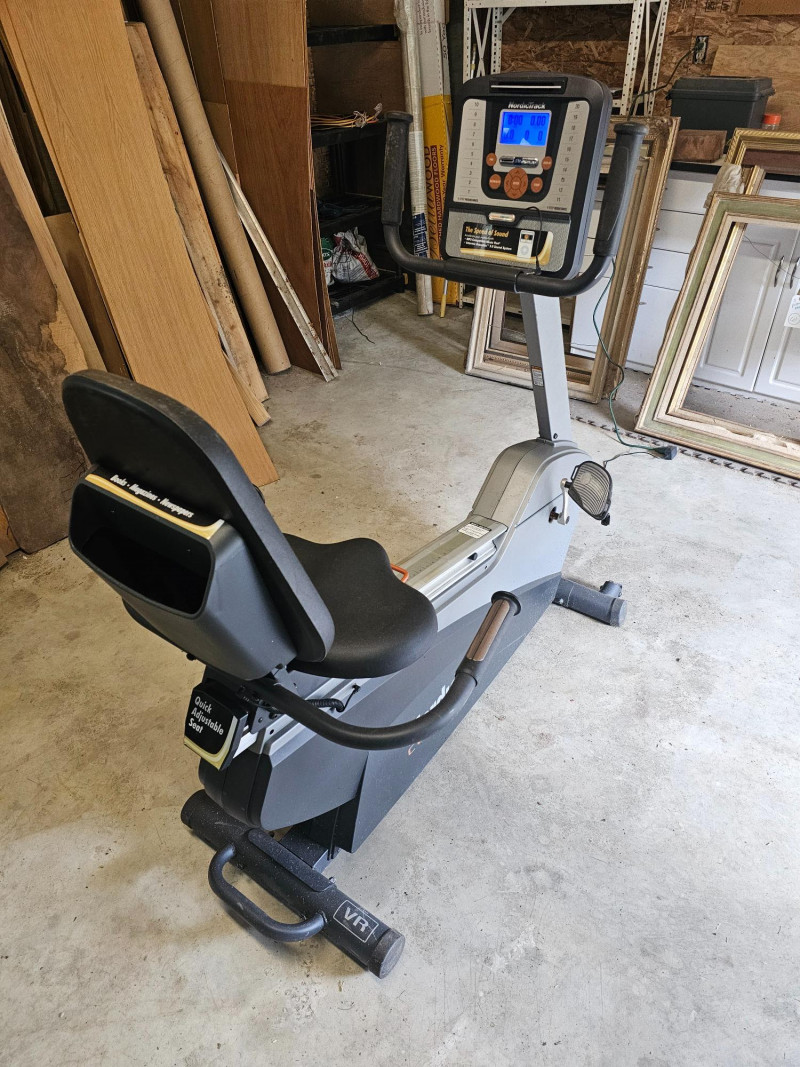 NordicTrack Commercial VR Recumbent Exercise Bike IFIT time & terrain workouts 20 different resistance programs Intermix Acoustics 2.0 Sound System with AUX port Built-in cooling fan Quick adjustable seat 2 sets of handgrip Comfort-padded seat Magazine/book rack built-in behind seat Good used condition, could use a wipe down Tested - Works! 55"T x 57"L x 27"W