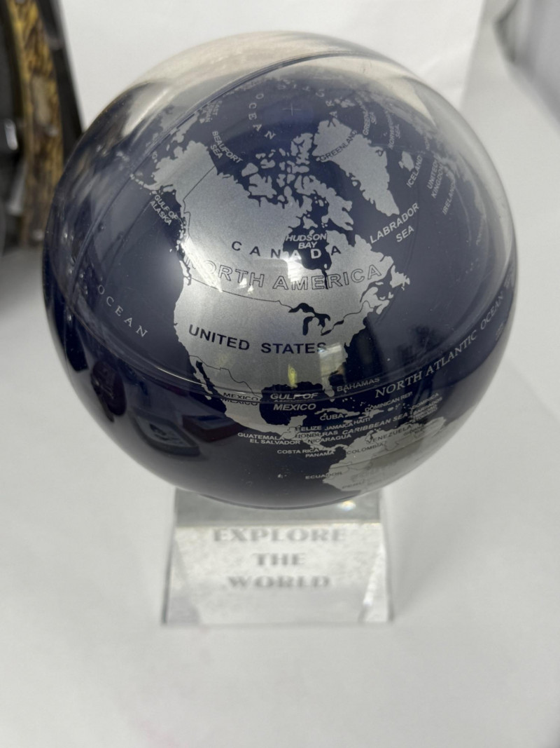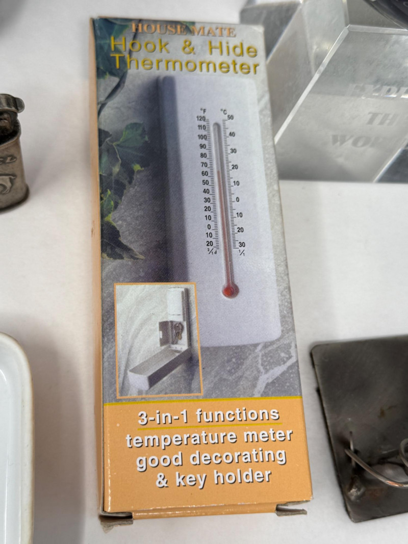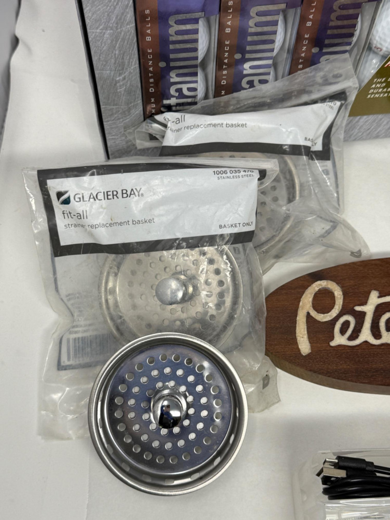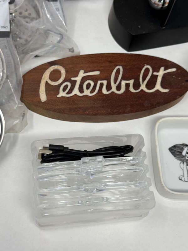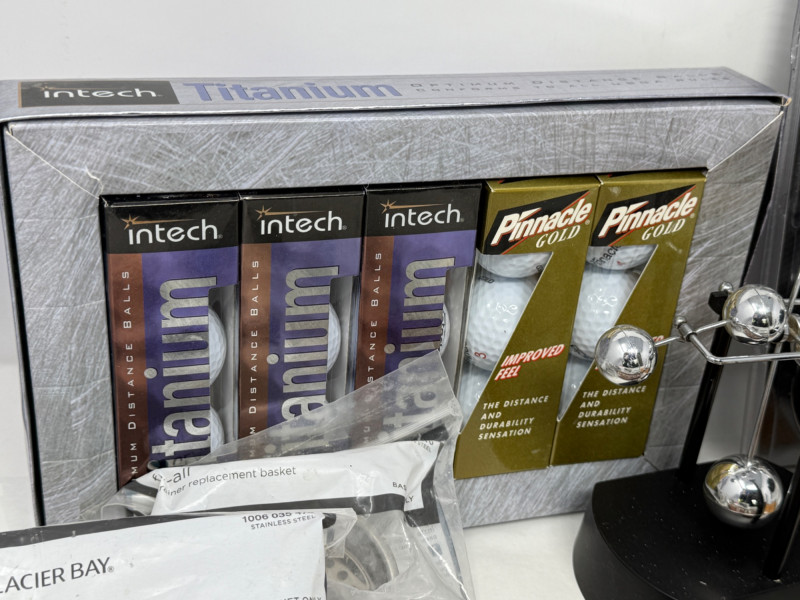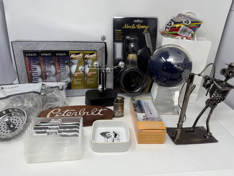 5 sleeves of golf balls with tees Hide a key thermometer straight edge shaving kit 3 sink strainers Fishing statue Kinetic movement toy Hand made Peterbilt sign Magnifying lenses Floating globe on pedestal Mini metal Camel lighter Ring dish with roaring lioness
