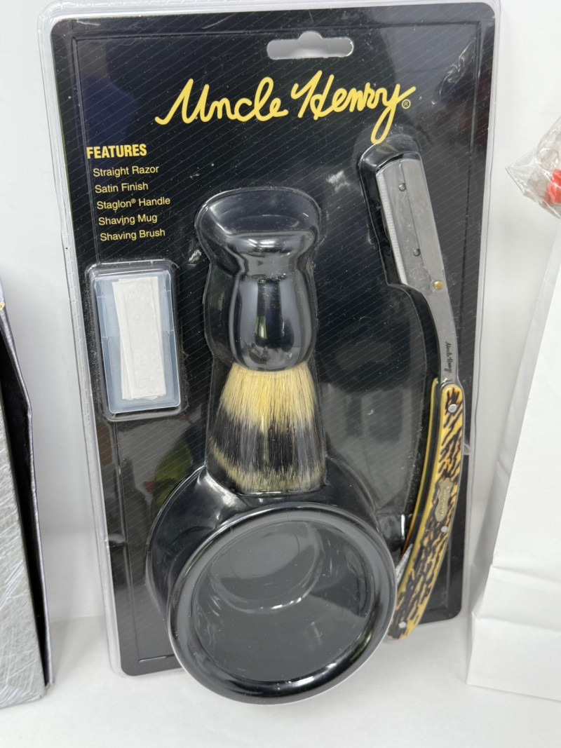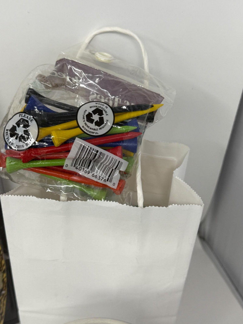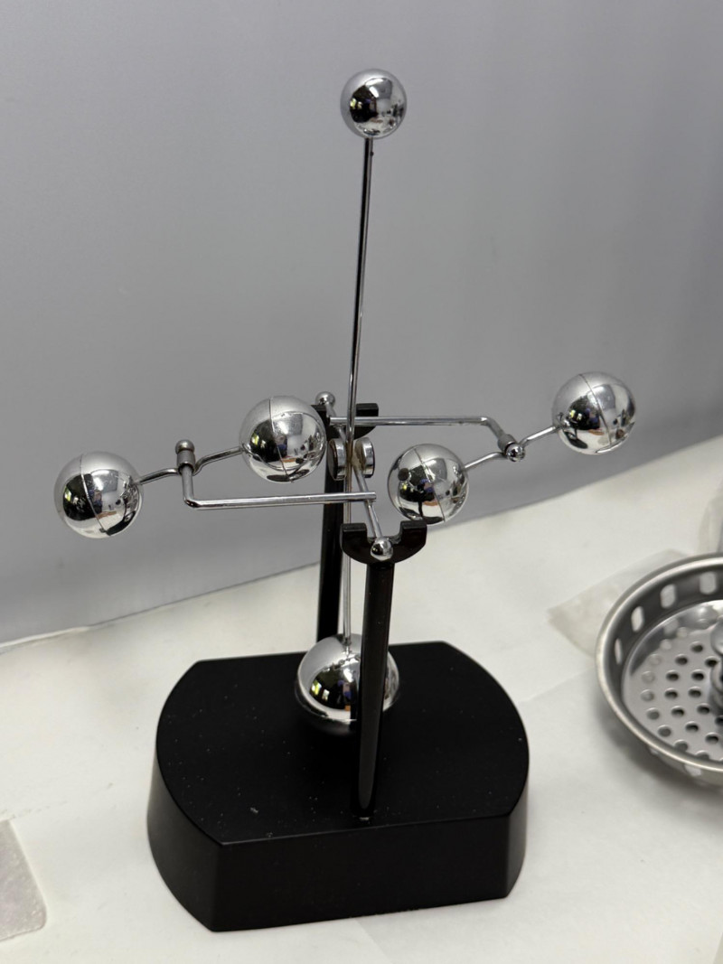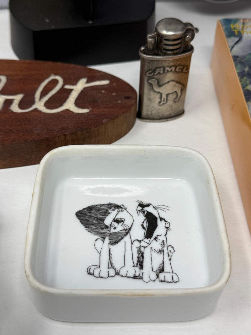 5 sleeves of golf balls with tees Hide a key thermometer straight edge shaving kit 3 sink strainers Fishing statue Kinetic movement toy Hand made Peterbilt sign Magnifying lenses Floating globe on pedestal Mini metal Camel lighter Ring dish with roaring lioness