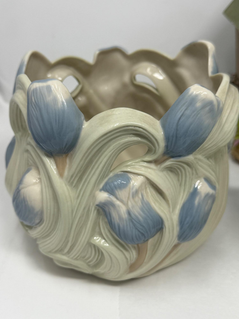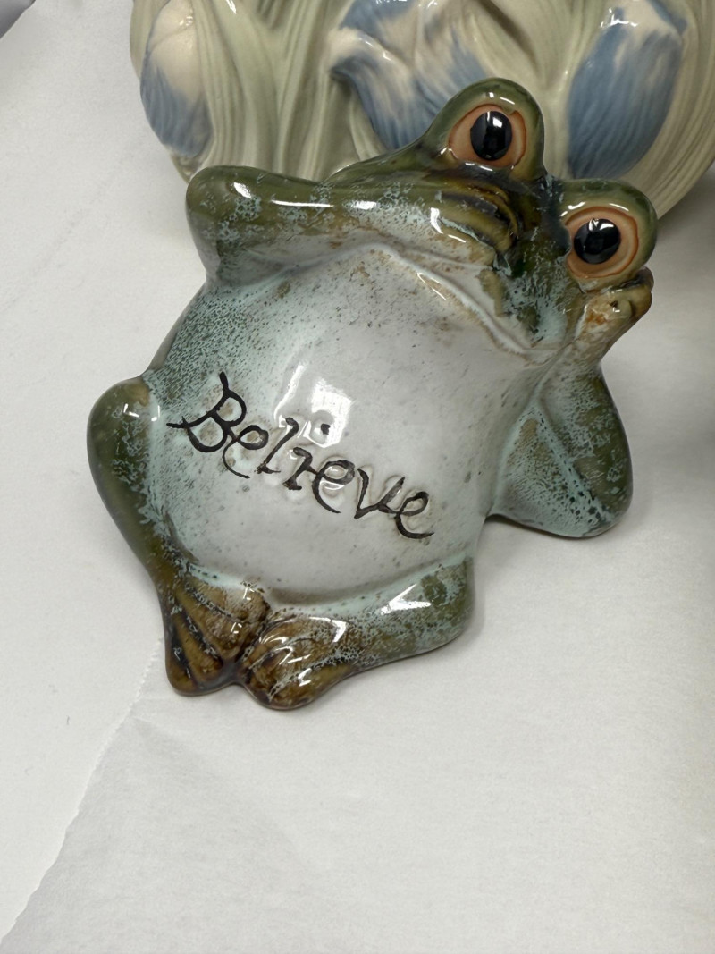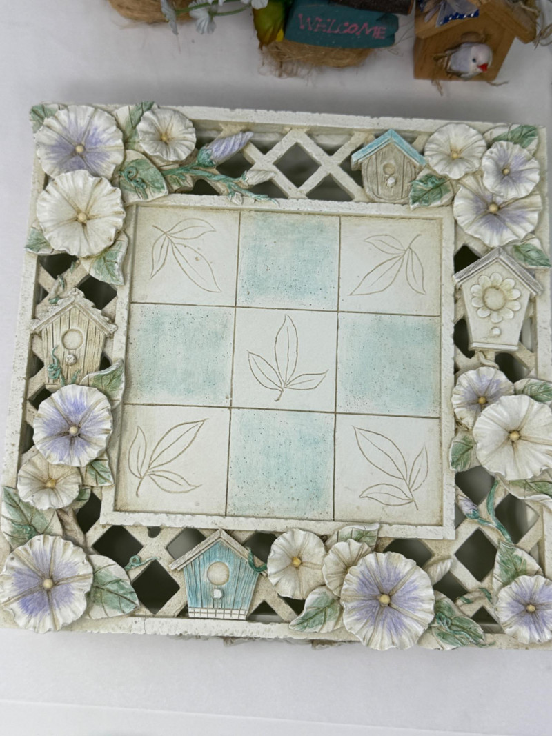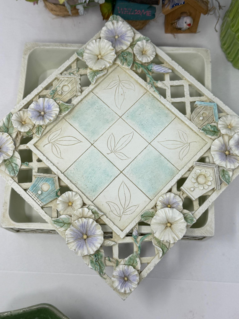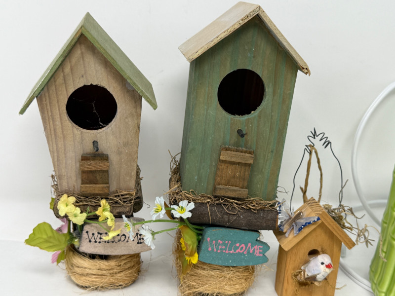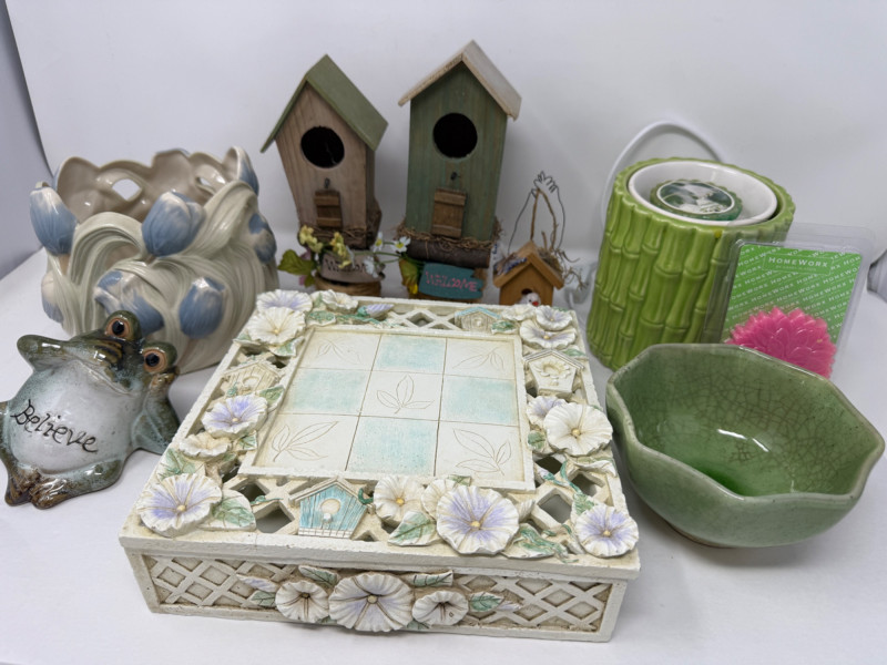 Small birdhouses, hand painted glazed ceramic blue tulip bowl signed RS. Bamboo design wax warmer, a believing frog, ceramic bowl and 12'12' resin box.