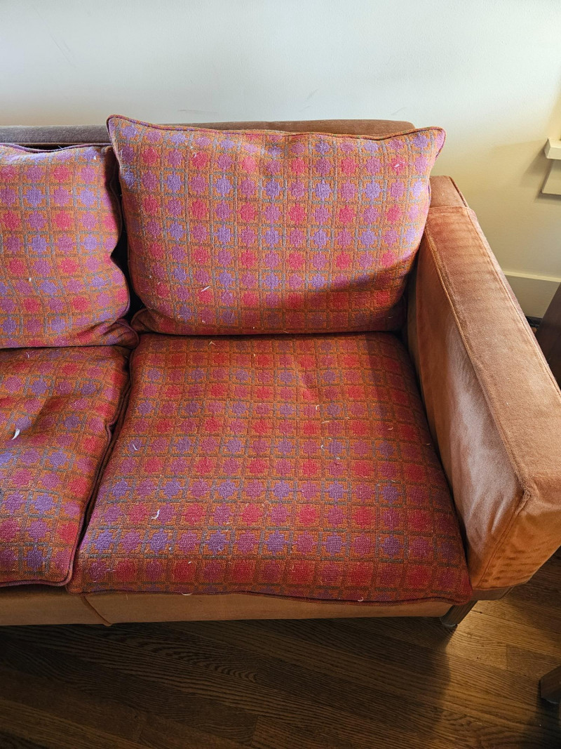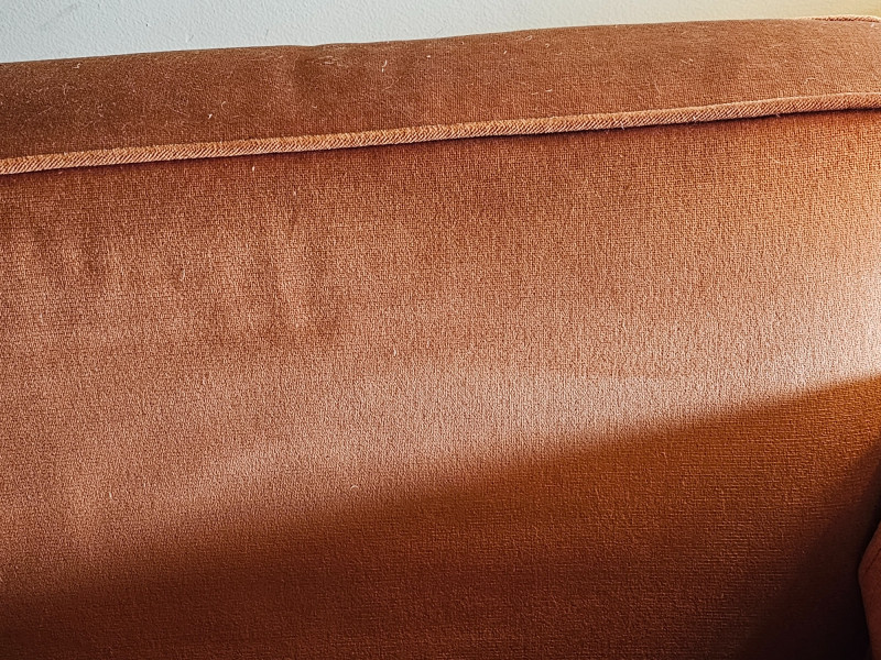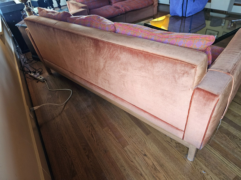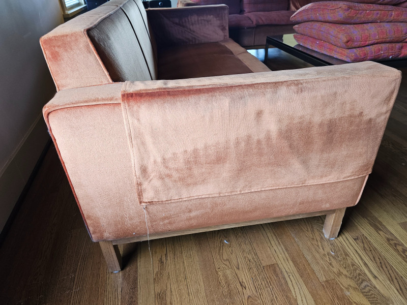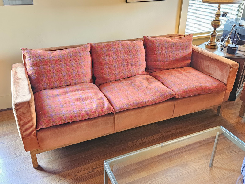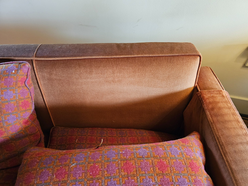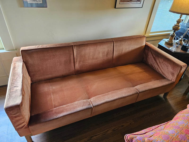 MCM Custom-Made Orange Velour Couch Beautiful low-back Mid Century Modern couch with solid oak frame Couch is in good shape but the comfortable patterned cushions are in need of replacement (the white marks on the cushions are feathers from the down filling) 28.5"T x 80"W x 35"D Matching loveseat available in Lot #7
