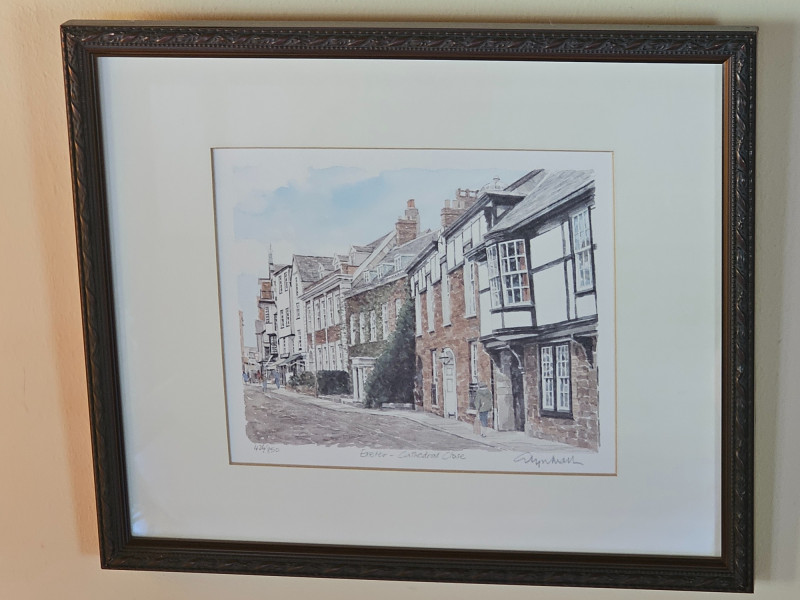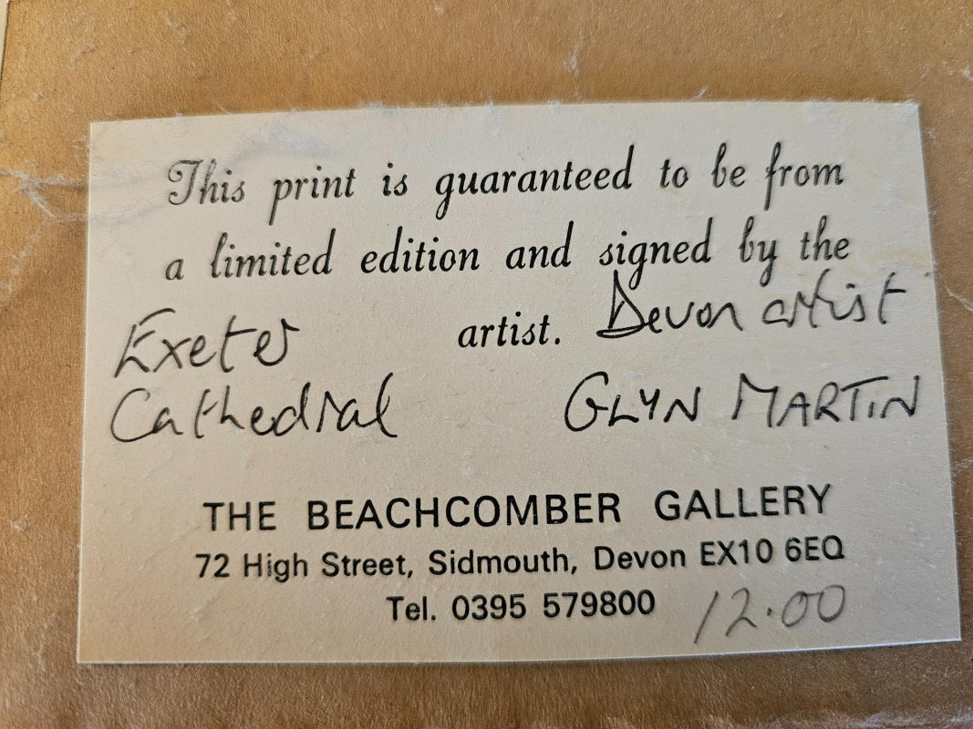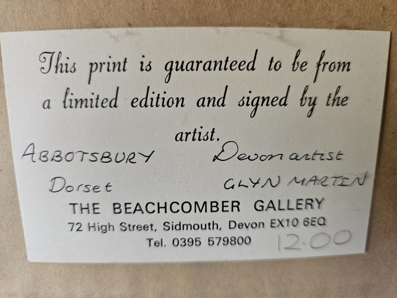 (2) Hand-Signed & Numbered Prints By Glyn Martin Glyn Martin is a Devon artist known for his watercolors of towns & buildings in Britain, France, America, Holland & Belgium "Abbotsbury, Dorset" by Glyn Martin Limited edition No.128/850 Hand-signed by the artist "Exeter Cathedral" by Glyn Martin Limited Edition No. 426/850 Hand-signed by the artist Both professionally framed & matted and are 11"T x 13"W