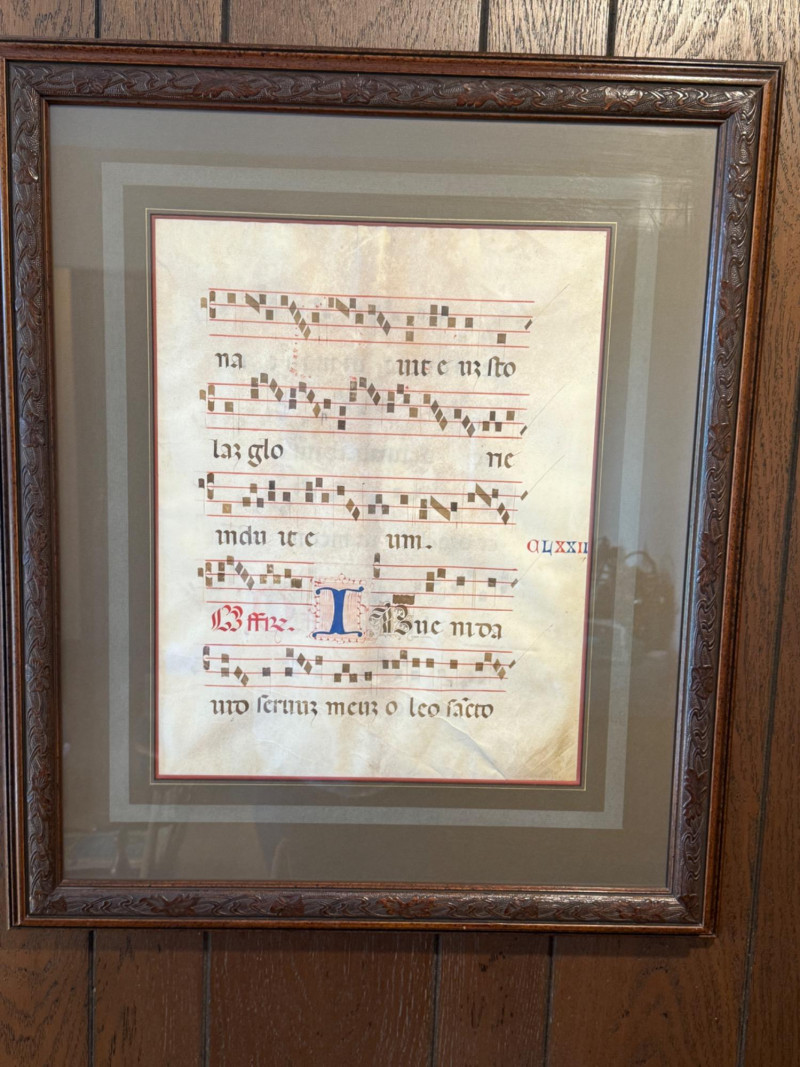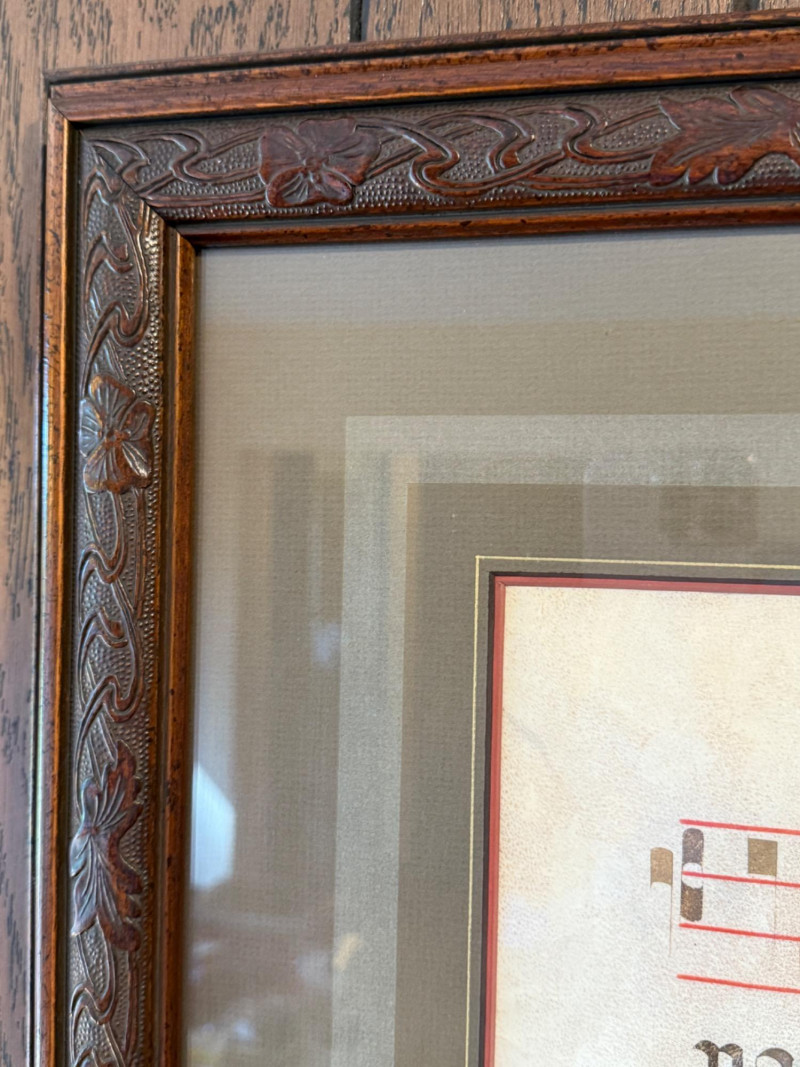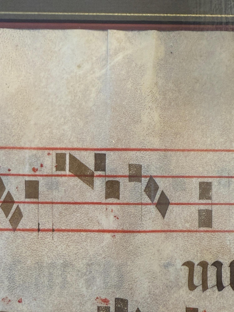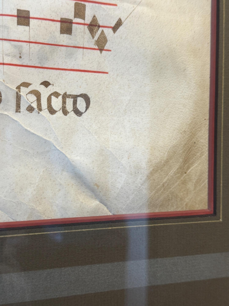 Art simulating Latin Gregorian mass chants on vellum. Appears to have either a second side or another sheet behind. See photos Very nicely framed at 24.5”x29”