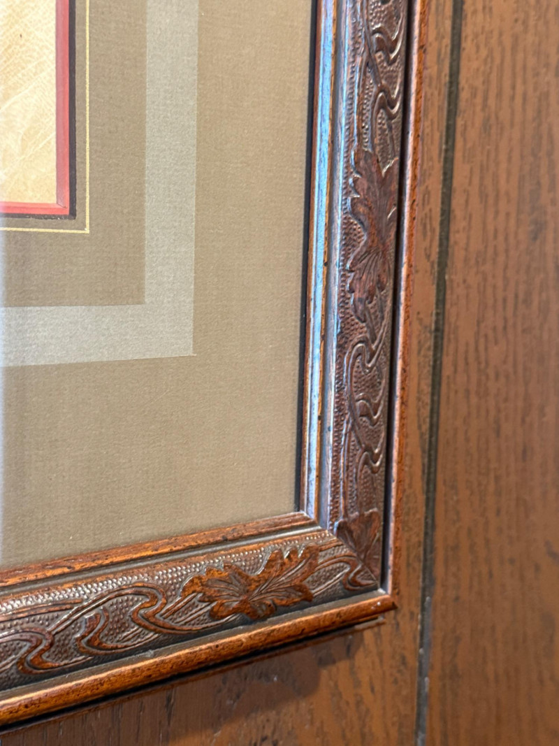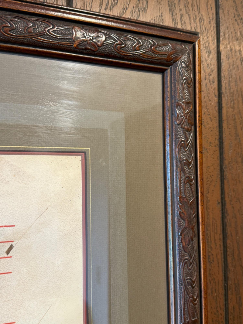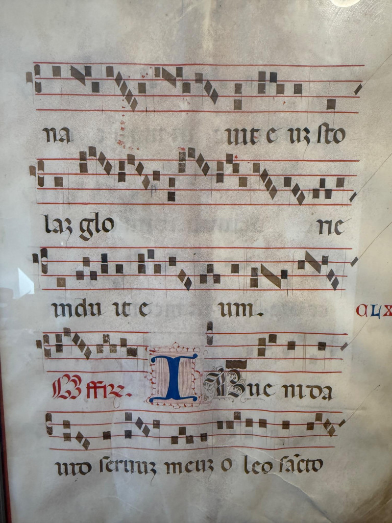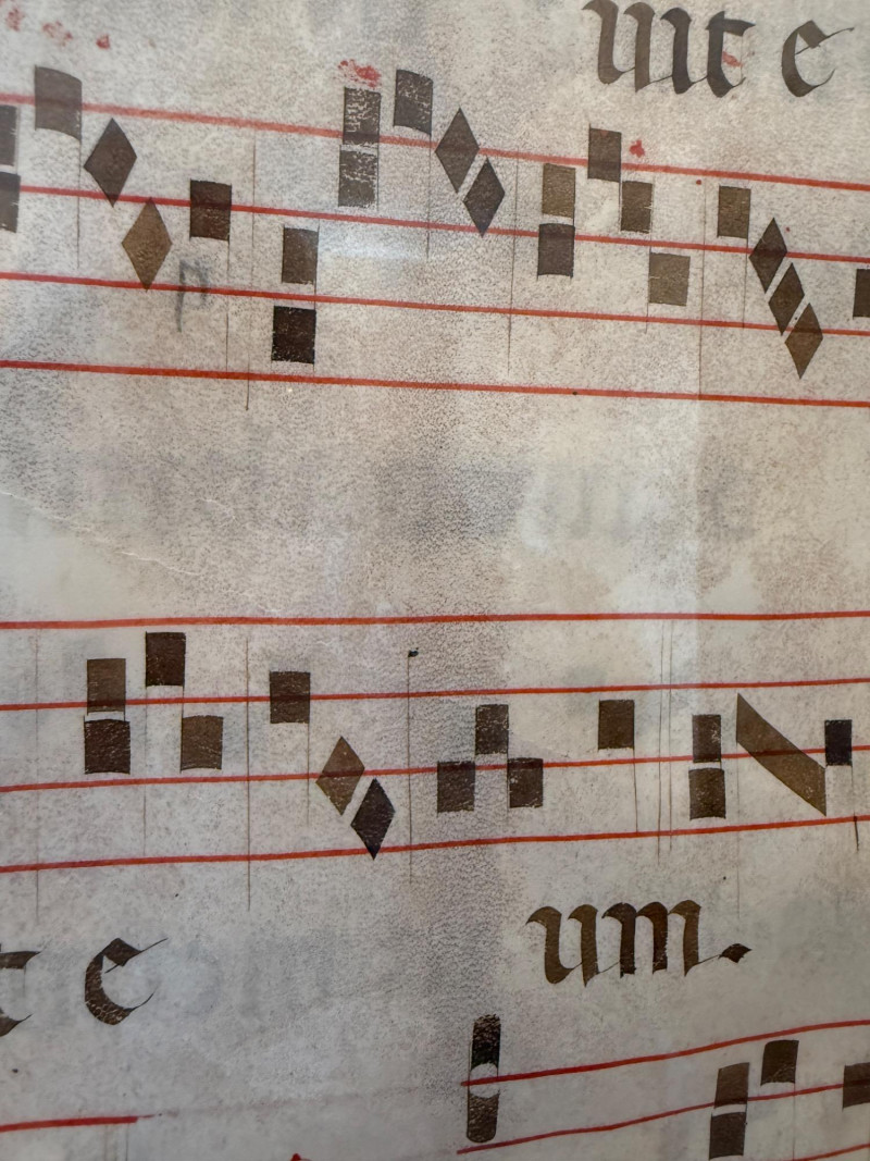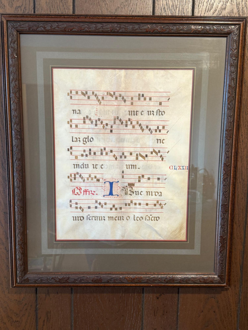 Art simulating Latin Gregorian mass chants on vellum. Appears to have either a second side or another sheet behind. See photos Very nicely framed at 24.5”x29”