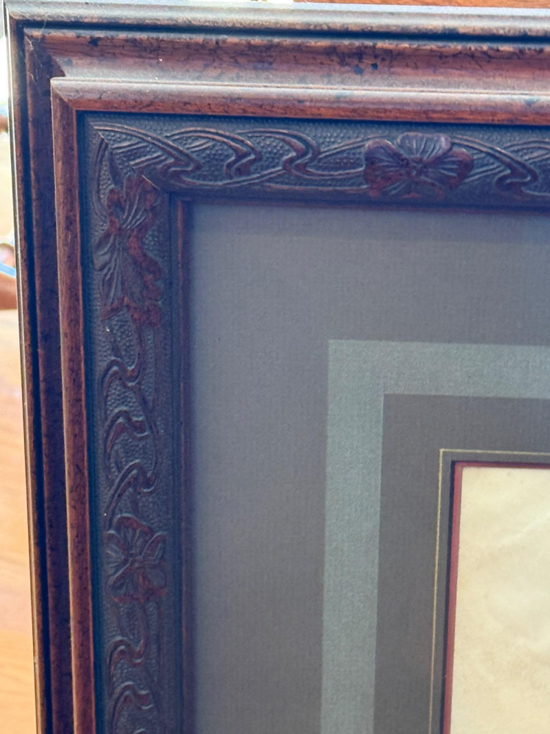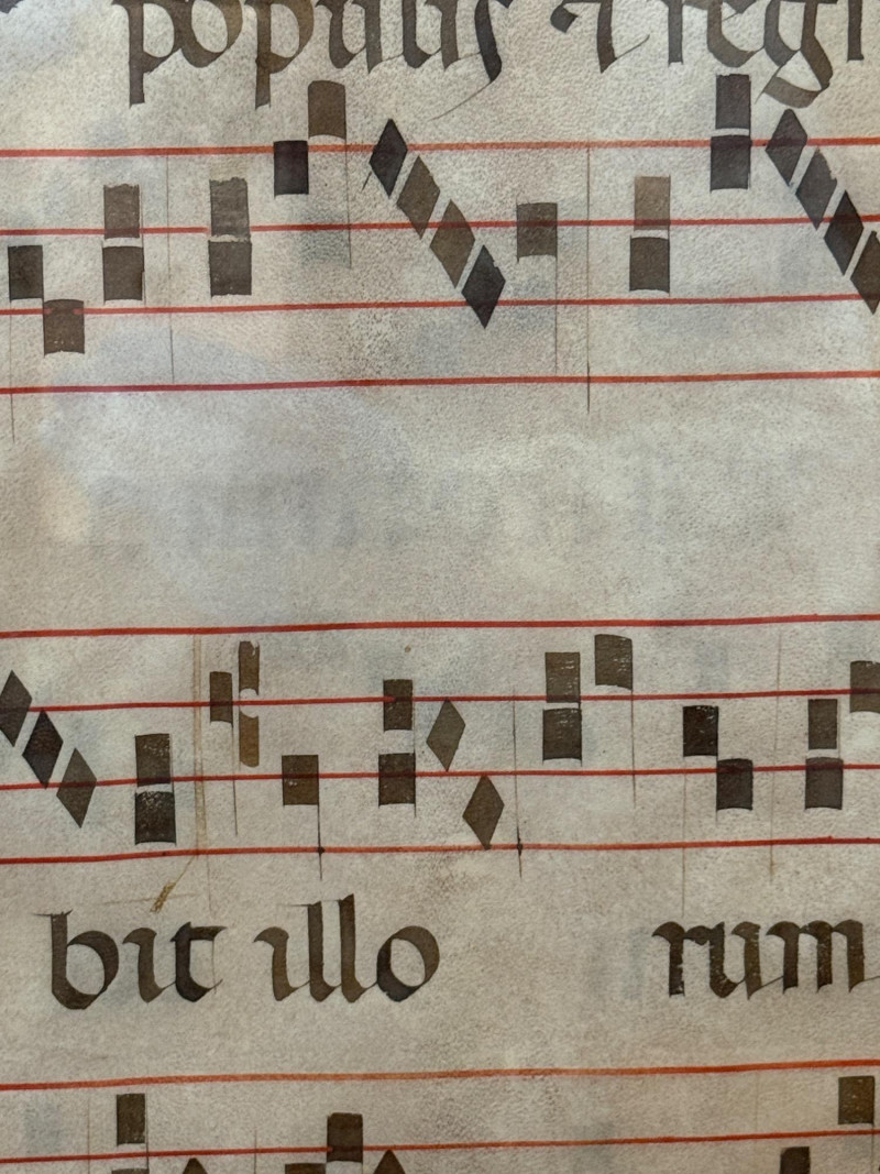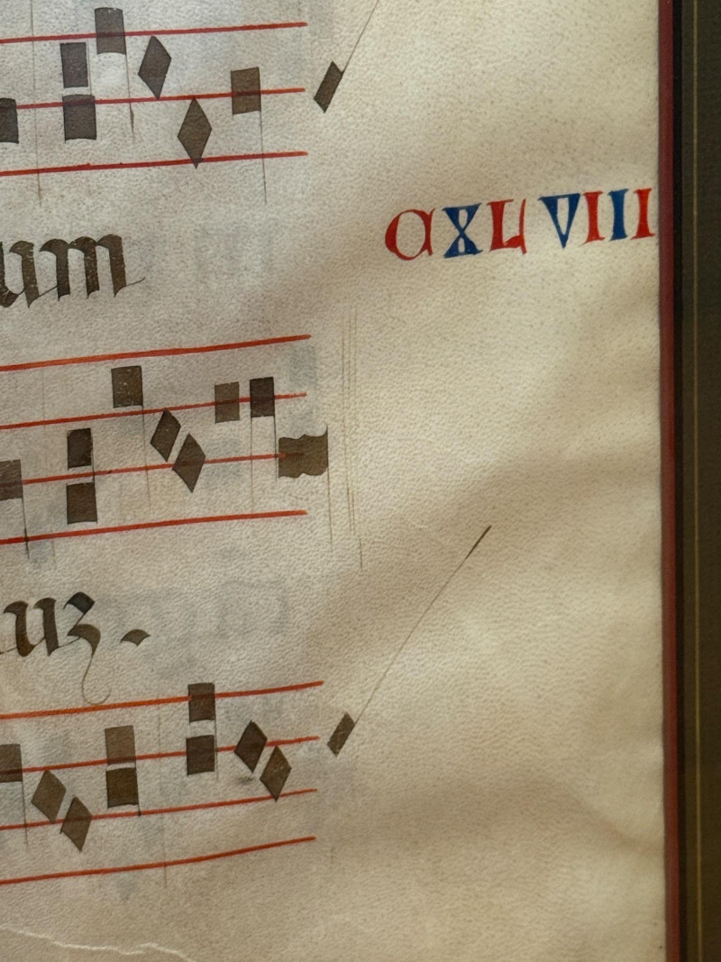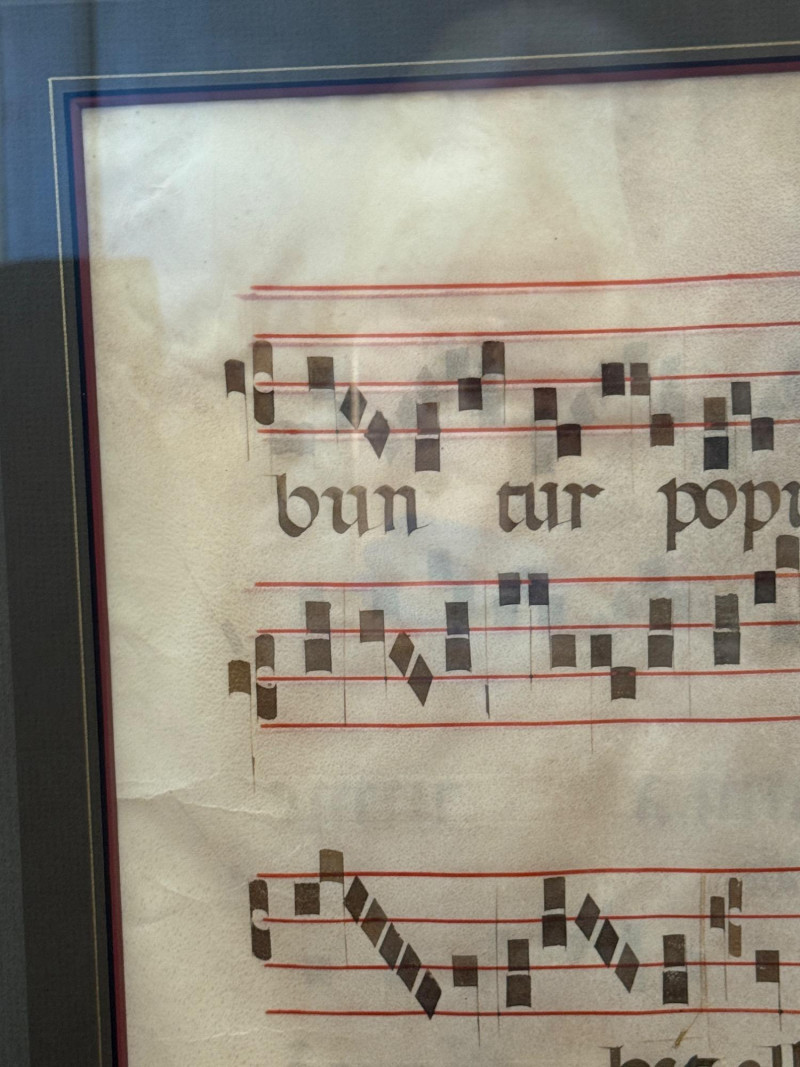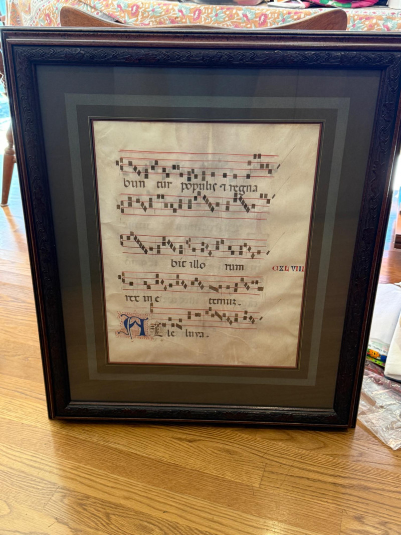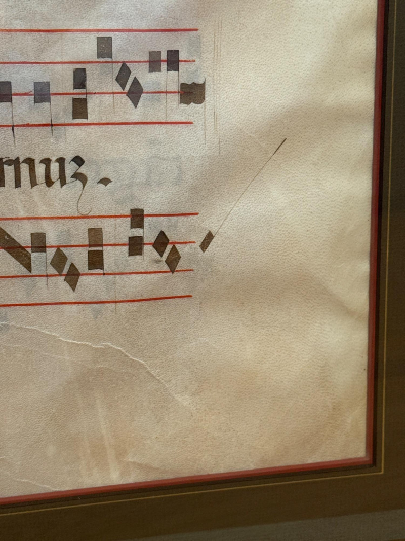 Art simulating Latin Gregorian mass chants on vellum. Appears to have either a second side or another sheet behind. See photos Very nicely framed at 24.5”x29”
