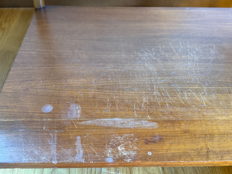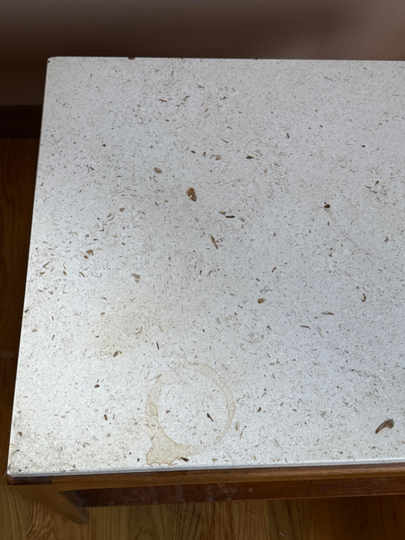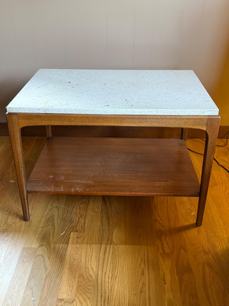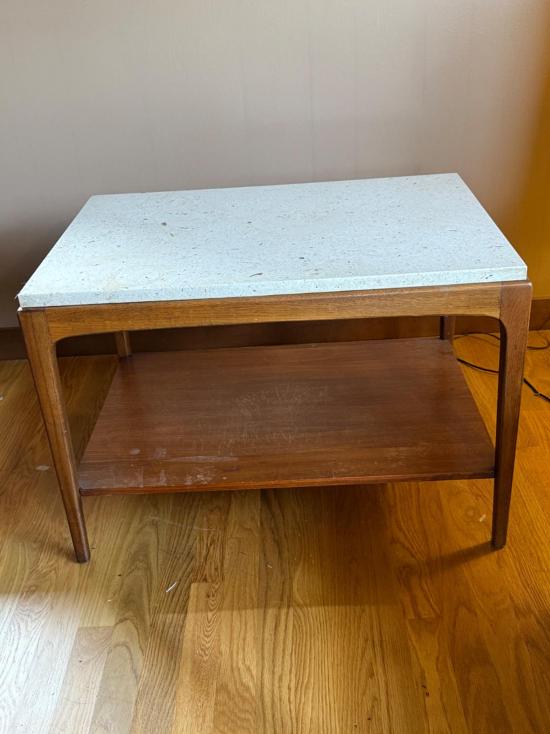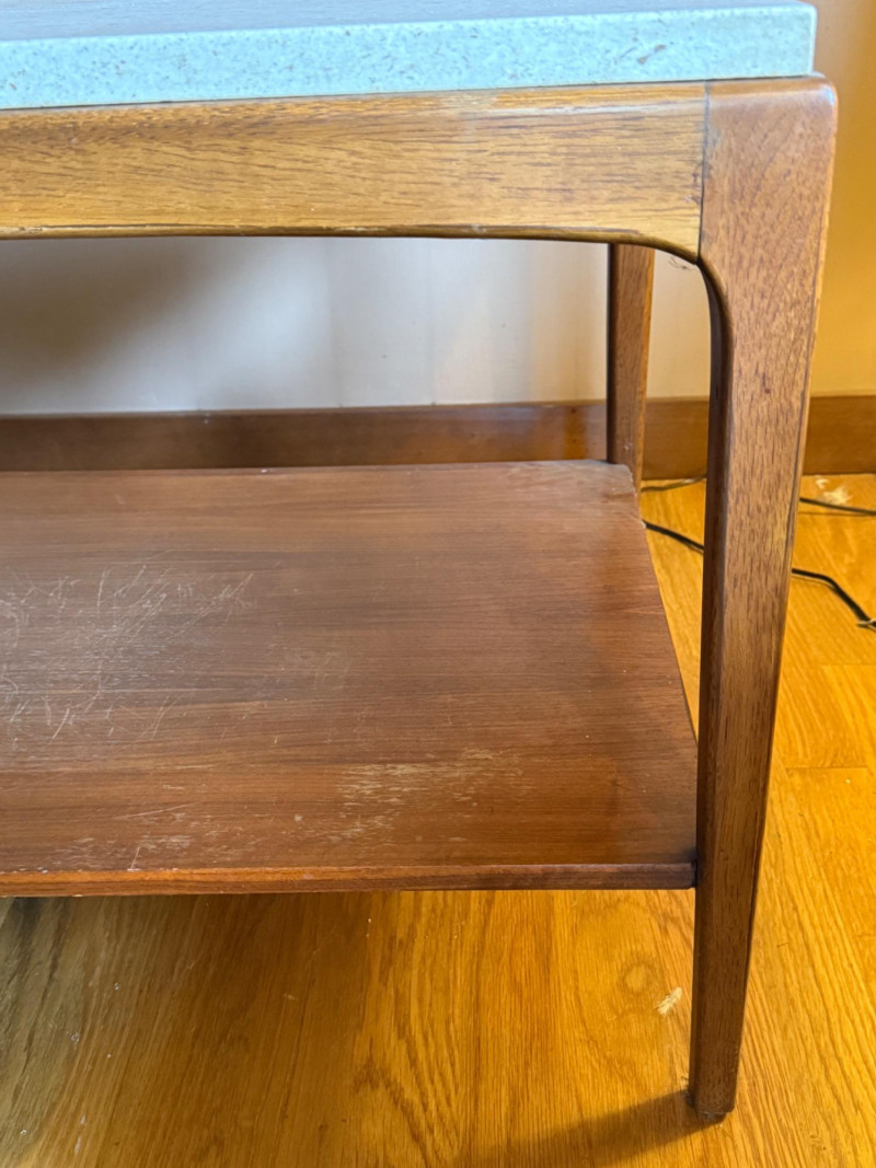 MCM Lane Walnut and Travertine End or Side Table. 29.5”x20.5”x20.25” Surface scuffs on shelf.