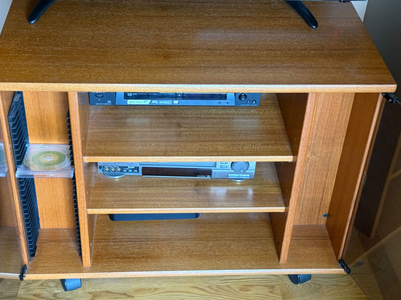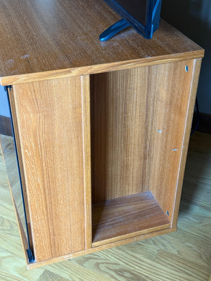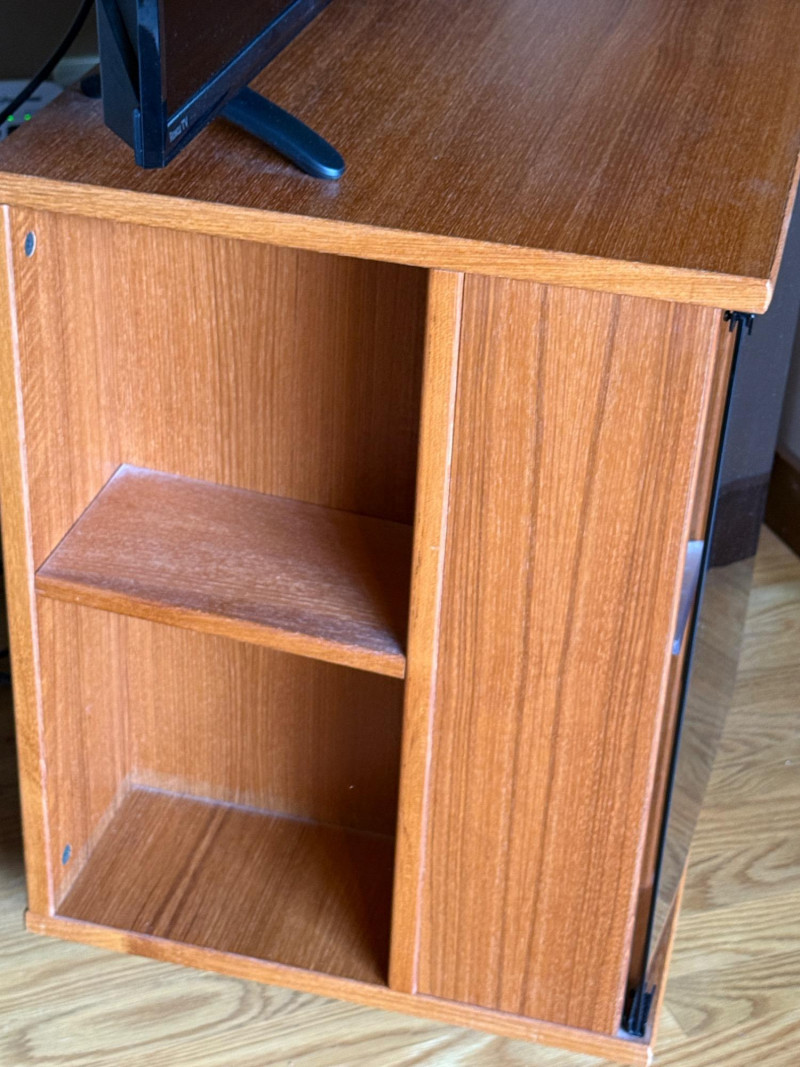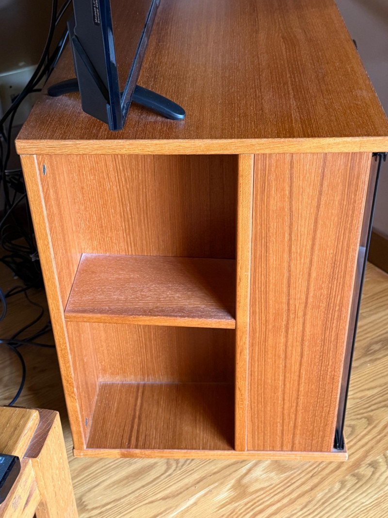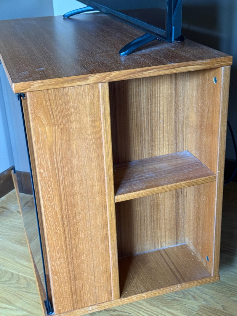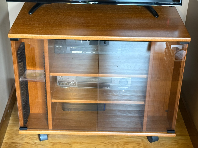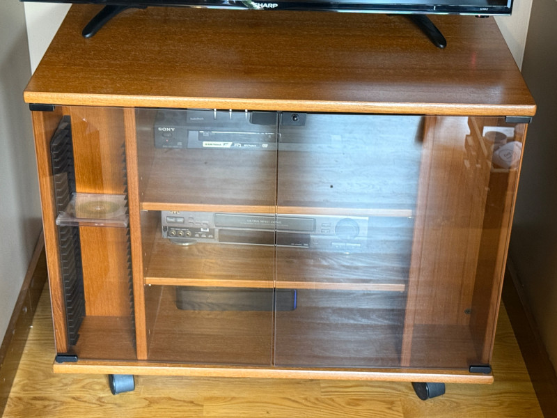Small Rolling Glass Door AV Cart Measures 33”x18”x25”.
