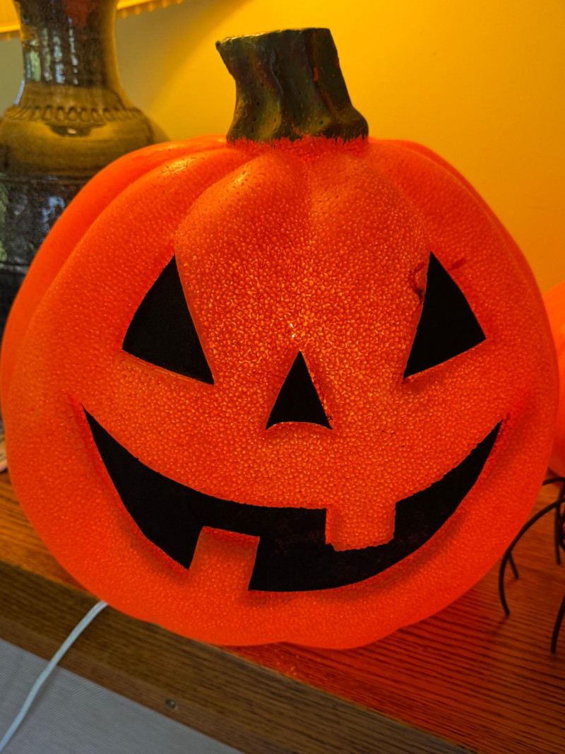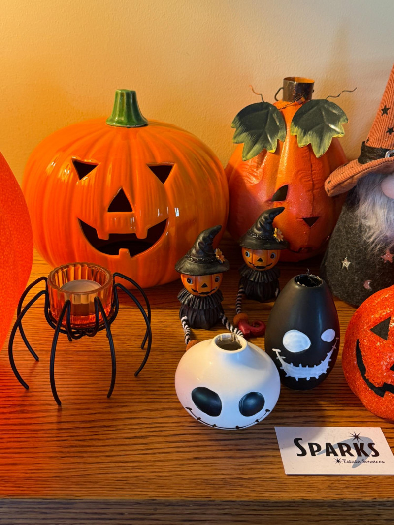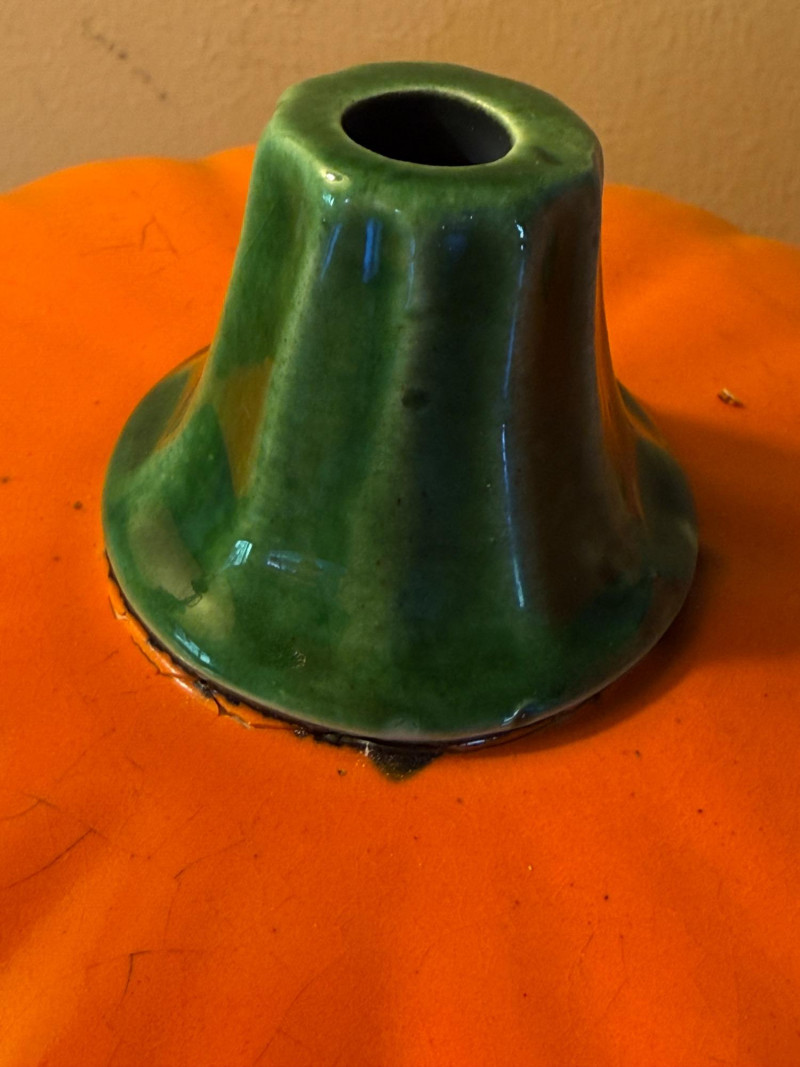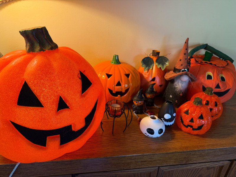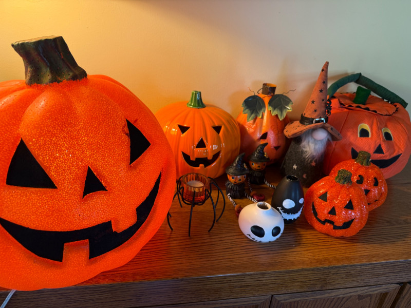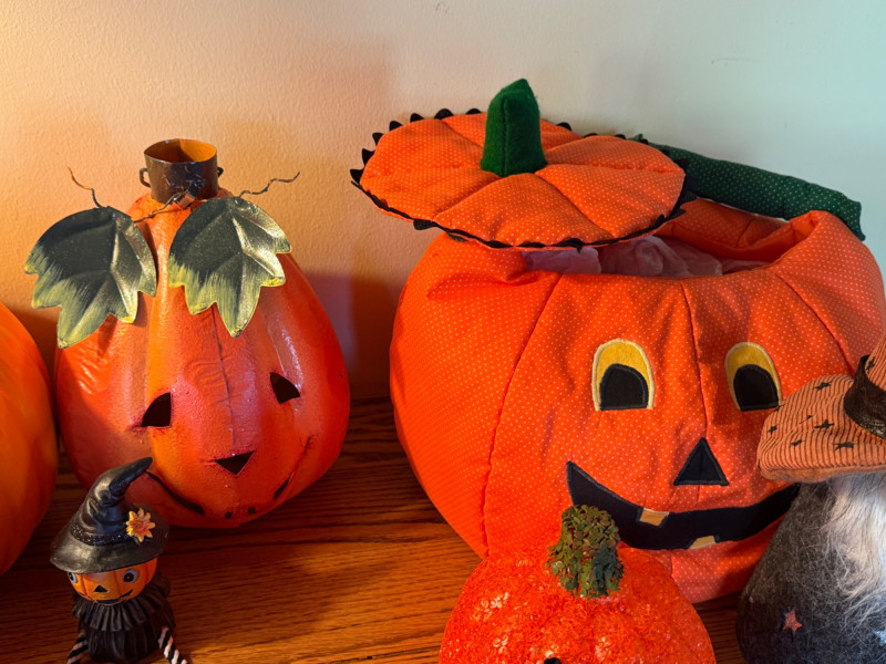 Largest lighted Jack is 14”x15” 10” Ceramic with open base for candle. Stem disconnected when moving, will need glue. Metal with leaves Quilted handle, perfect for trick or treating. Gnome