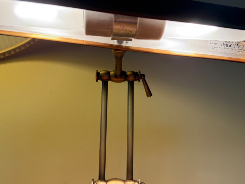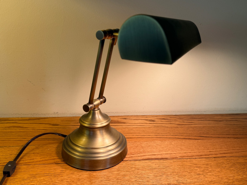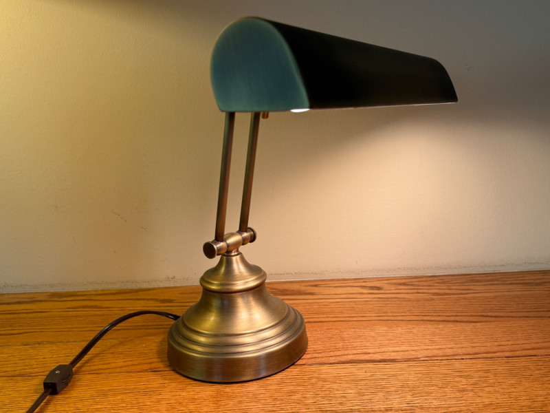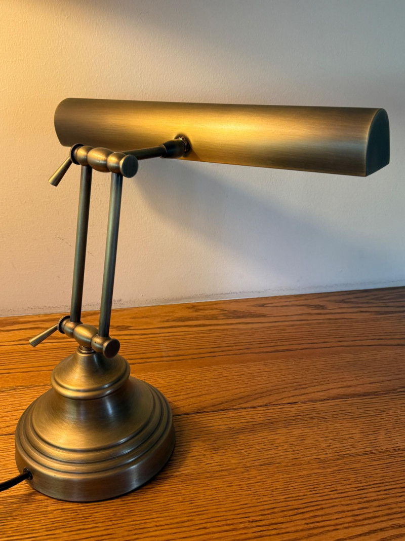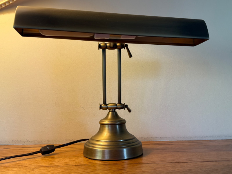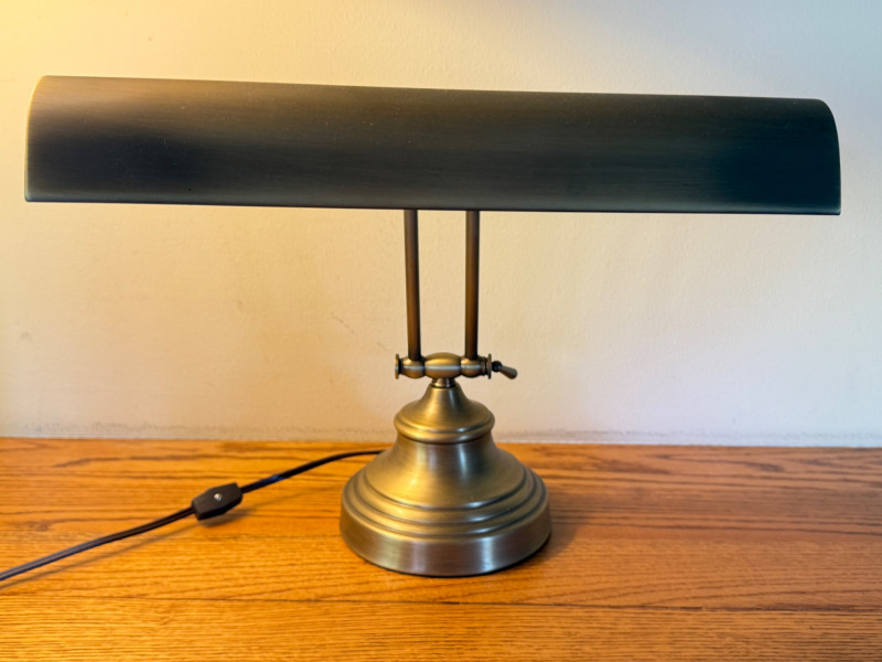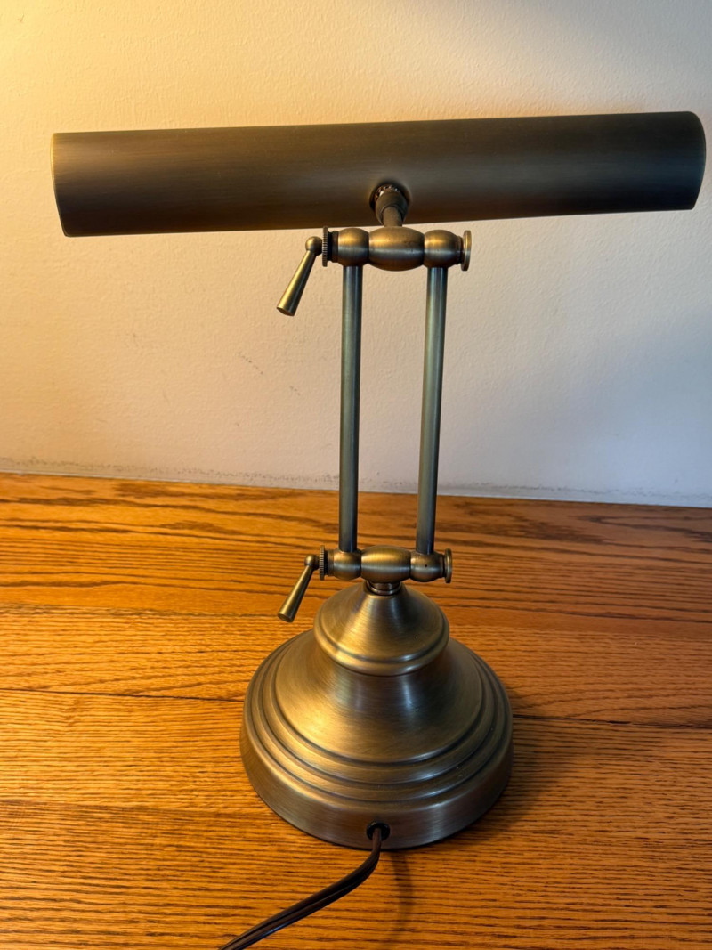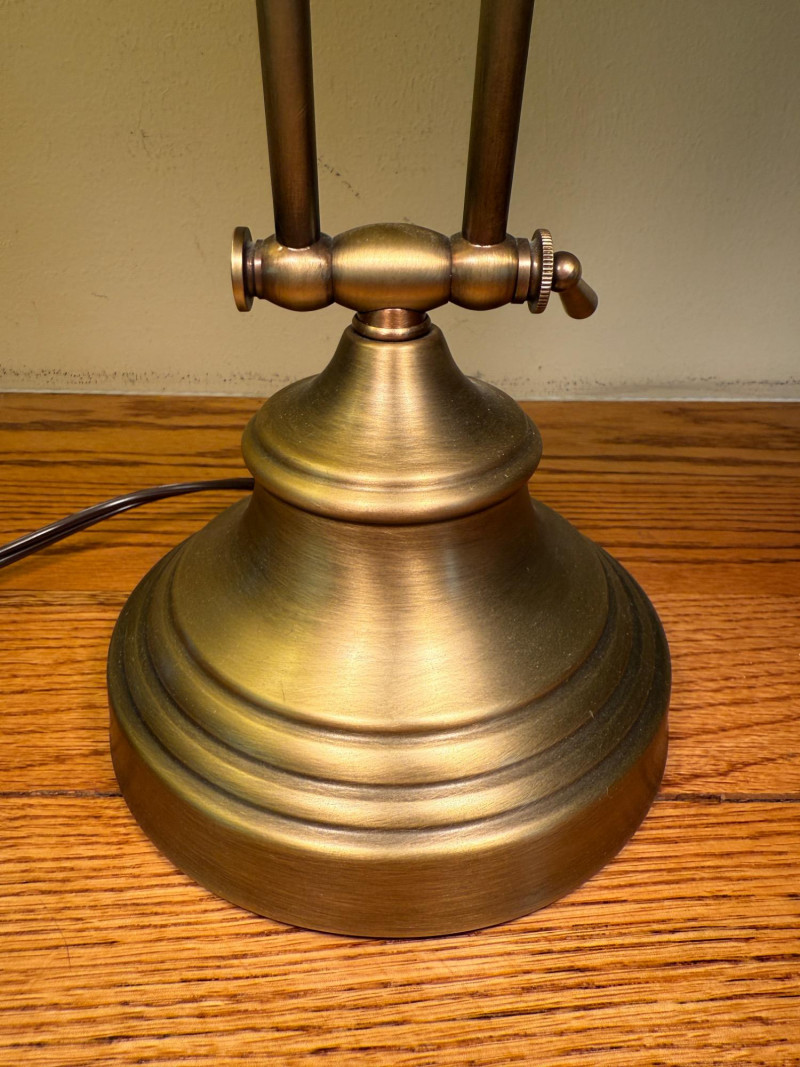 Heavy Antique Brass Bankers Lamp is 14” wide with adjustable height. In very good condition.