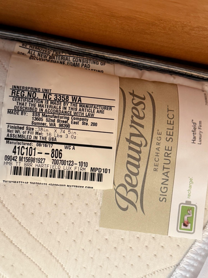 Lot # 71 - Twin Bed Frame Beautyrest Luxury Firm Mattress & Bedding
