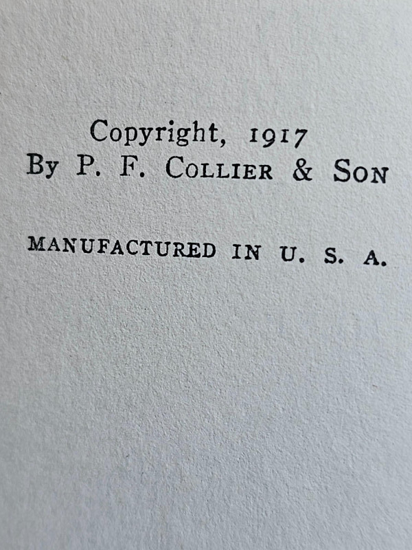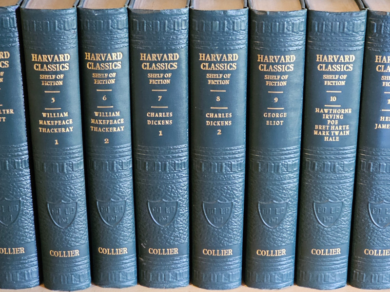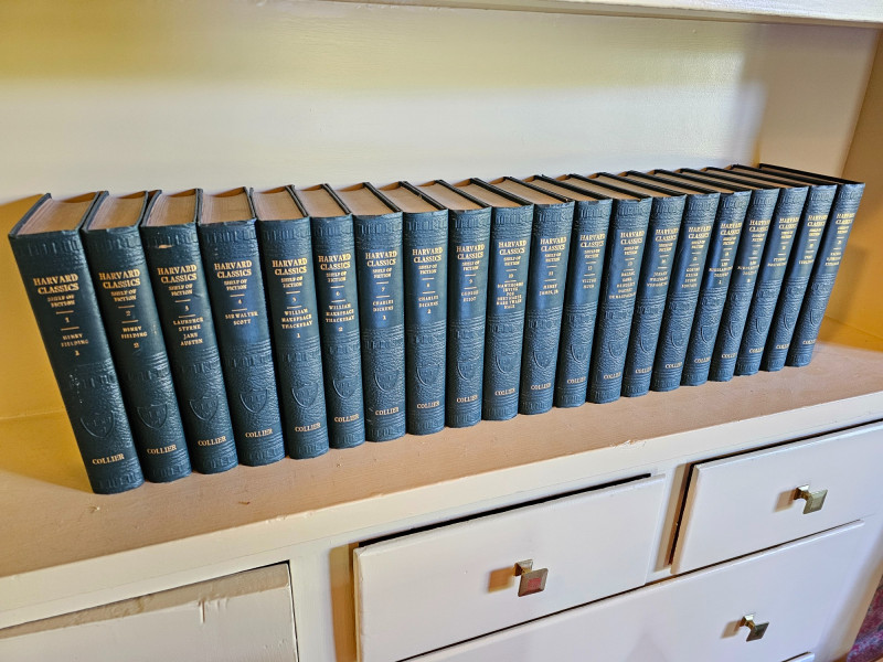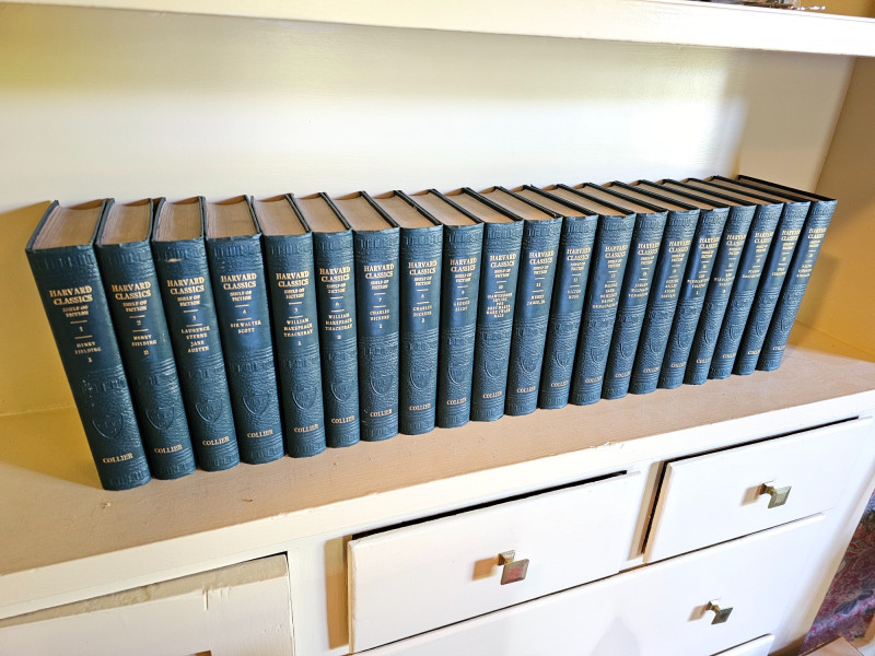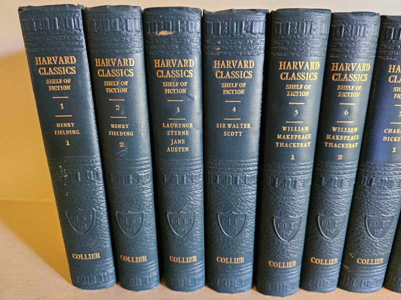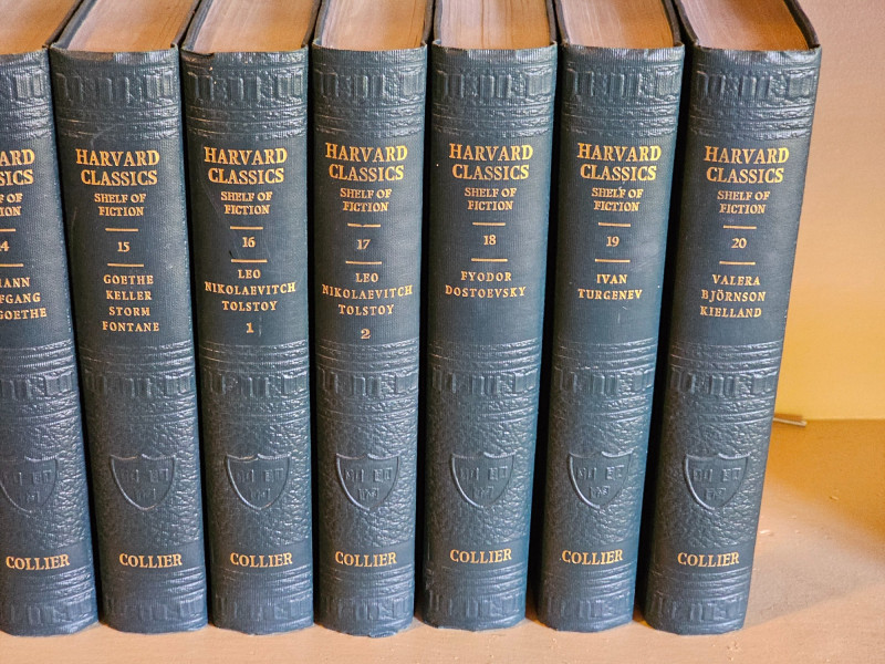 Complete 20 Volume Set Of Harvard Classics: Shelf Of Fiction Famous literary works from some of greatest authors in history! All books have page: Copyright, 1917 by P.F. Collier & Sons, Manufactured In U.S.A. Very nice set of old books Embossed spines and gold lettering in great condition (see pics for Volume 1 condition) Pages & illustrations appear crisp & clean Shelf kept and proudly displayed, these books would make a nice edition to a classic library.
