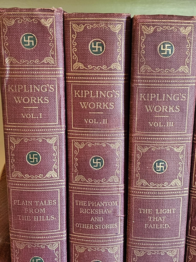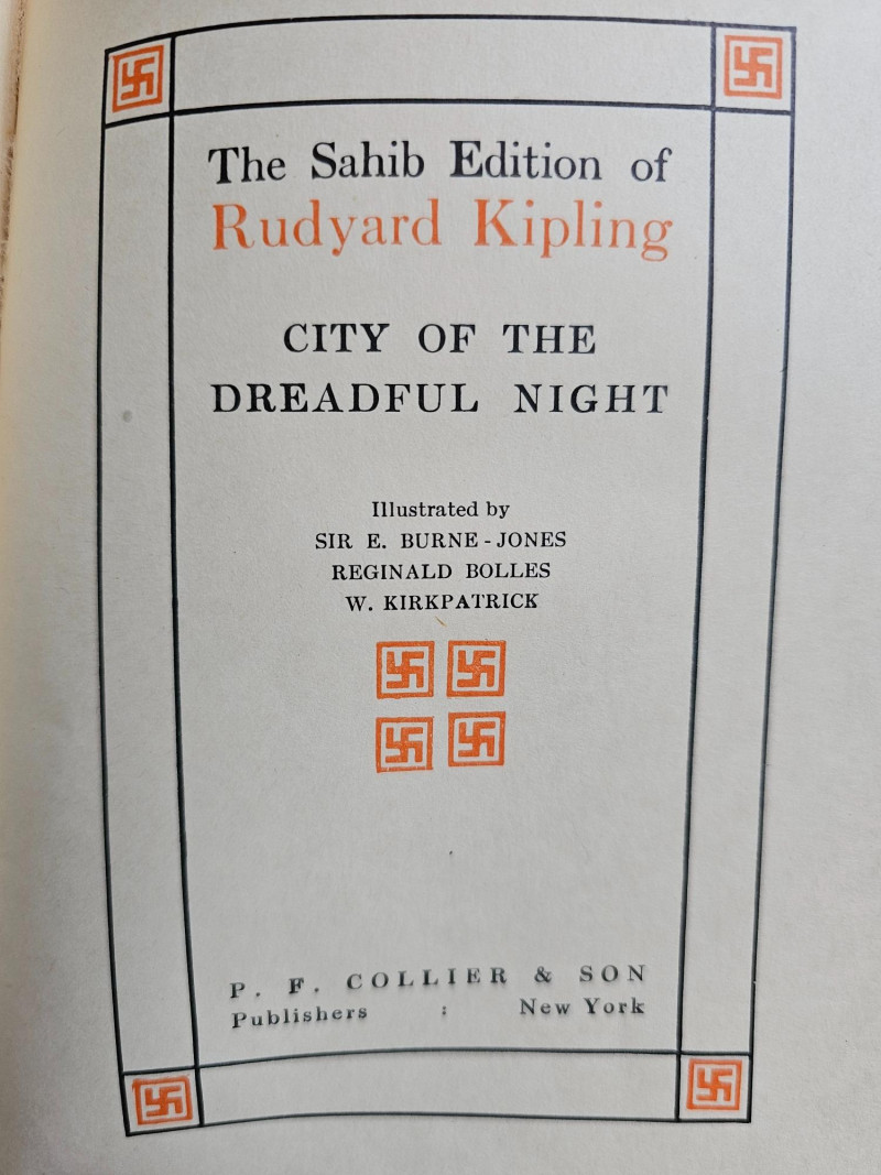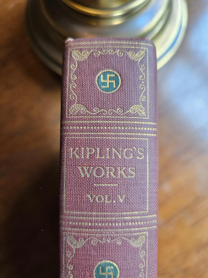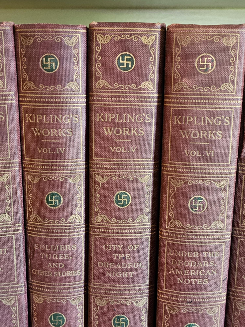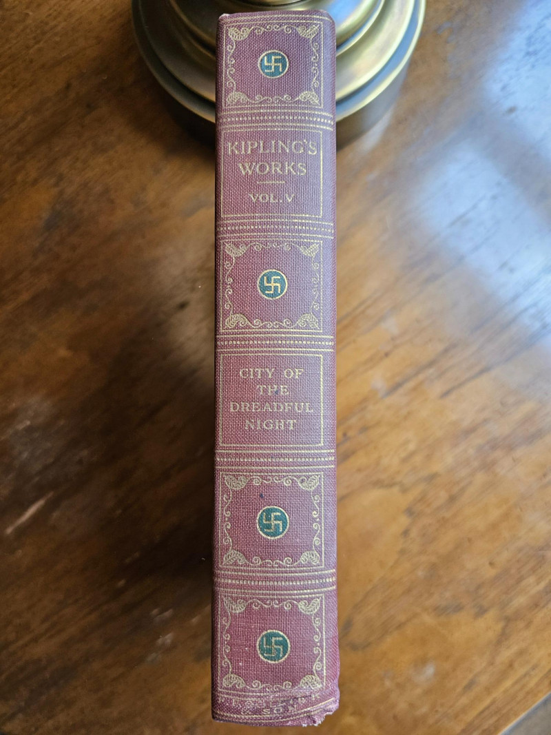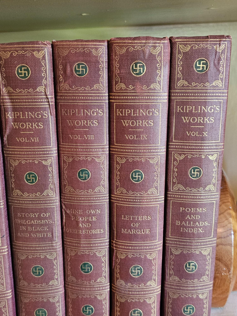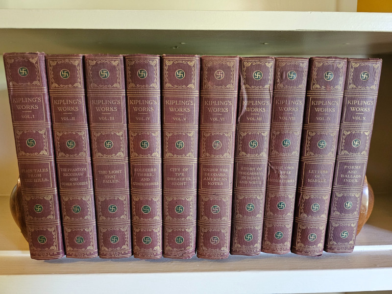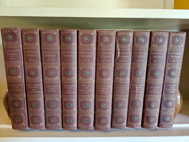 Complete 10 Volume Sahib Edition Of Kipling's Works The Sahib Edition of Rudyard Kipling Published by P.F. Collier & Son New York The Sahib Edition is also known as the Swastika edition because it features swastikas (the ancient symbol, NOT related to the Nazi usage) on the spine and title page. This edition was published around 1909. Rudyard Kipling (1865-1936) was a Nobel Prize-winning English author known for works like "The Jungle Book" and "Kim". Included is Volumes I - X Volume I: Plain Tales From The Hills Volume II: The Phantom Rickshaw And Other Stories Volume III: The Light That Failed Volume IV: Soldiers Three And Other Stories Volume V: City Of The Dreadful Night Volume VI: Under The Deodars, American Notes Volume VII: Story Of The Gadsbys, In Black And White Volume VIII: Mine Own People And Other Stories Volume IX: Letters Of Marque Volume X: Poems And Ballads, Index Books show some wear to the spines and covers indicative of age. Gold lettering on spines is intact but faded on volumes, pages appear clear and text is crisp. This collection is in pretty nice condition especially for its age. Shelf kept and proudly displayed, these books would make a nice edition to a classic library.