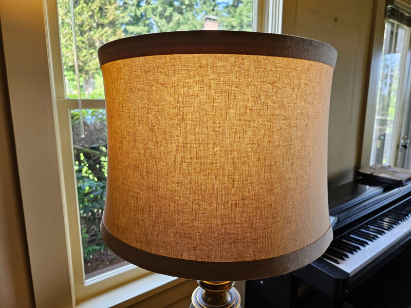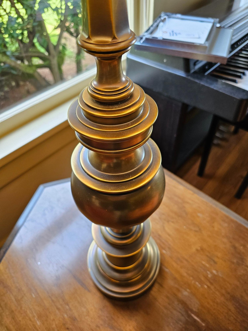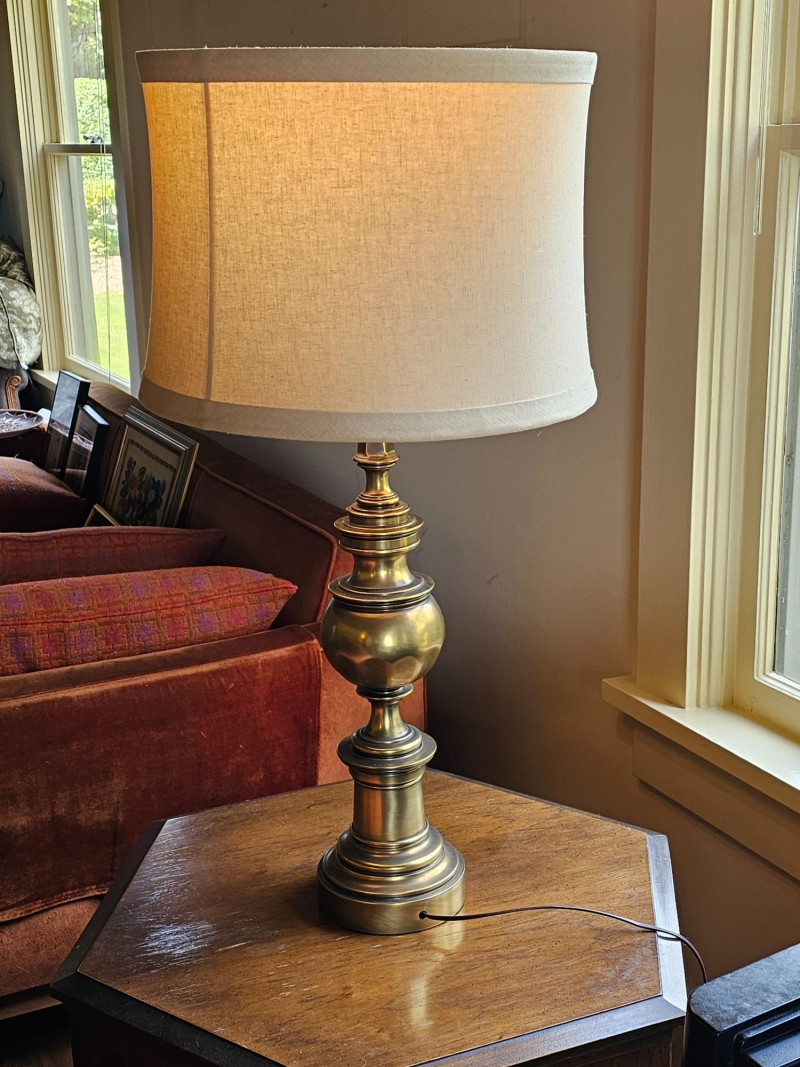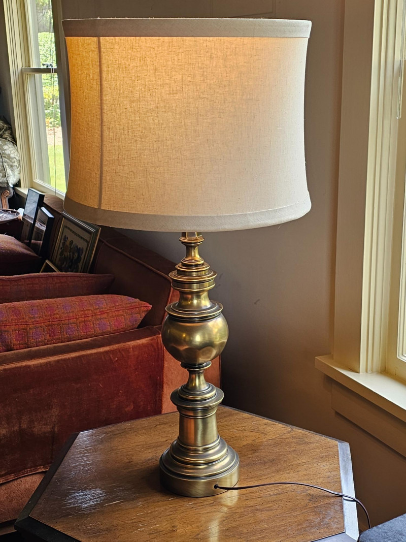 MCM Brass Table Lamp Substantial MCM table lamp with drum shade Gorgeous examples of a heavy brass table lamp to complete your Mid Century Modern look! Tested - Works! 33.5"T x 16.5"W (at lampshade)