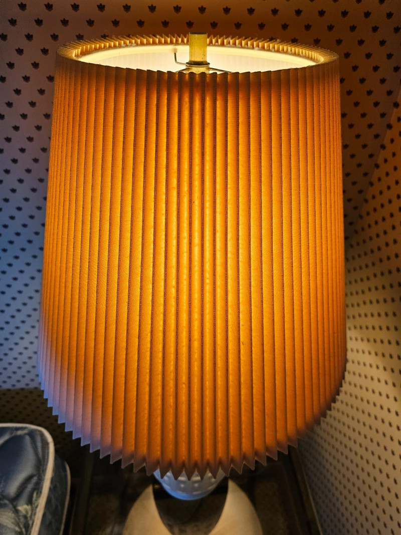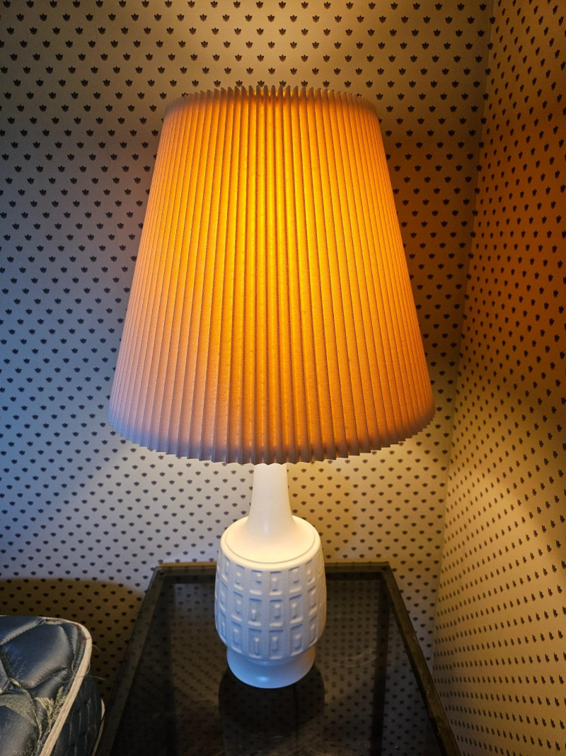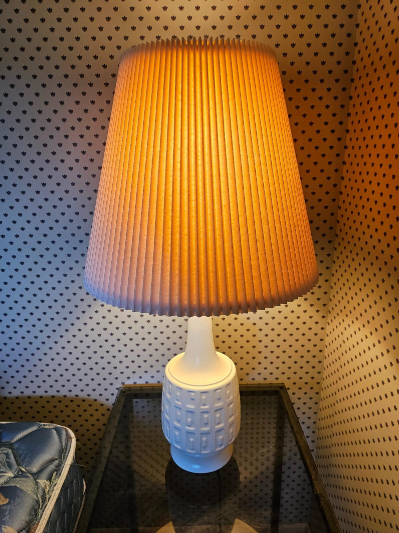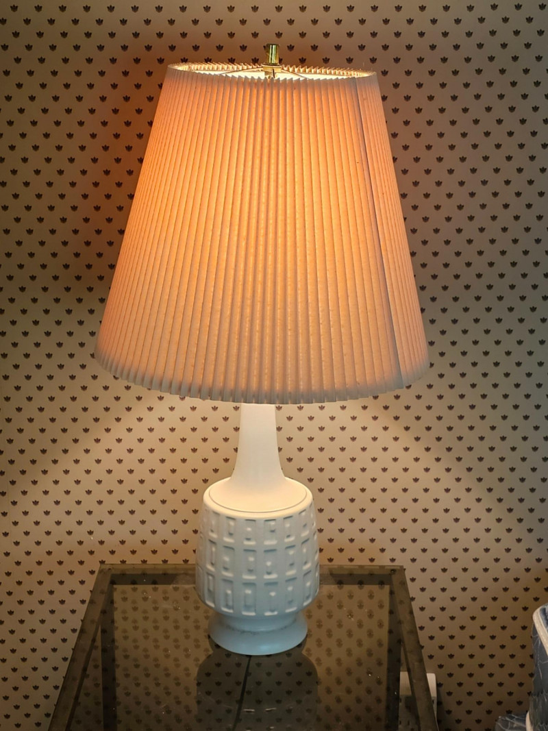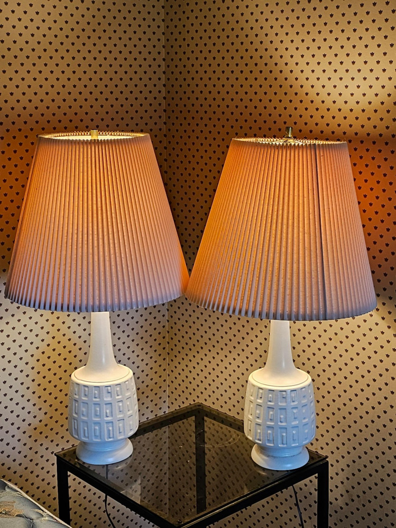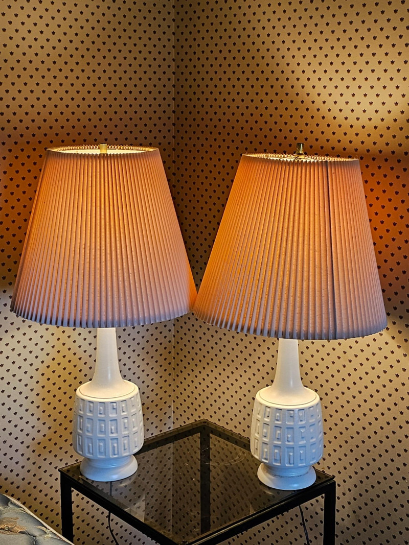 Pair Of White MCM Table Lamps Beautiful pair of white ceramic Mid Century Modern table lamps Whether used on a bedside table, end table, or anywhere else these lamps exudes style from decades past. Clean and relevant design with the crisp white ceramic color fits into any decor style Even the pleated shades are in nice condition! Tested - Both Work! 30"T x 16.5"W (width of pleated shade)