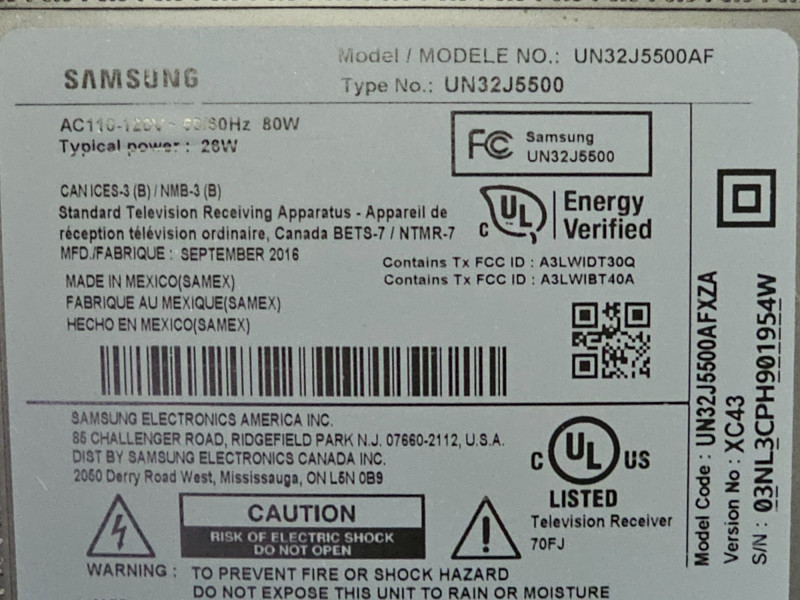 Samsung 32" LED 1080p Smart HDTV Samsung Model #UN32J5500AF Mfg September 2016 Includes power cord & stand (no remote) In good condition! Tested - Works! 18.5"T x 28.25"W