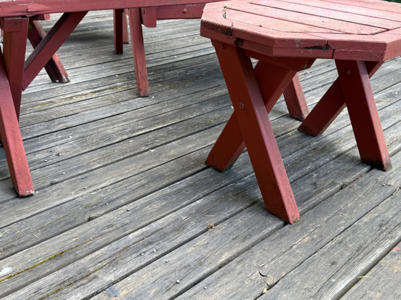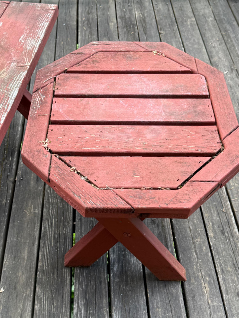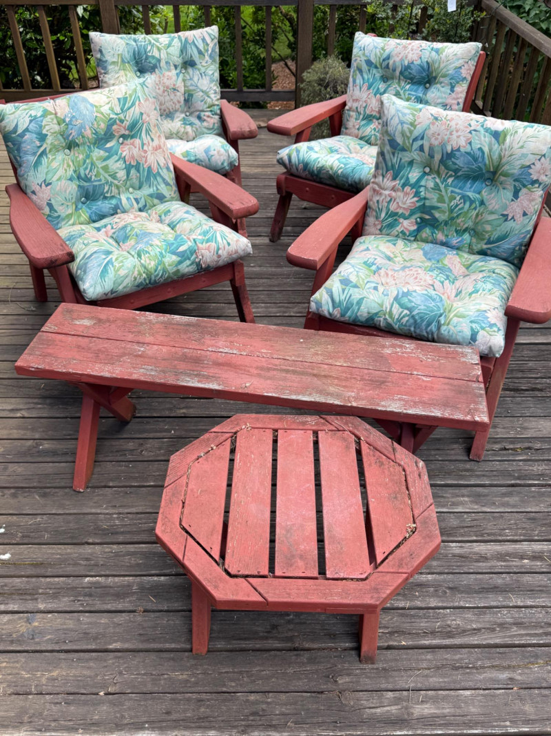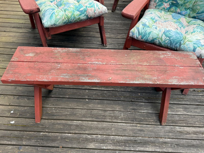 10 Piece Outdoor Seating Set Chairs measure 31”x30”x31” 3 Chairs, one rocker, one side table One bench 45”x11”x16.5”