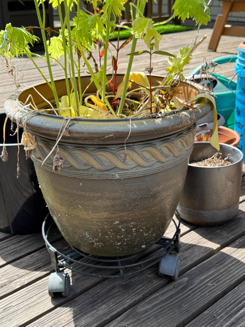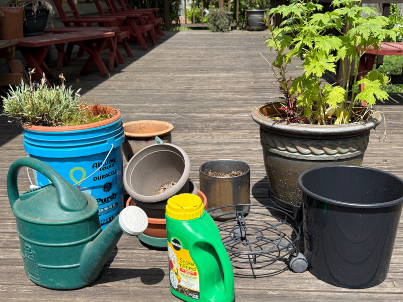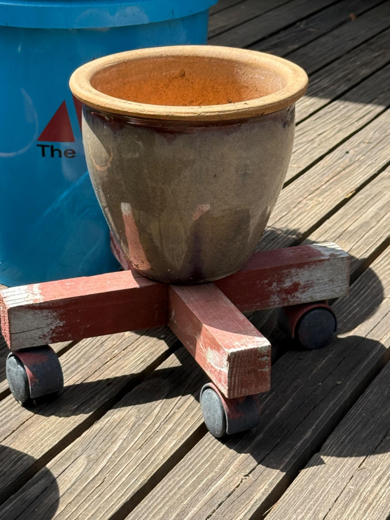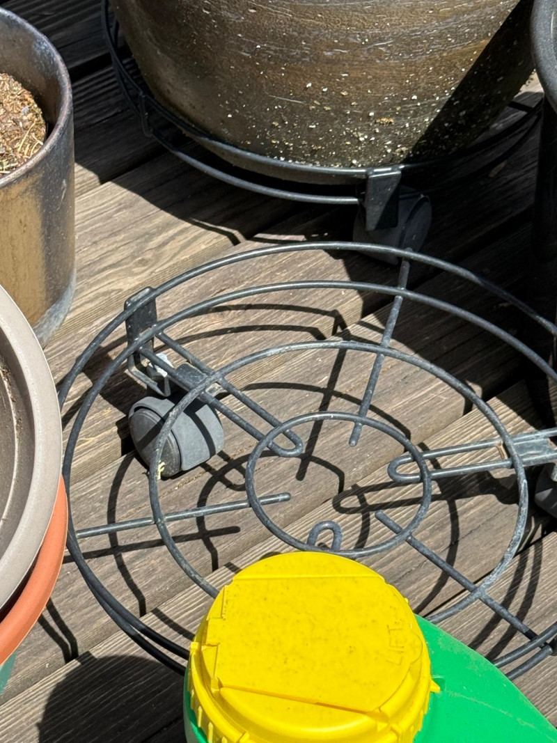 3 rolling plant bases. Watering can, bucket and plants
