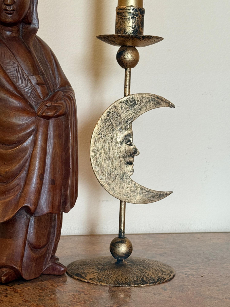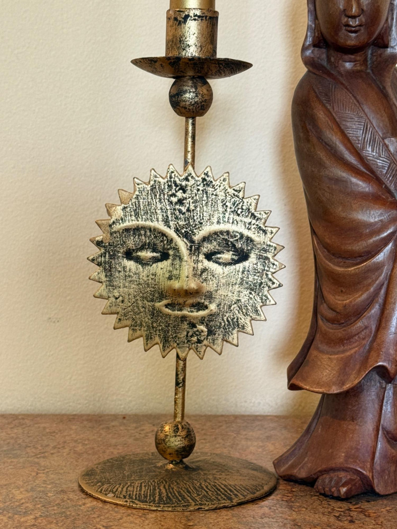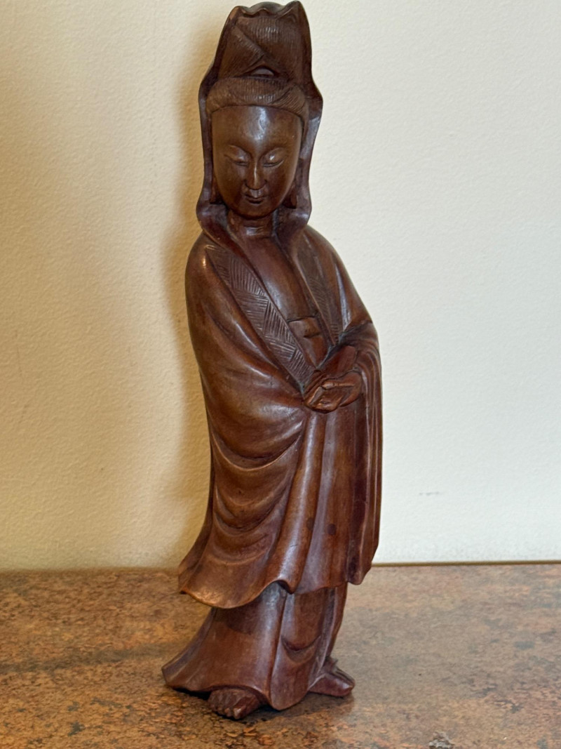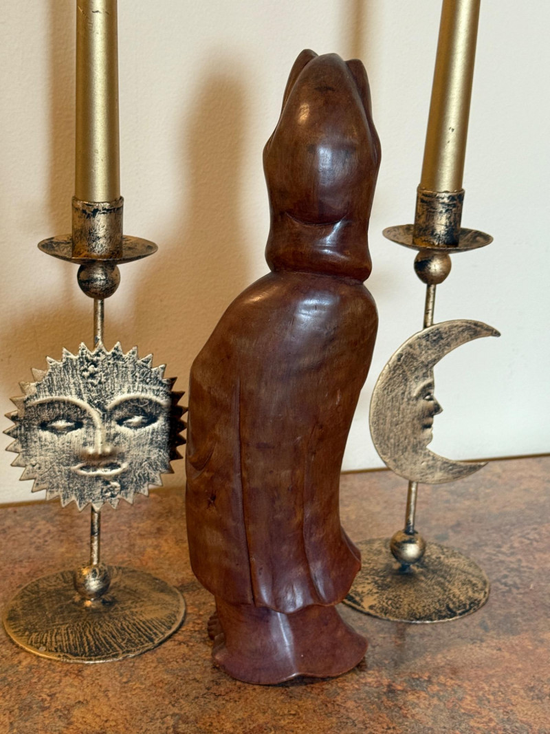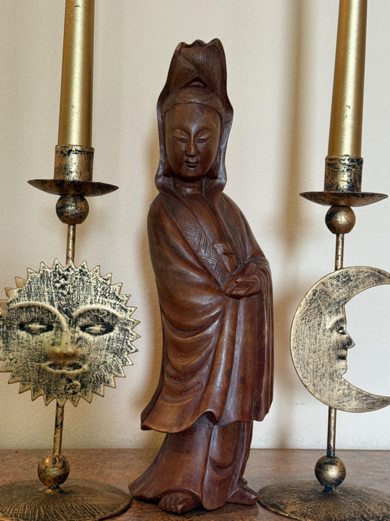 Wooden Guan Yin Carving With Candleholders. Stands 12.5” tall Guan Yin, the East Asian goddess of mercy and compassion, sometimes known as the Buddhist Madonna Worshippers petition her for help in times of uncertainty, despair, and fear, and to gain karmic merit, dispel sickness, aid in childbearing, or benefit ancestors.