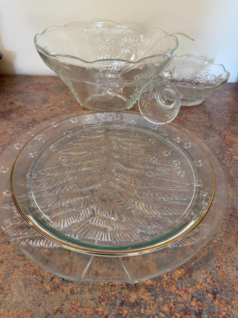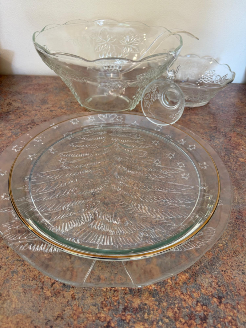 Vintage Punch Set with bowl, 10 cups and hangers, and smaller matching bowl. 15” Tree with Stars stamped platter 13” Eddie Bauer Tree Platter with gold rim.