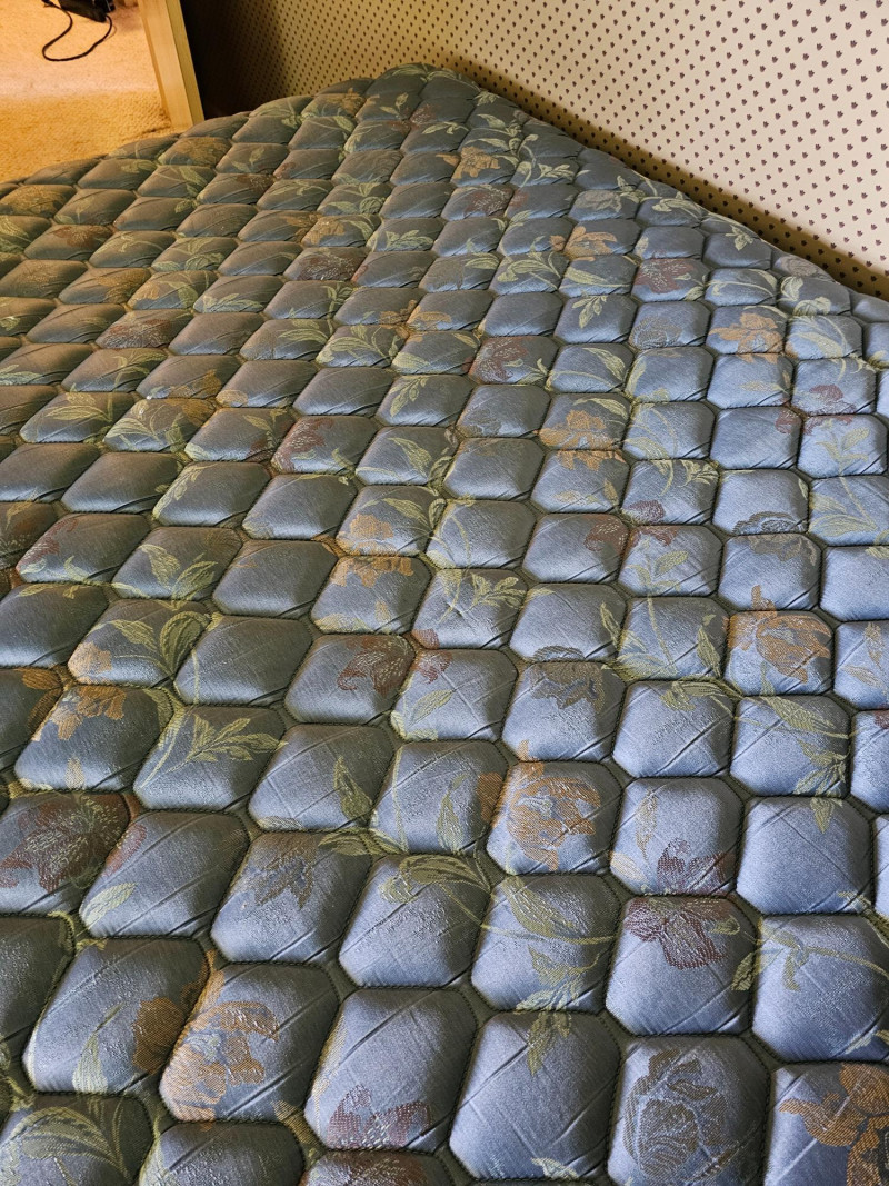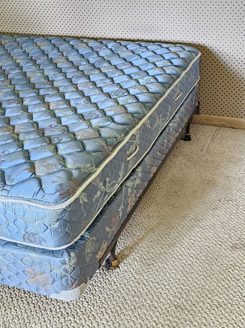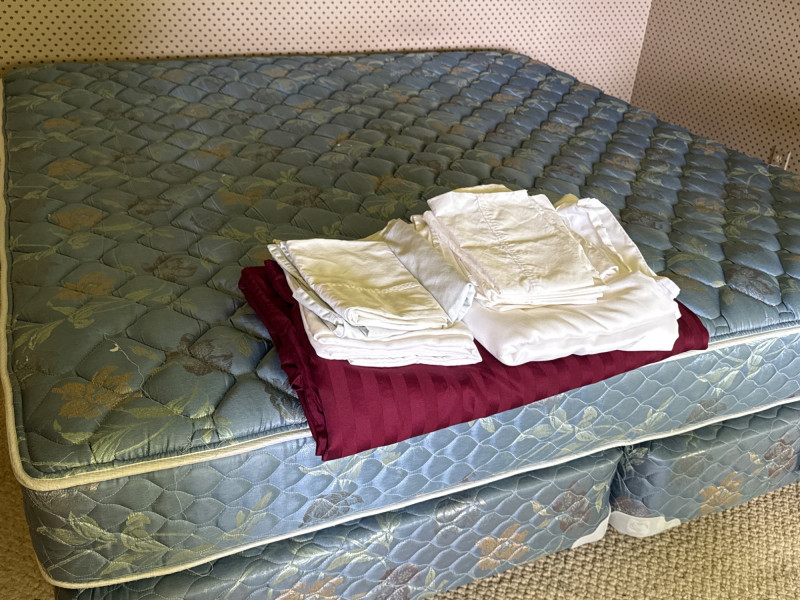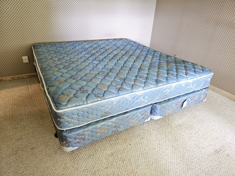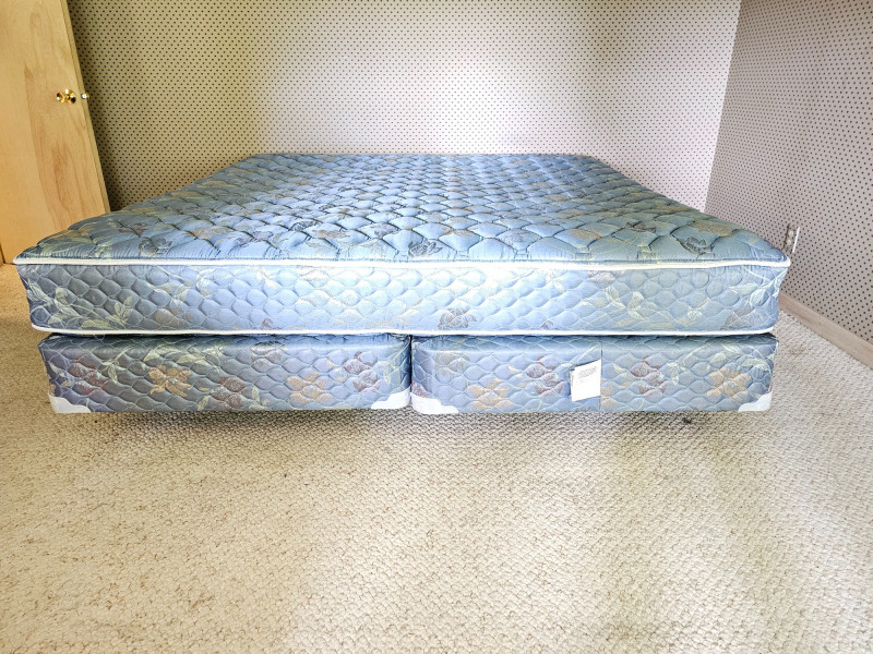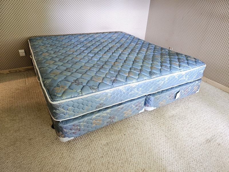 King Size Bed With Basic Metal Frame Mattress, both box springs & frame included Box spring & mattress appear to be in good condition and unstained. White sheet set and burgundy stripe cotton duvet cover included.