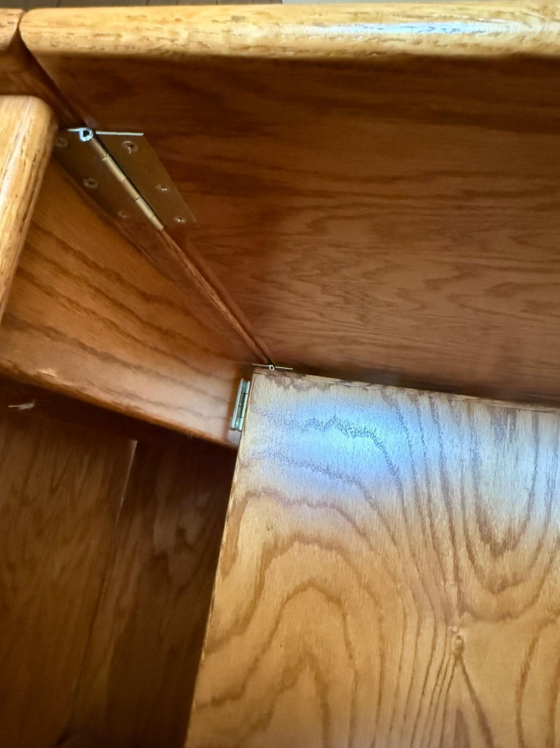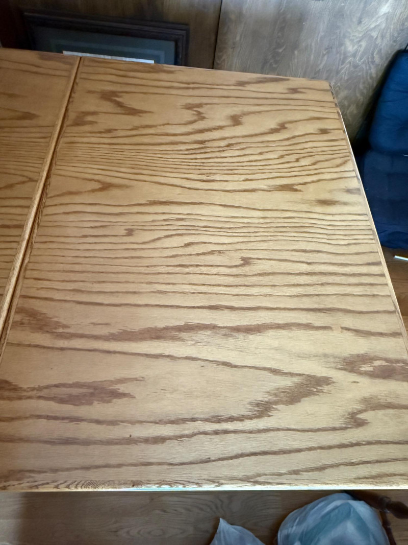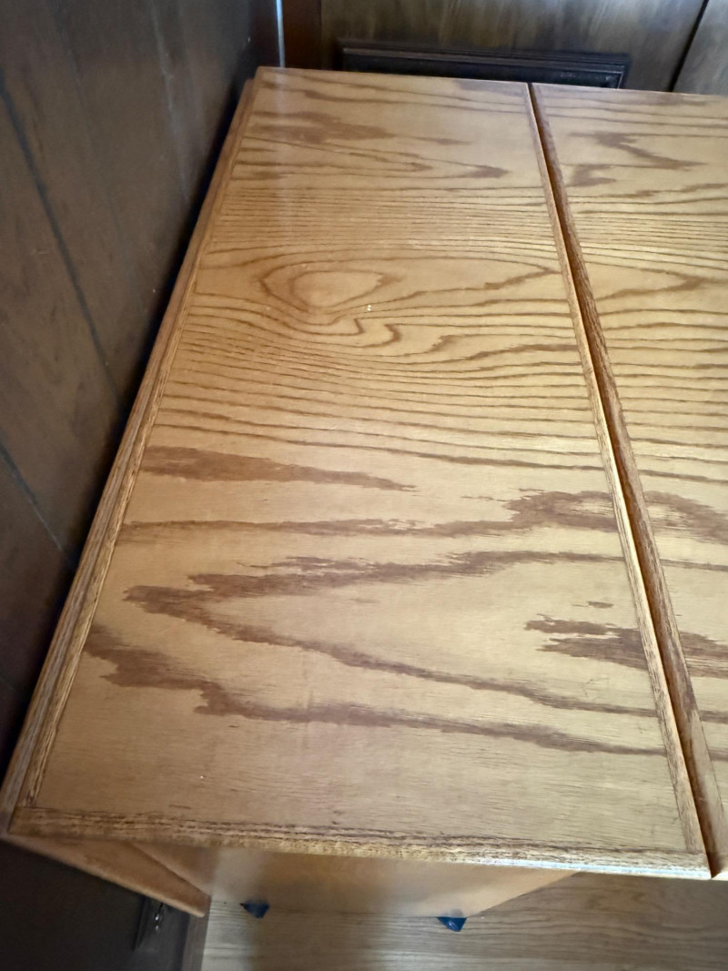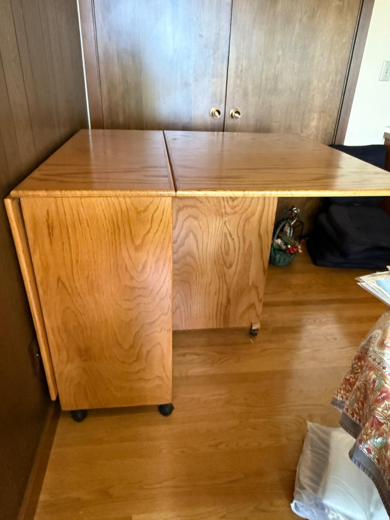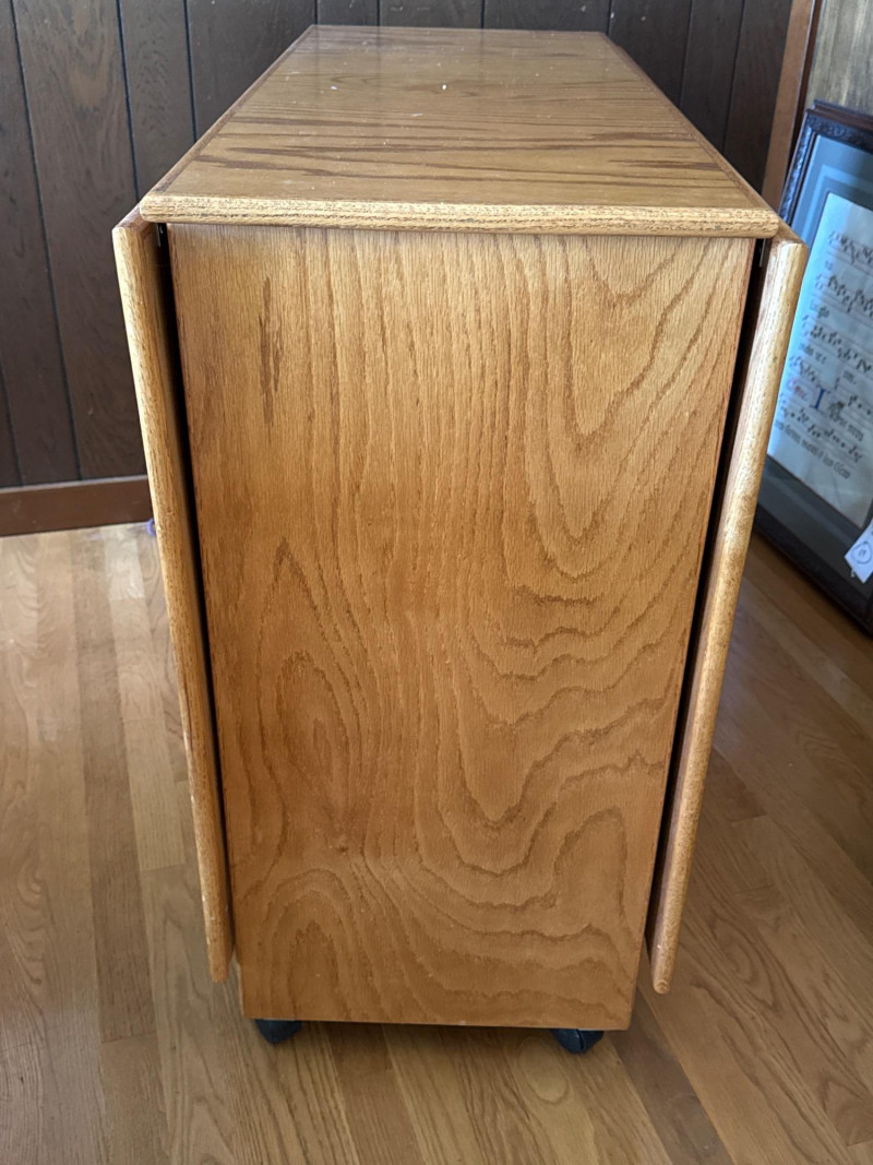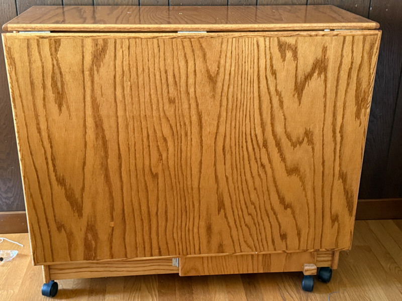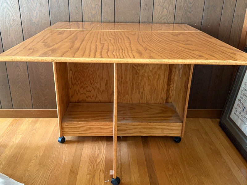 Rolling folding oak table is 16”x40” with 2 sides that lift for a total of 72” length with casters. Very good condition.